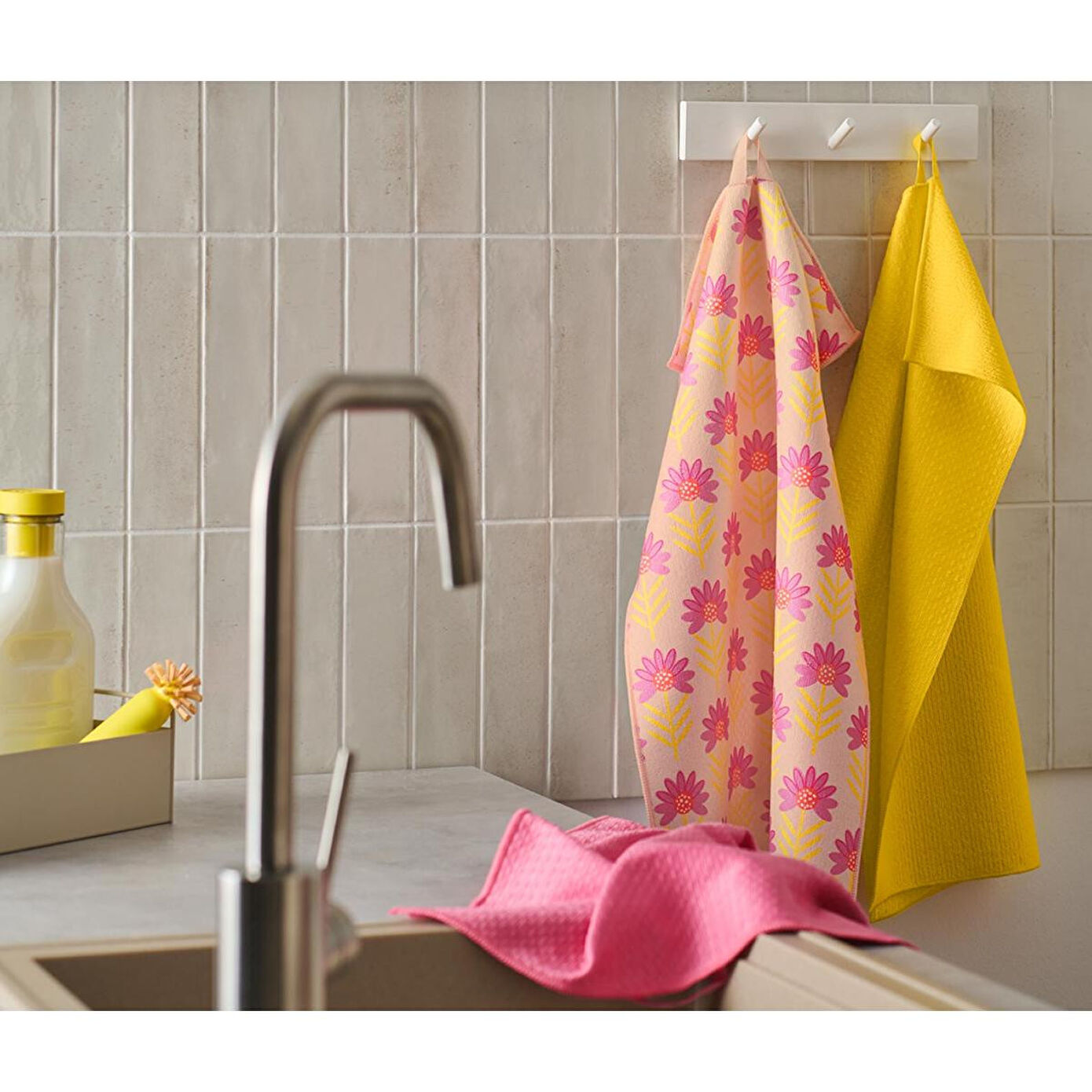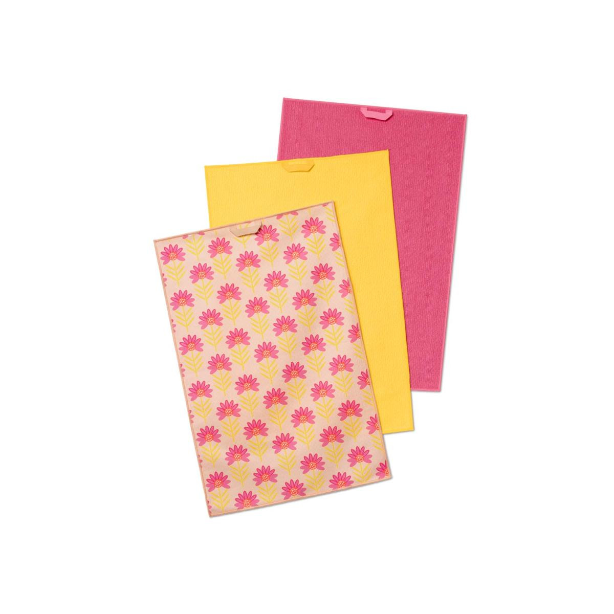 3 Adet Kurulama Bezi Renk: 1 adet açık pembe, 1 adet koyu pembe, 1 adet sarı Malzeme: %88 polyester, %12 poliamid Ölçüler: Her biri yakl.; 40 x 60 cm Emicidir ve çabuk kurur|Cam ve çatal-bıçak için son derece uygun|Uzun ömürlüdür ve iplik bırakmaz|Ayna veya fayans gibi çeşitli yüzeyleri kurutmak için de idealdir