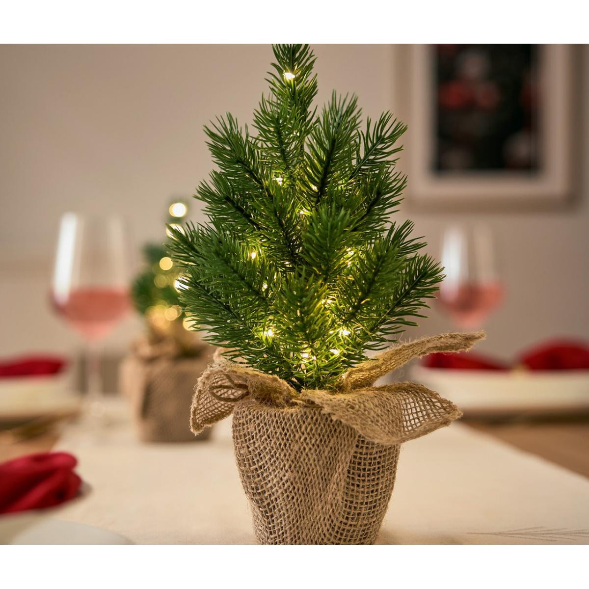 LED Çam Ağacı, orta Küçük yılbaşı dekorasyonu için ideal 30 adet LED'li – ışık rengi sıcak beyaz Zamanlayıcı fonksiyonu: 6 saat sonra otomatik kapanır, 18 saat sonra tekrar açılır Pille çalışır – isteğe göre ve kolayca yerleştirilebilir Piller dahildir Jüt kaplı sağlam kaide Zararlı madde kontrolü yapılmıştır – harici, akredite kuruluşlar tarafından Renk Suni çam yeşil Jüt kaplama kahverengi Malzeme Plastik ve jüt Ölçüler G x Y x D yakl. 13 x 30 x 13 cm İçerik 2 adet LR03 (AAA) pil ve kullanma kılavuzu dahildir Pil/Akü Çalışma Süresi 1 set pille çalışma süresi yakl. 230 saat
