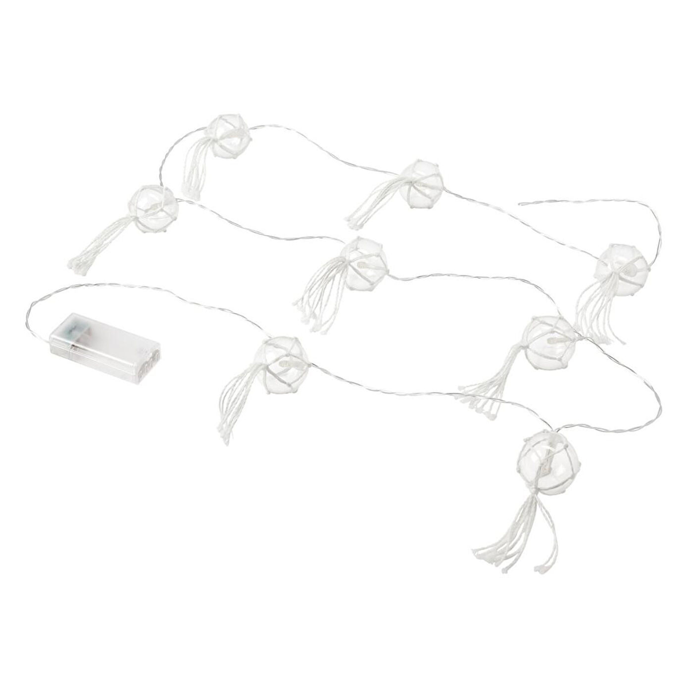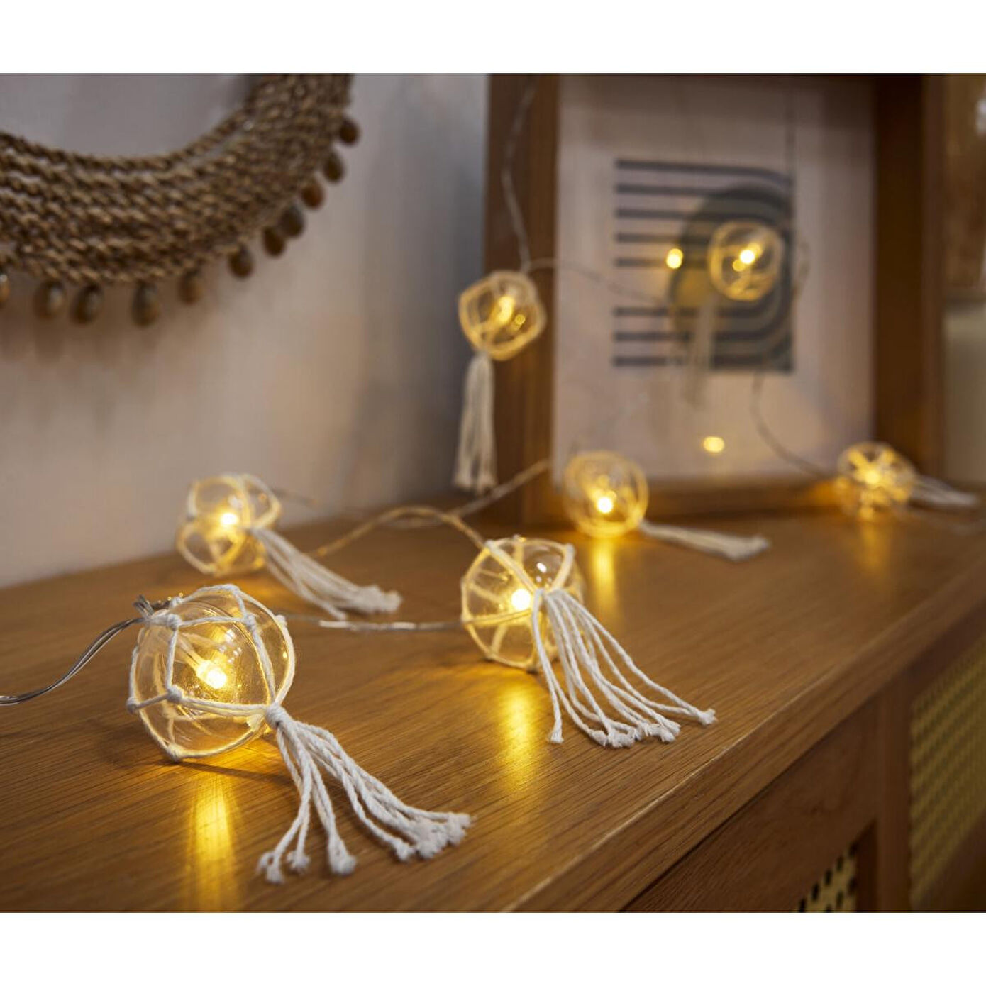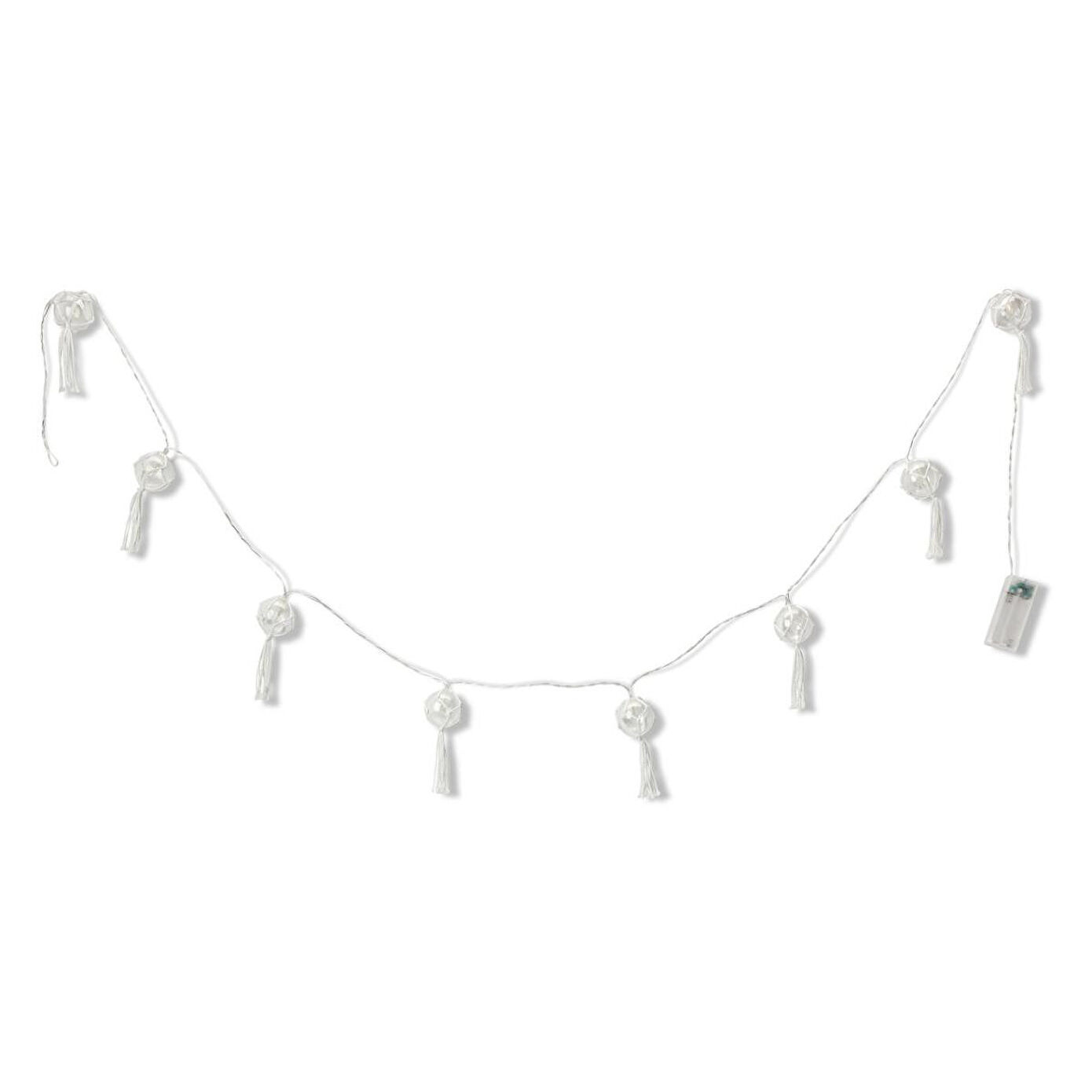 8 LED'li, trend makrome tarzı Ev için Boho görünümlü Pille çalışır – isteğe göre ve kolayca asılabilir Zamanlayıcı fonksiyonu: 6 saat sonra otomatik kapanır, 18 saat sonra tekrar açılır İç mekanlar için Zararlı madde kontrolü yapılmıştır – harici, akredite kuruluşlar tarafından İçerik Renk Küreler şeffaf Kumaş beyaz Malzeme Küreler ve pil haznesi plastik Ölçüler Uzunluğu yakl. 190 cm Bilyelerin çapı yakl. 4 cm Elektrik kablosunun uzunluğu yakl. 30 cm Bilyeler arası mesafe yakl. 20 cm İçerik 2 adet LR06 (AA) pil ve kullanma kılavuzu ile birlikte Pil/Akü Çalışma Süresi 1 set pille aydınlatma süresi yakl. 200 saat