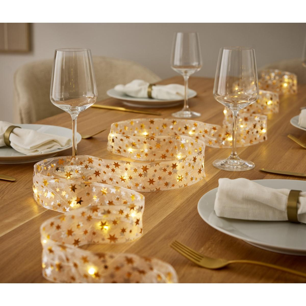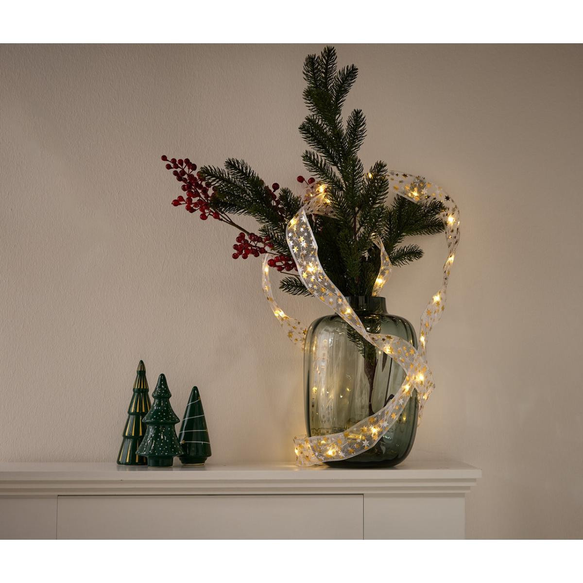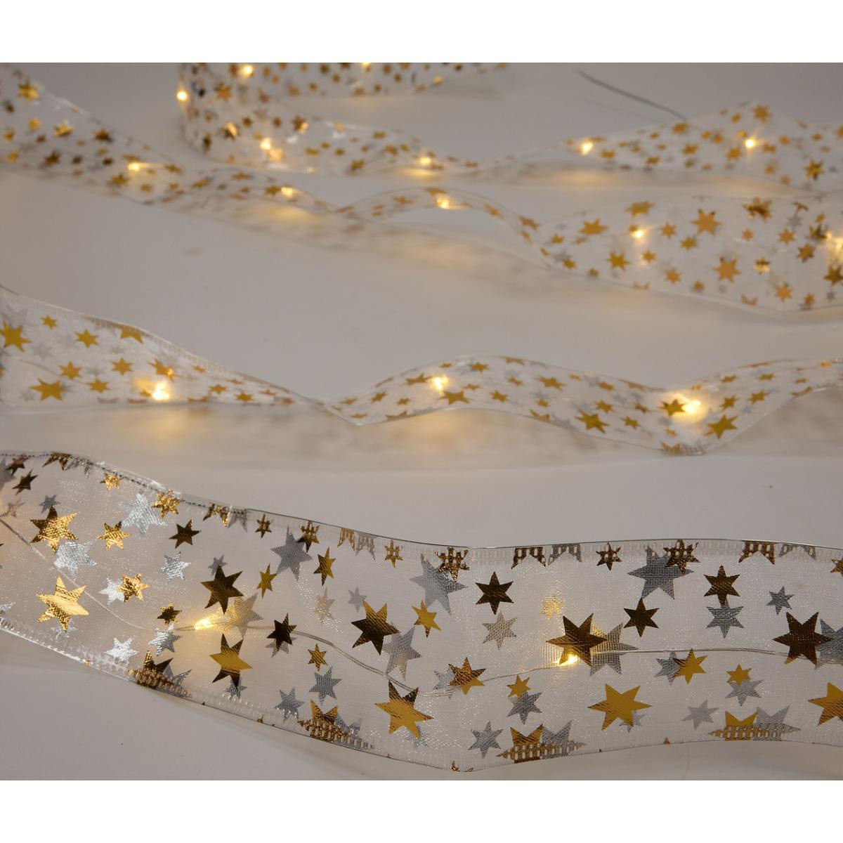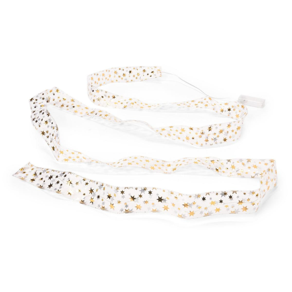 LED'li Dekoratif Bant Pille çalışır – istendiği gibi ve çok yönlü dekore edilebilir İçine işlenmiş bükülebilir telli organze dekoratif kurdele – isteğe göre şekillendirilebilir dekorasyon 360 adet LED – ışık rengi sıcak beyaz Zamanlayıcı fonksiyonlu: 6 saat sonra otomatik kapanır, 18 saat sonra tekrar açılır Uzunluğu yakl. 3 metre Piller dahildir Zararlı madde kontrolü yapılmıştır – harici, akredite kuruluşlar tarafından Renk Altın rengi yıldızlı kırık beyaz Pil bölmesine giden elektrik kablosu saydam Malzeme %100 poliamid Ölçüler Uzunluğu yakl. 300 cm Genişlik yakl. 5 cm Elektrik kablosunun uzunluğu yakl. 30 cm İçerik 2 adet LR06 (AA) pil ve kullanma kılavuzu dahildir Pil/Akü Çalışma Süresi 1 set pille aydınlatma süresi yakl. 230 saat