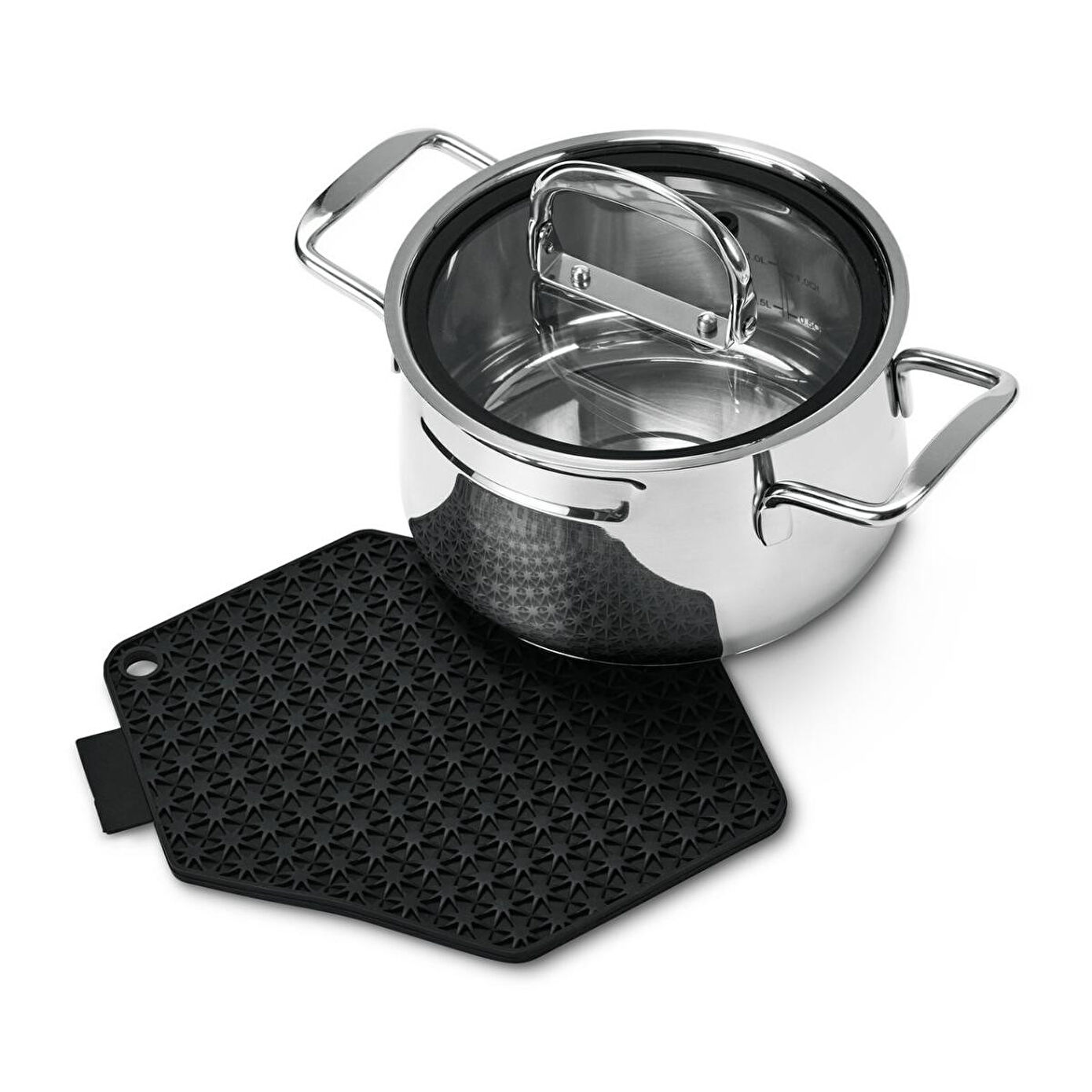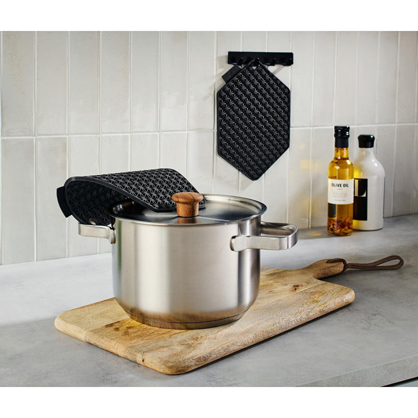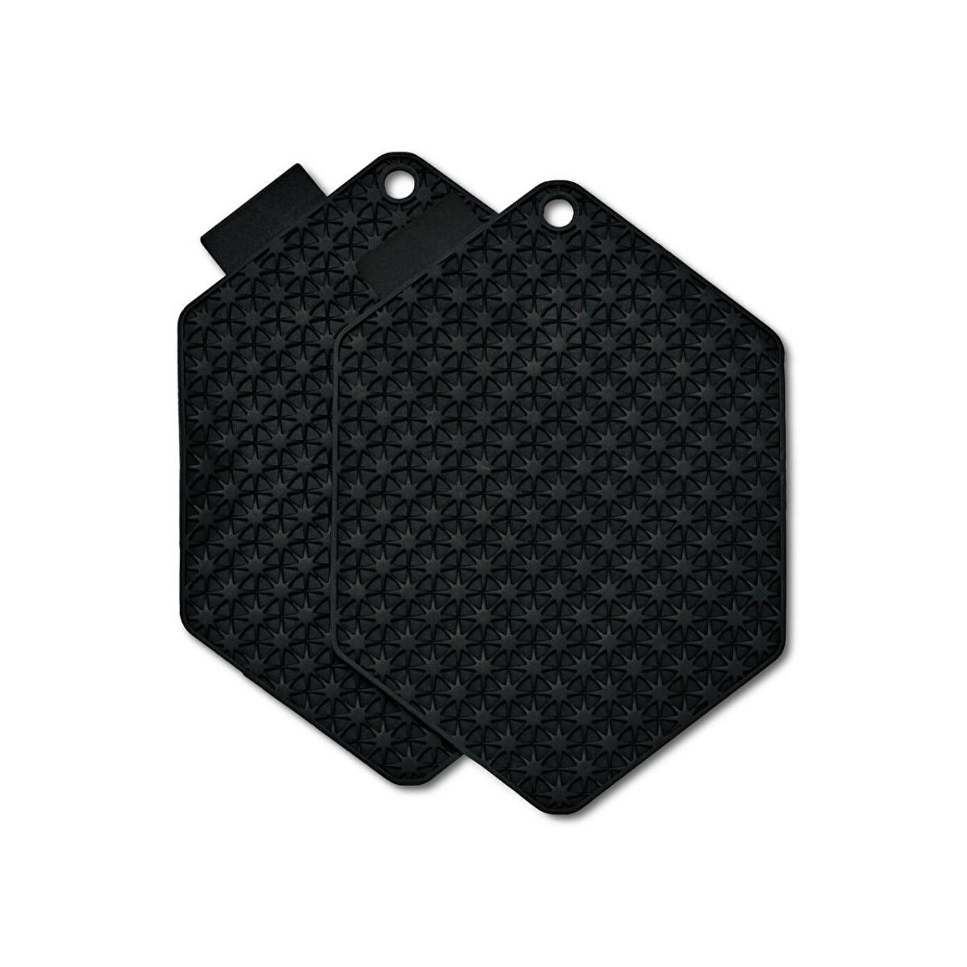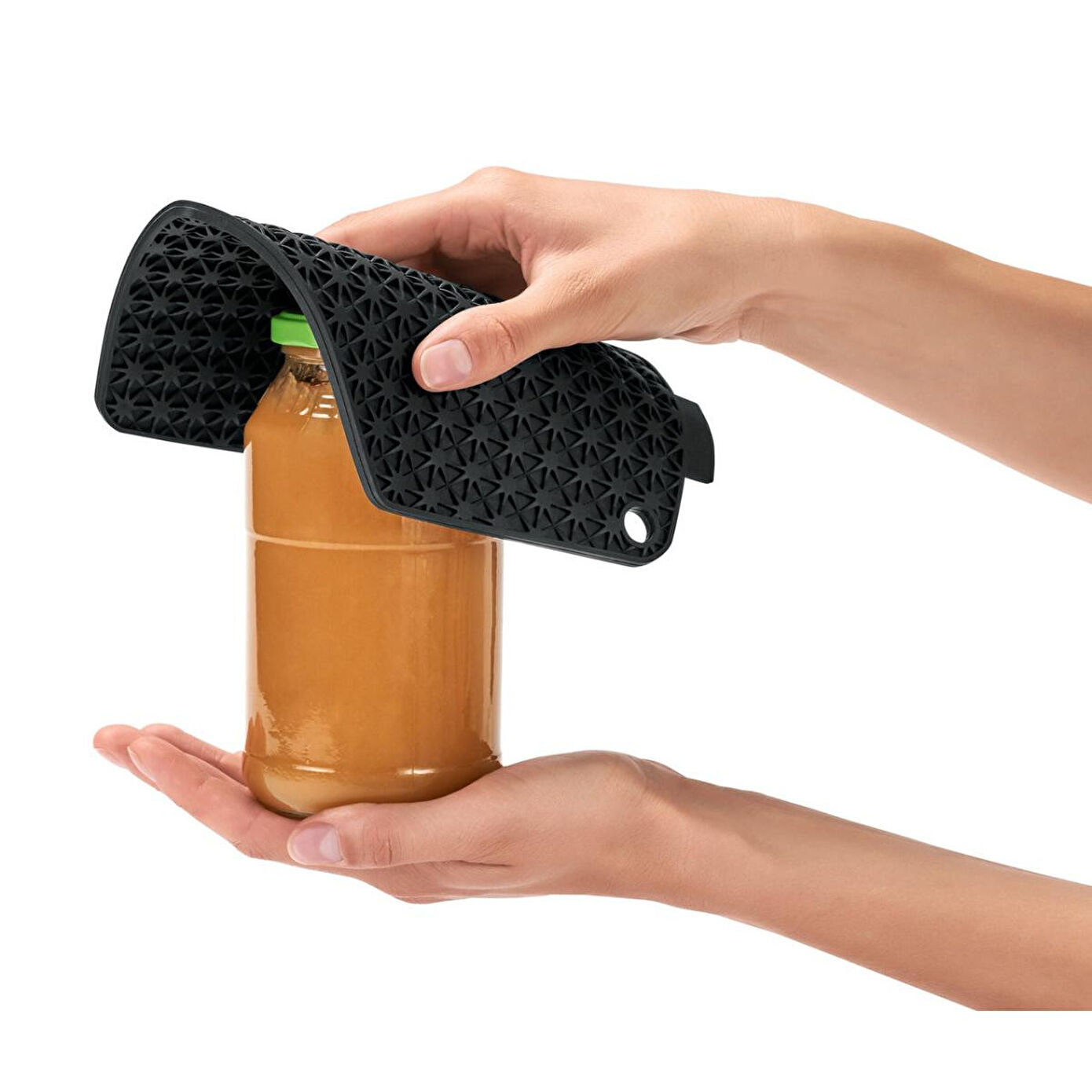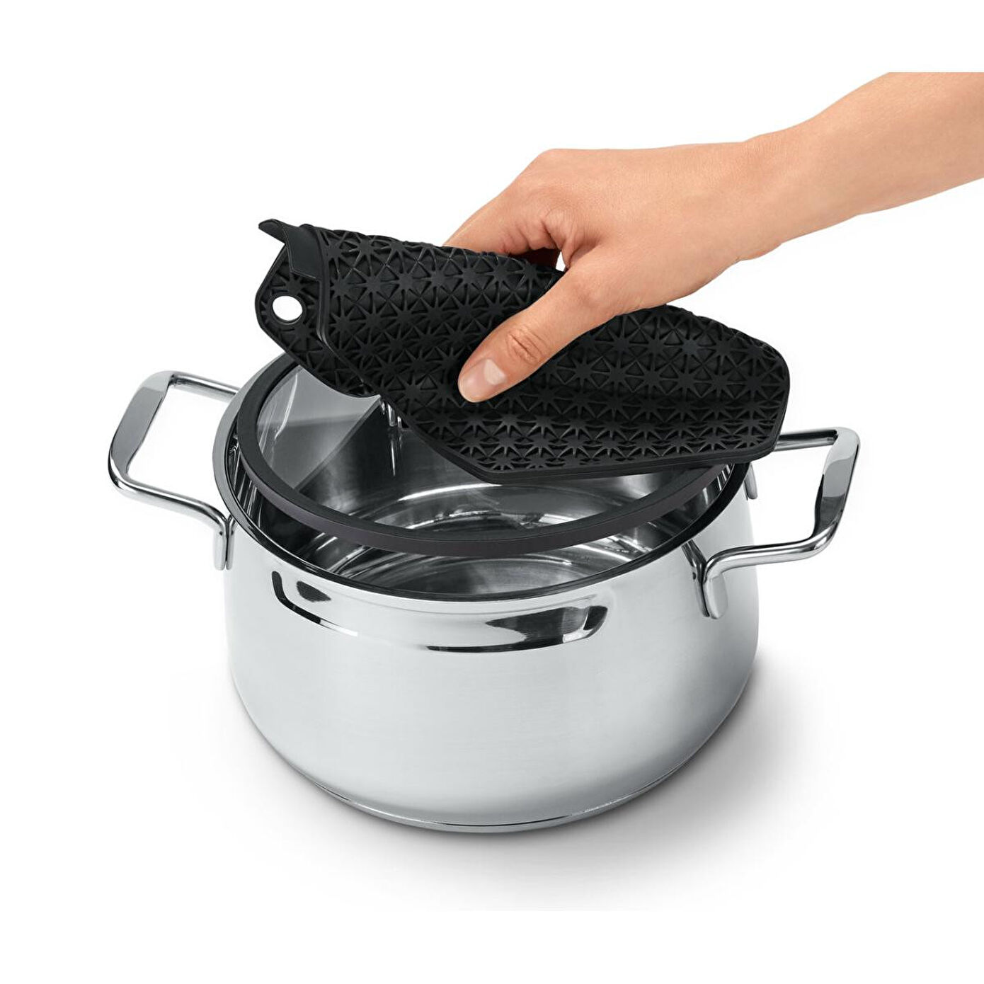 3'ü 1 Arada Mutfak Yardımcısı Renk: Siyah Malzeme: %100 silikon Ölçüler: Her biri yakl. 24,5 x 17 cmMalzeme kalınlığı yakl. 6 mm Ağırlık: Her biri yakl. 88 g Kullanım Uyarıları: Sıcağa dayanıklılık: -30 °C ile 230 °C arası. Tencere tutacağı olarak 250 °C'ye kadar kısa süresi sıcak temasa uygundur Tencere tutacağı, nihale ve sıkışık kapaklar için açıcı|Son derece dayanıklı, esnek ve hijyenik|Güvenli tutuş için dokulu|Askılı