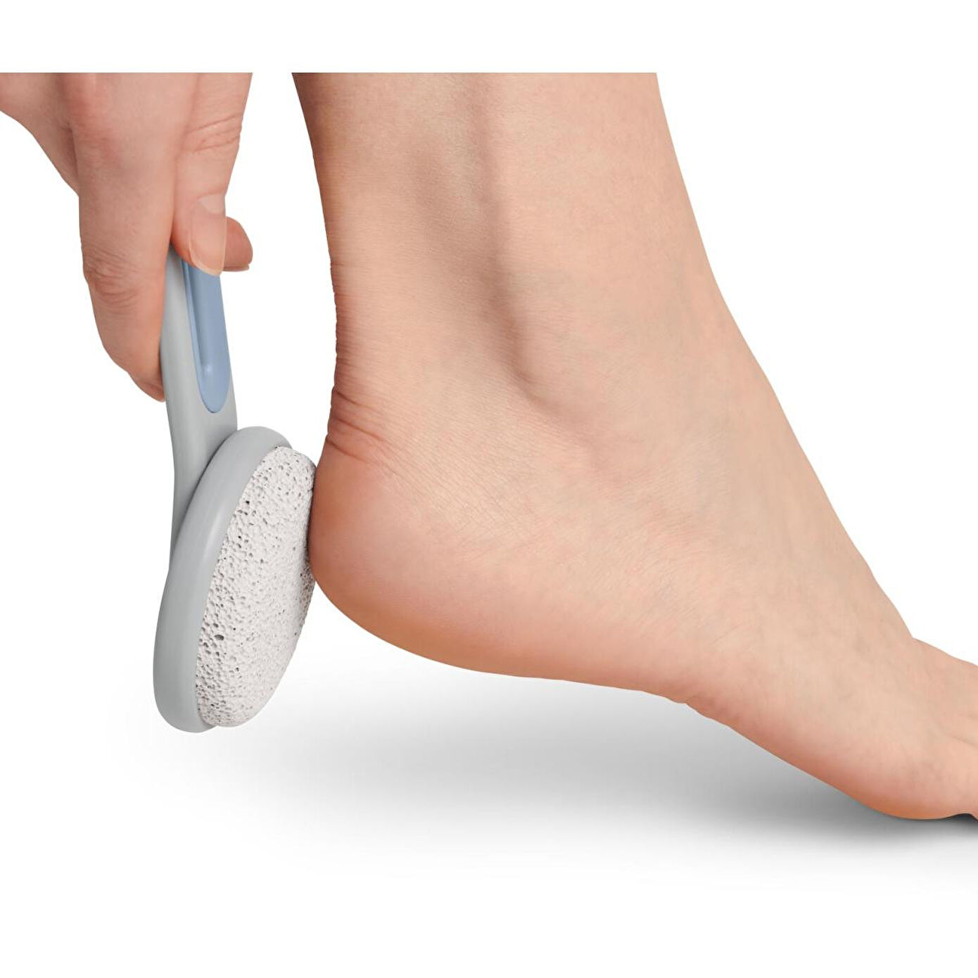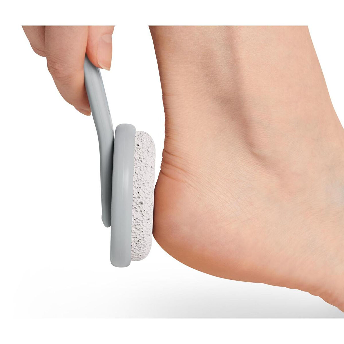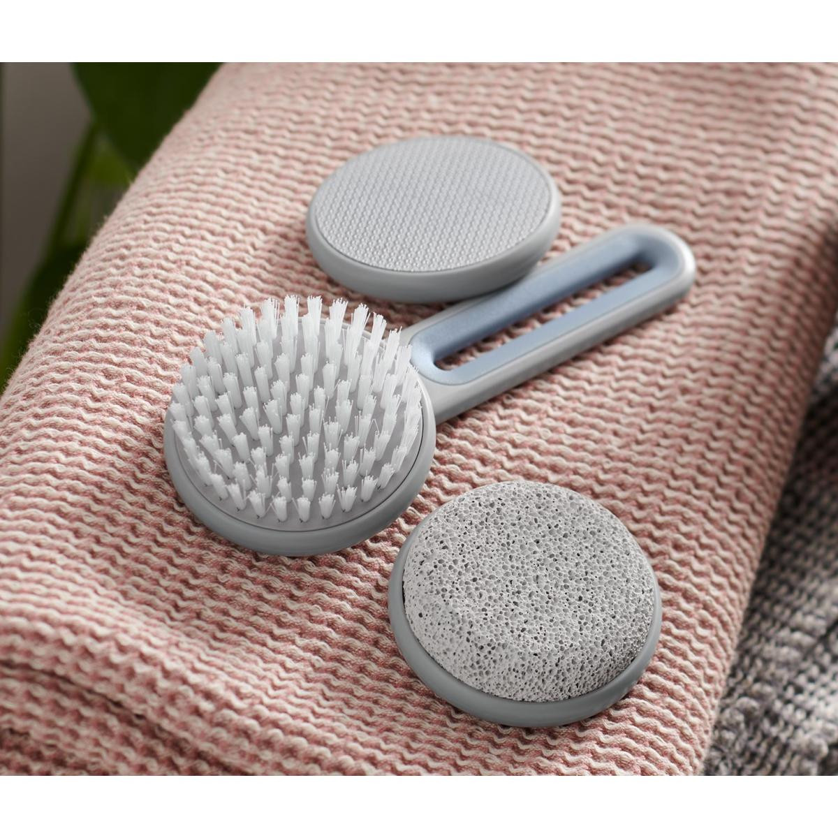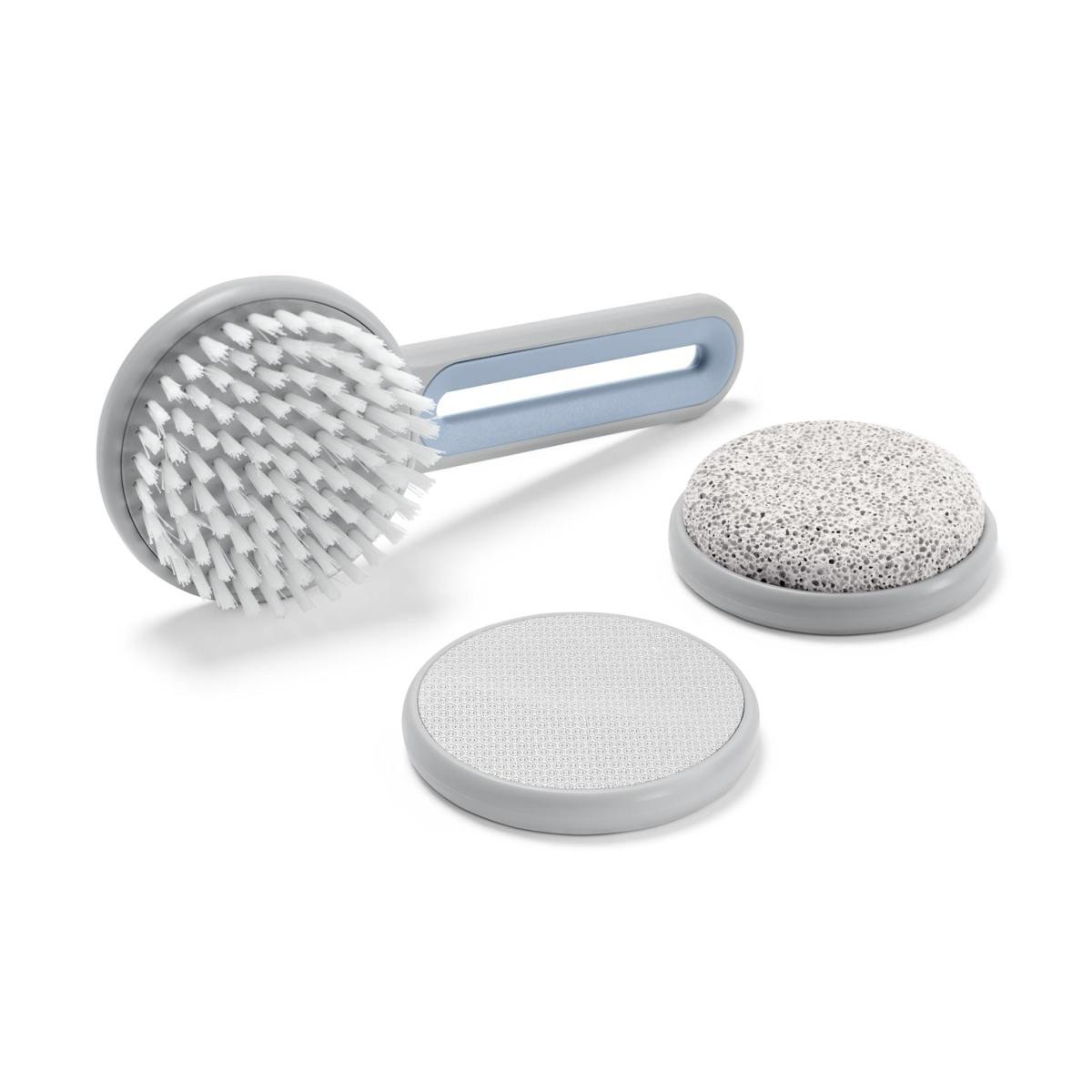 Pedikür Seti Renk: Mavi kontrastlı kırık beyaz Malzeme: Tutucu, sap ve başlık %50 akrilonitril bütadien stiren (geri dönüştürülmüş), %50 akrilonitril bütadien stirenFırça başlığı %100 polipropilenNasır sökücü başlığı %100 paslanmaz çelikPonza taşı başlık Ölçüler: Uzunluğu yakl.; 17,5 cmHer bir başlığın çapı yakl.; 7 cm İçerik/Aksesuar: 3 farklı yuvarlak başlık dahil (zımpara için ince taneli, ponza taşı, fırça) Ayakların bakımla rahatlaması için ideal |3 farklı başlıklı fırça|Nasır sökücü içeren bir başlık|Ponza taşı içeren bir başlık|Masaj etkisi için küçük fırça içeren bir başlık|Nasırlara karşı yardımcı olabilir |Çapı yakl.; 7 cm