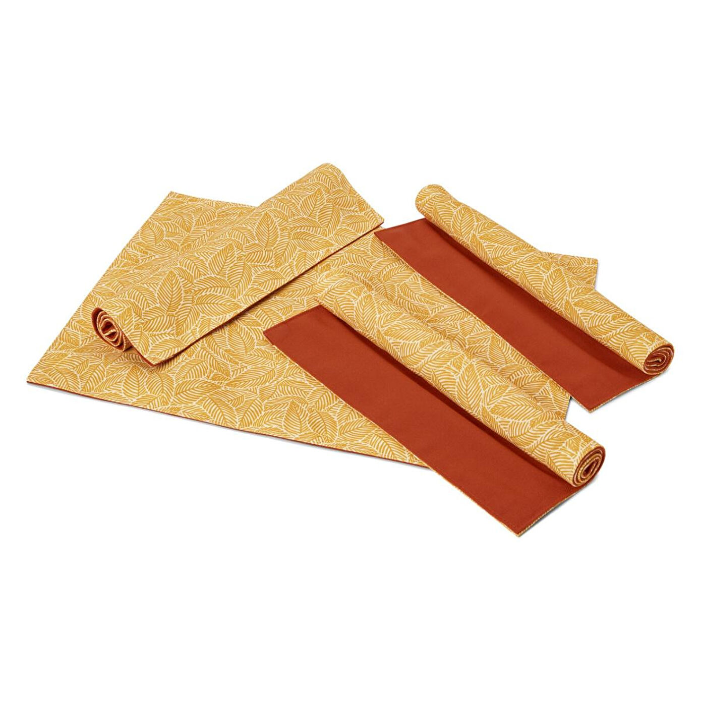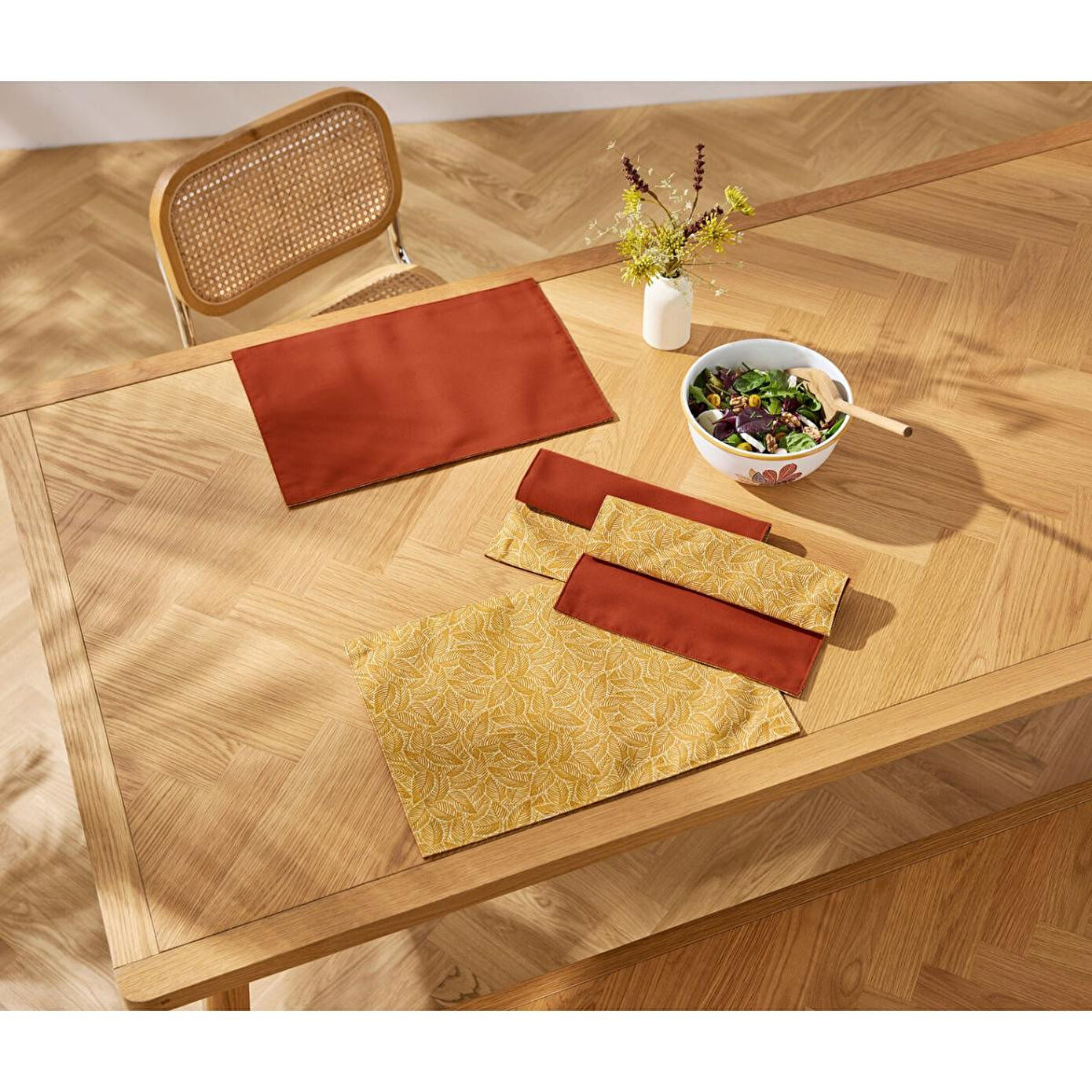 Çok yönlü kullanılabilir – bir yüzü tek renk ve bir yüzü baskılı Çift katlı işlenmiş Masa için dekoratif ve dikkat çekici Temizlenmesi oldukça kolaydır Her biri yakl. 33 x 48 cm Zararlı madde kontrolü yapılmıştır – harici, akredite kuruluşlar tarafından İçerik Renk 1 yüzü sarı üzerine yaprak baskılı, 1 yüzü kiremit rengi Malzeme %100 polyester Ölçüler Her biri yakl. 48 x 33 cm