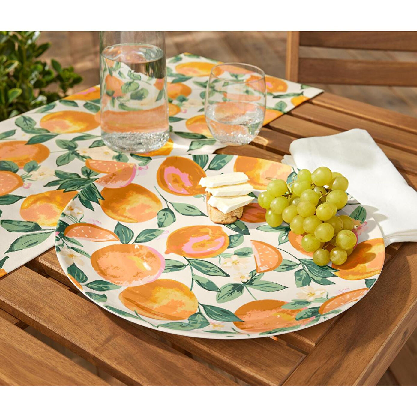 Servis Tabağı Renk: Beyaz üzeri portakal dekorlu Malzeme: %100 melamin Ölçüler: Çapı yakl. 34 cm, yüksekliği yakl. 2,5 cmMalzeme kalınlığı yakl. 2,5 mm, kenarı yakl 3,2 mm Ağırlık: Yakl. 500 g Kullanım Uyarıları: Bulaşık makinesinde 50 °C'ye kadar yıkanabilir Kırılmaya dayanıklı melaminden|Kaliteli, renkli dekorlu|Parlak görünümlü|Çap yakl. 34 cm