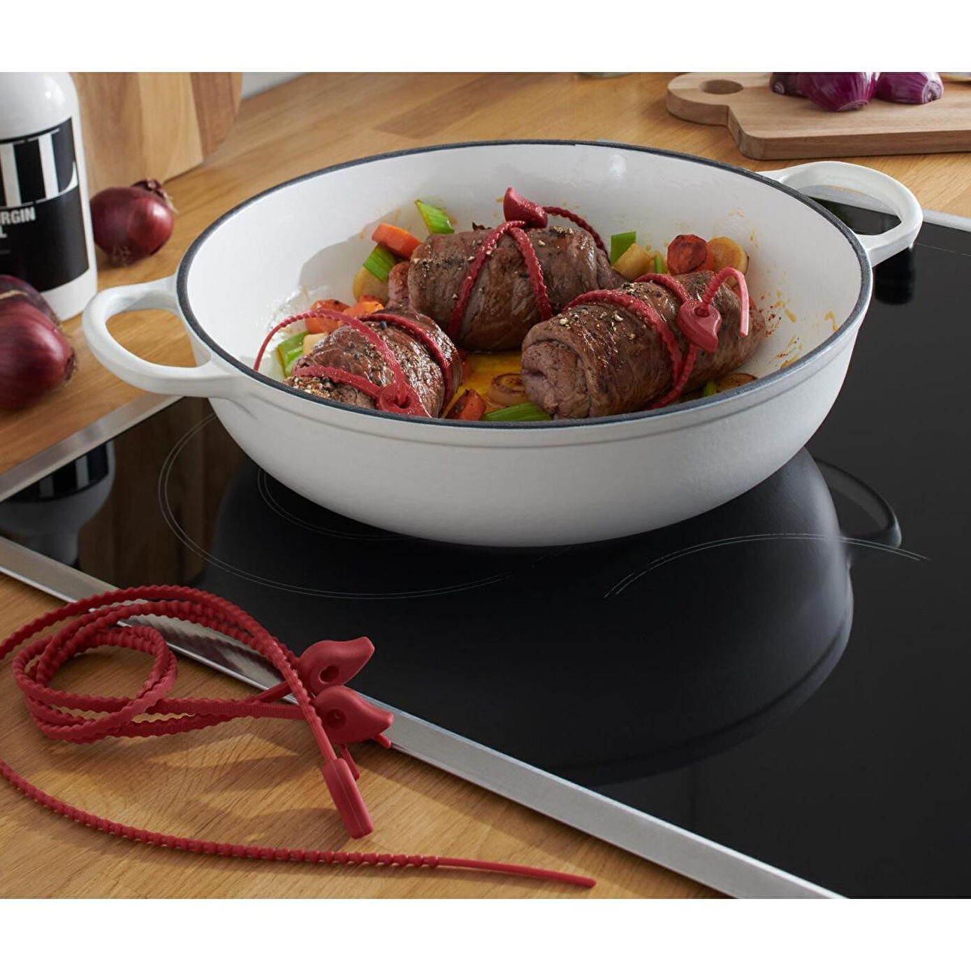 6 Adet Silikon Şerit Renk: Kırmızı Malzeme: %100 silikon Ölçüler: Her birinin uzunluğu yakl.; 54 cm İçerik/Aksesuar: Kullanma kılavuzu dahildir Ağırlık: Her biri yakl.; 11 g Kullanım Uyarıları: –23 °C ile +230 °C arası ısıya dayanıklıAçık alev üzerinde kullanılmamalıdır (kömür ızgarası vb.; )Tavalarda, fırınlarda, mikrodalgalarda ve dondurucularda kullanıma uygundur Rulolar, rulo kızartmalar, sebzeler vb.; için basit, güvenli sabitleme|Tekrar tekrar kullanılabilir – mutfak ipi ve şişlerin yerini alır|Kullanımı kolay: Yiyecekleri sarın, şeridi delikten geçirin ve sabitleyin