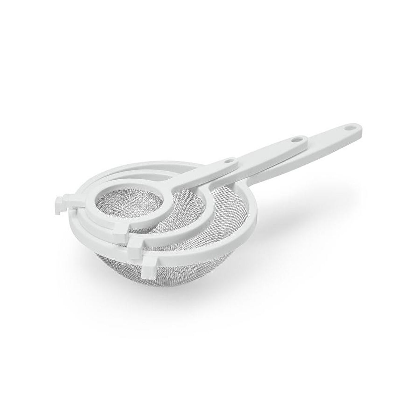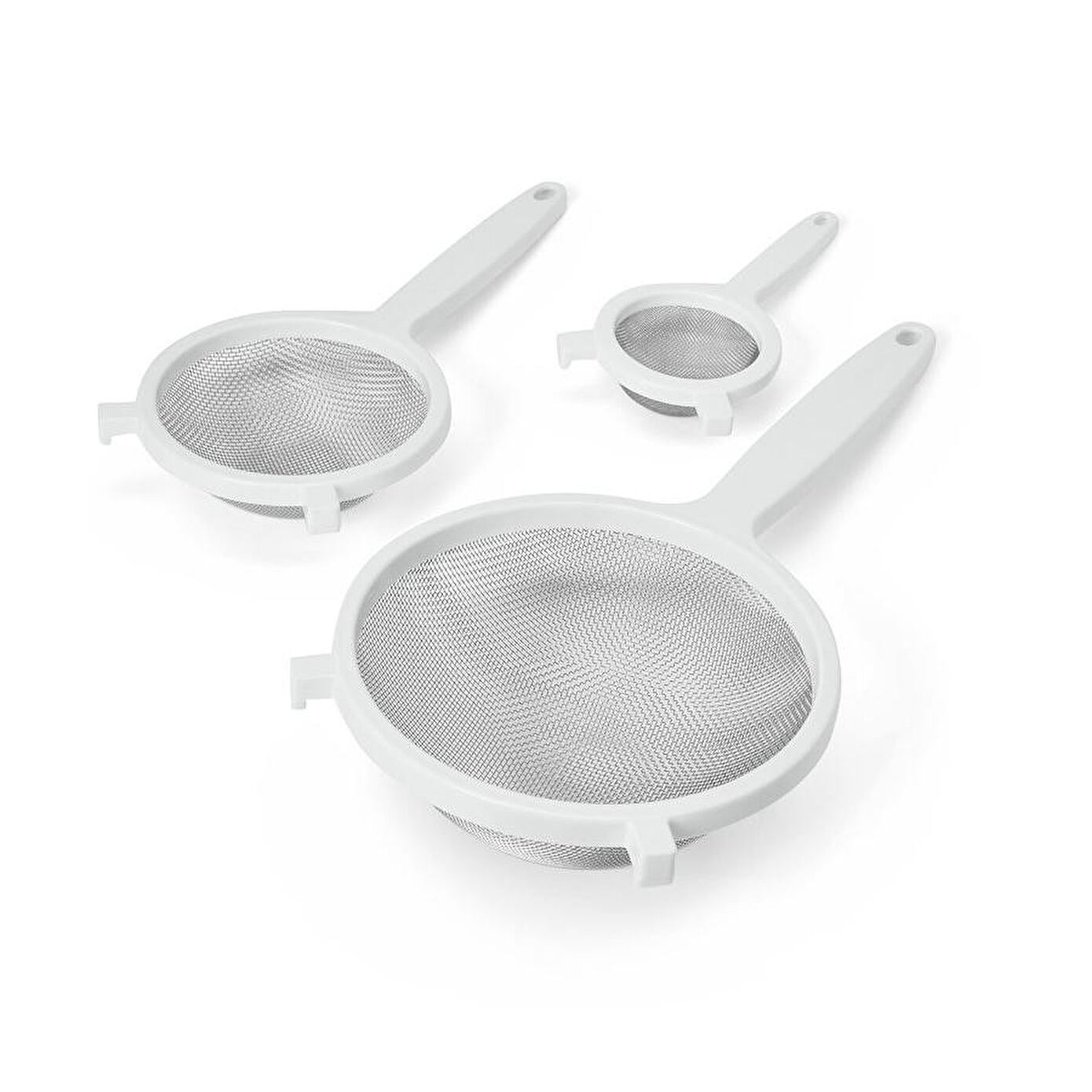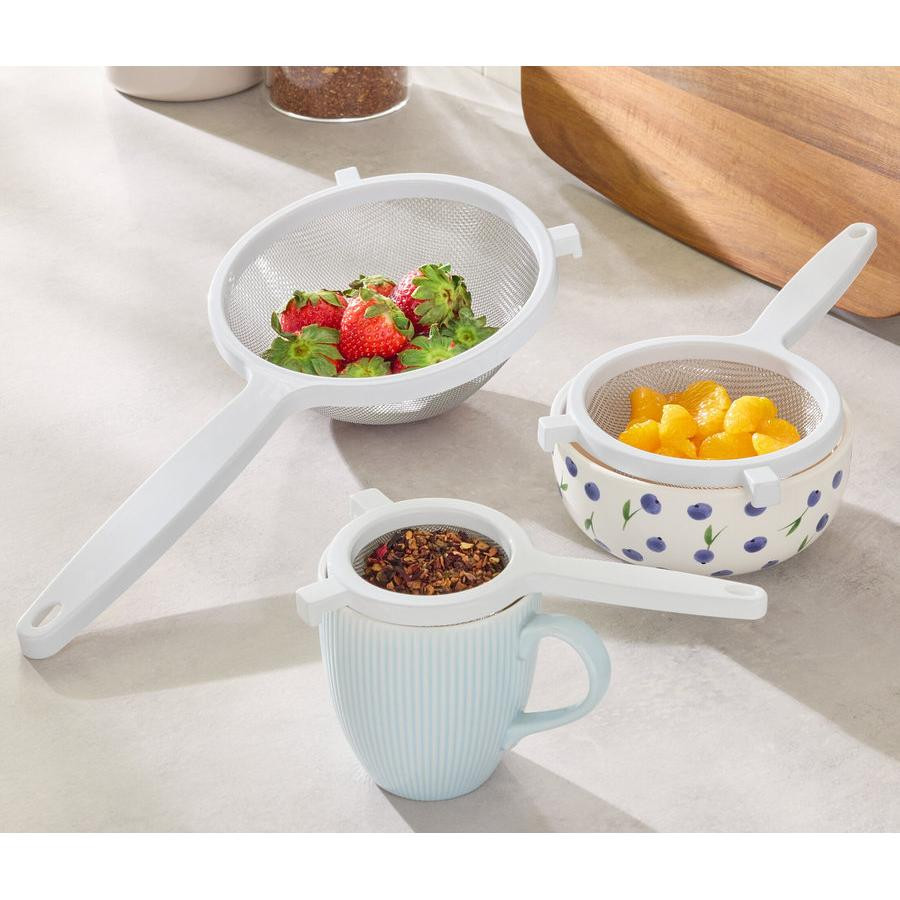 Elek seti Renk: beyaz çerçeve Net gümüş renkli malzeme: plastik ölçüler: büyük yaklaşık 18 cm, orta yaklaşık 13 cm, küçük yaklaşık 8 cm Yükseklik büyük yaklaşık 7 cm, orta yaklaşık 4 cm, küçük yaklaşık 3 cm Kullanım talimatları: 100 °C'ye kadar sıcaklığa dayanıklı Mutfakta çeşitli kullanımlar için 3 farklı boyut Çay demlemek veya hamur işlerine pudra şekeri serpmek vb. için kullanılan küçük, ince gözenekli süzgeç. Sebzeleri, salataları ve meyveleri yıkamak, süzmek ve süzmek, ayrıca pirinç veya makarnayı süzmek için orta ve büyük mutfak süzgeci Elekleri tencere, kase, fincan vb. eşyaların kenarına güvenli bir şekilde yerleştirmek için destek kancaları. Yüksek kaliteli ve dayanıklı paslanmaz çelikten yapılmış elek ağı Kolay kullanım ve saklama için asma halkalı sap Zararlı maddeler açısından test edilmiştir – harici, akredite enstitüler tarafından