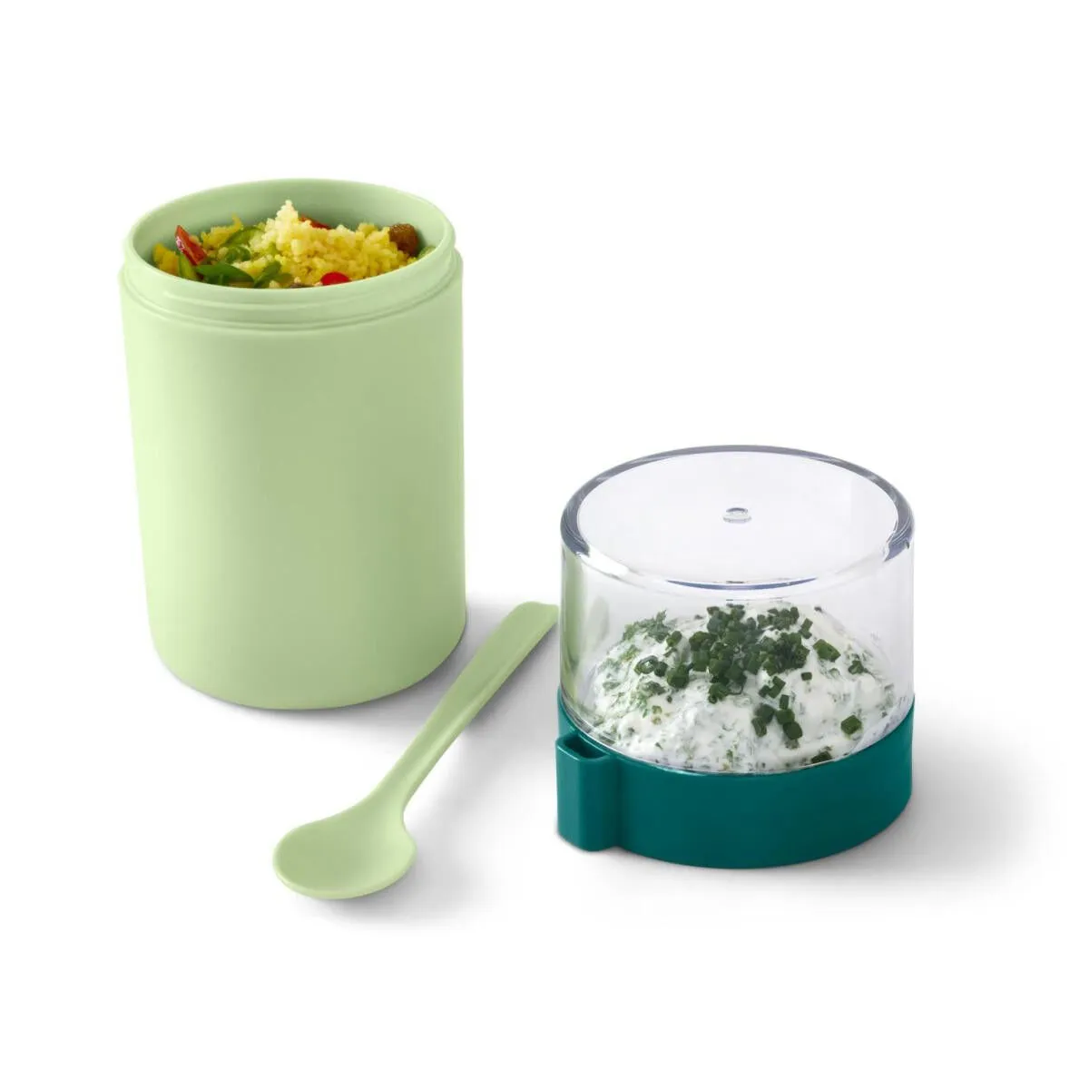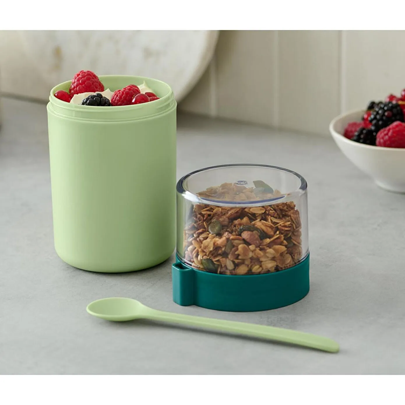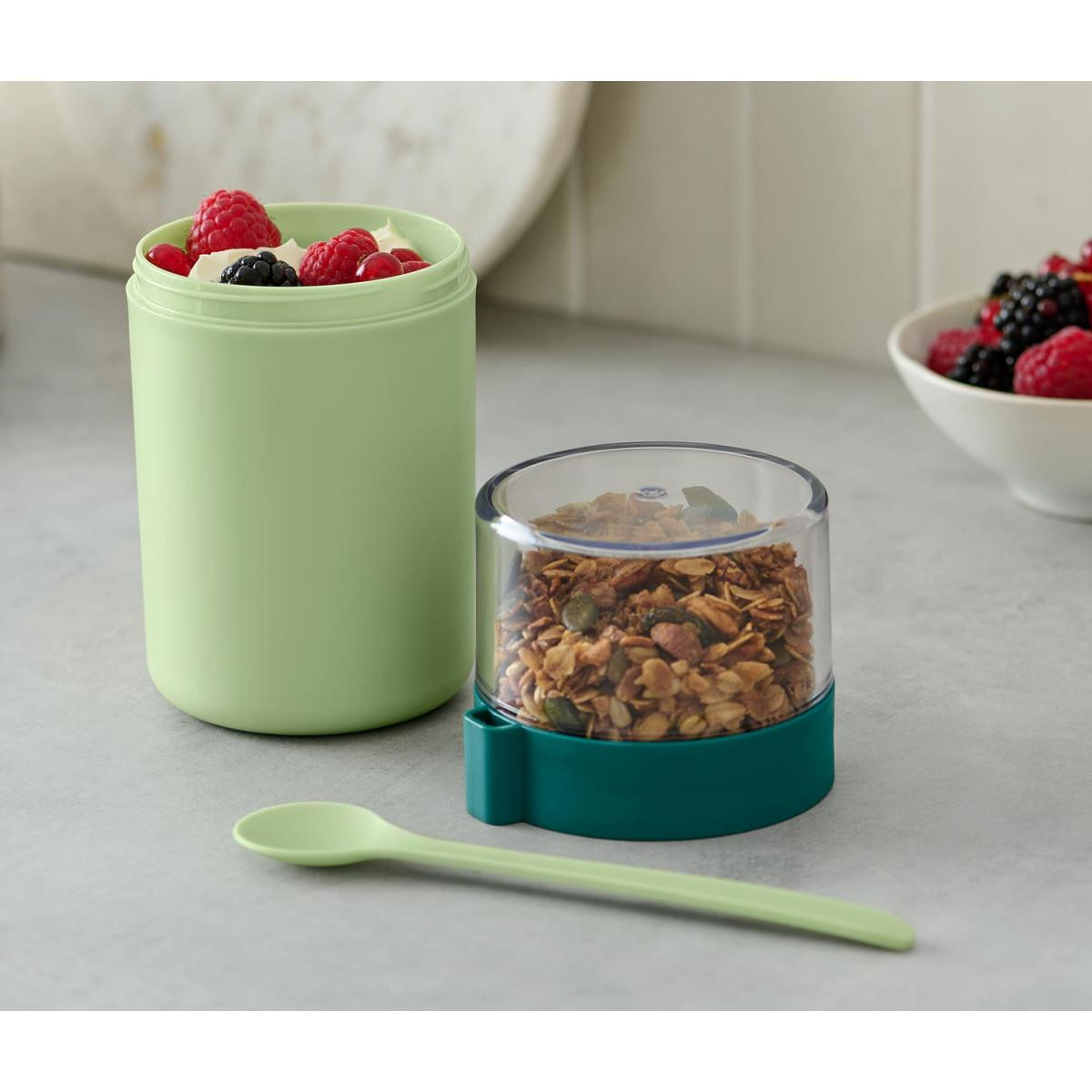 Taşınabilir Yoğurt Kabı Renk: Üst kap saydamAlt kap açık yeşilKaşık açık yeşil Malzeme: Kap ve kaşık %100 polipropilenKapak %100 stiren akrilonitrilConta %100 silikon Ölçüler: Yüksekliği yakl.; 17,5 cmÇapı yakl.; 8,5 cmKaşık uzunluğu yakl.; 16,5 cm İçerik/Aksesuar: Kaşık dahildir Dolum kapasitesi: Alt kap yakl.; 450 mlÜst kap yakl.; 200 ml Kullanım Uyarıları: Dondurucu için uygun değildir Müsli veya meyveleri ayrı saklamak için kapak|Çok yönlü kullanılabilir – soslu sebze çubukları gibi tuzlu atıştırmalıklar için de kullanılabilir|Kapağa takmak için kaşık dahildir|Silikon conta sızıntıyı önler