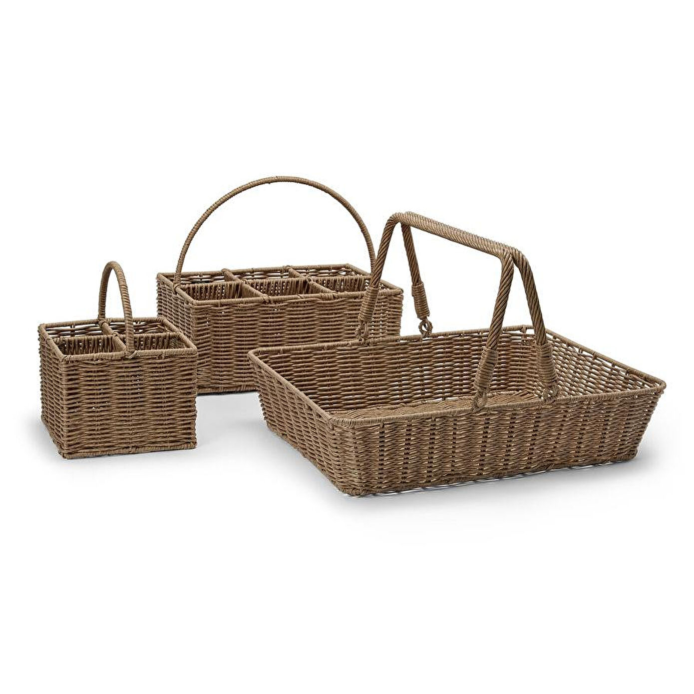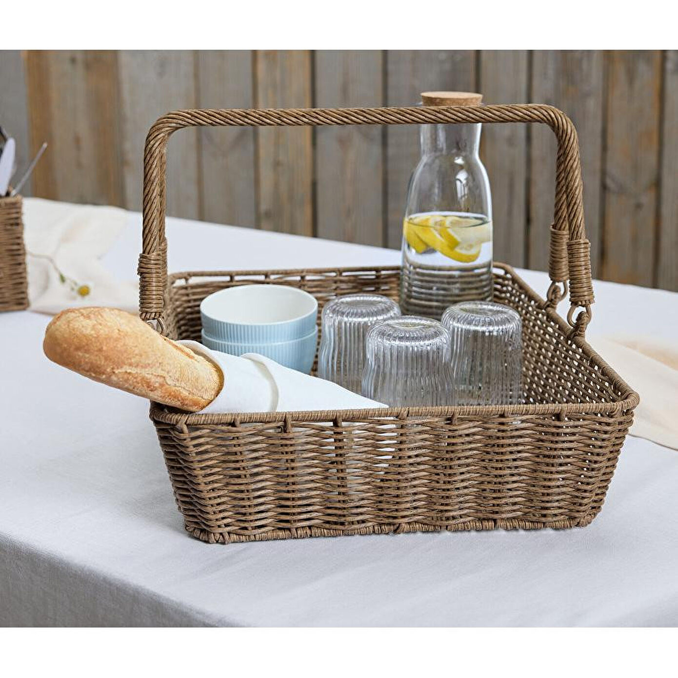 Hasır Sepet Renk: Sepet örgüsü natürel açık kahverengi Malzeme: Çelik tel elektrostatik toz boyalıÖrgü %100 polipropilen Ölçüler: G x Y x D yakl. 45 x 10,5 x 33,5 cmYükseklik tutacak ile yakl. 29 cmİç kısım 45 x 33 cm, kalınlık yakl. 2 mm Ağırlık: Yakl. 1,1 kg Taşıma Kuvveti: Maks. 10 kg Kullanım Uyarıları: Sadece kuru gıdalar için uygundur İç ve dış mekan kullanımı için uygundur|Taşırken ve servis ederken güvenli tutuş için ekstra yüksek kenarlar|Ortada katlanabilen taşıma saplı|Plastik hasır örgülü sağlam metal iskelet – nemli bezle silinebilir