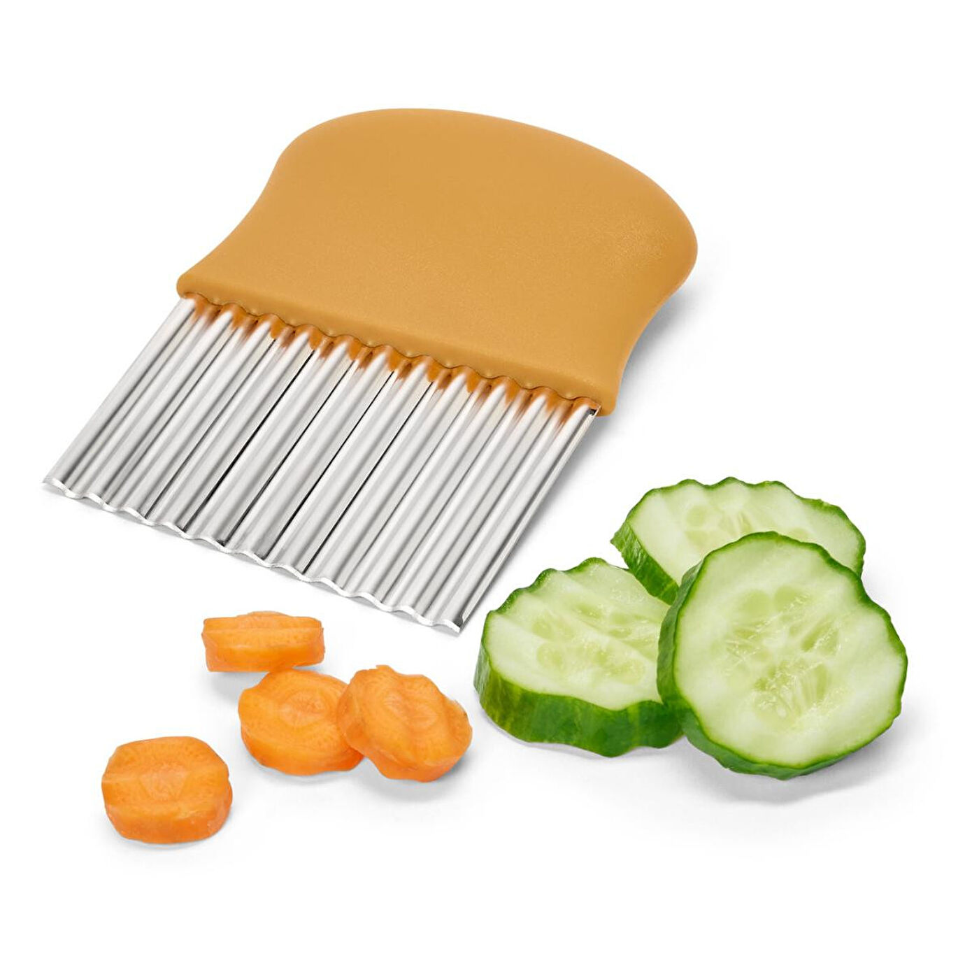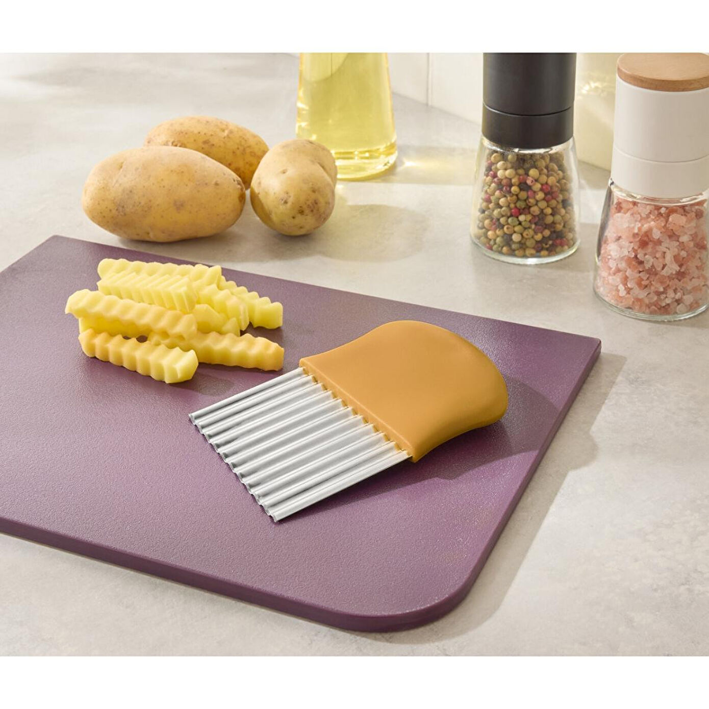 İlgi çekici tırtık deseni keser Meyve, sebze, sosis veya kaşar kesmek için Ele tam oturur Bulaşık makinesinde yıkanabilir İlgi çekici atıştırmalıklar veya patates kızartması hazırlamak için ideal Zararlı madde kontrolü yapılmıştır – harici, akredite kuruluşlar tarafından İçerik Renk Sap ve bıçak koruması sarı Bıçak gümüş rengi Malzeme Sap ve bıçak koruması %100 polipropilen Bıçaklar paslanmaz çelik Ölçüler Sap yakl. 96,3 x 70,5 mm Kesici yakl. 91,5 x 68,5 mm İçerik Bıçak koruyucusu dahildir