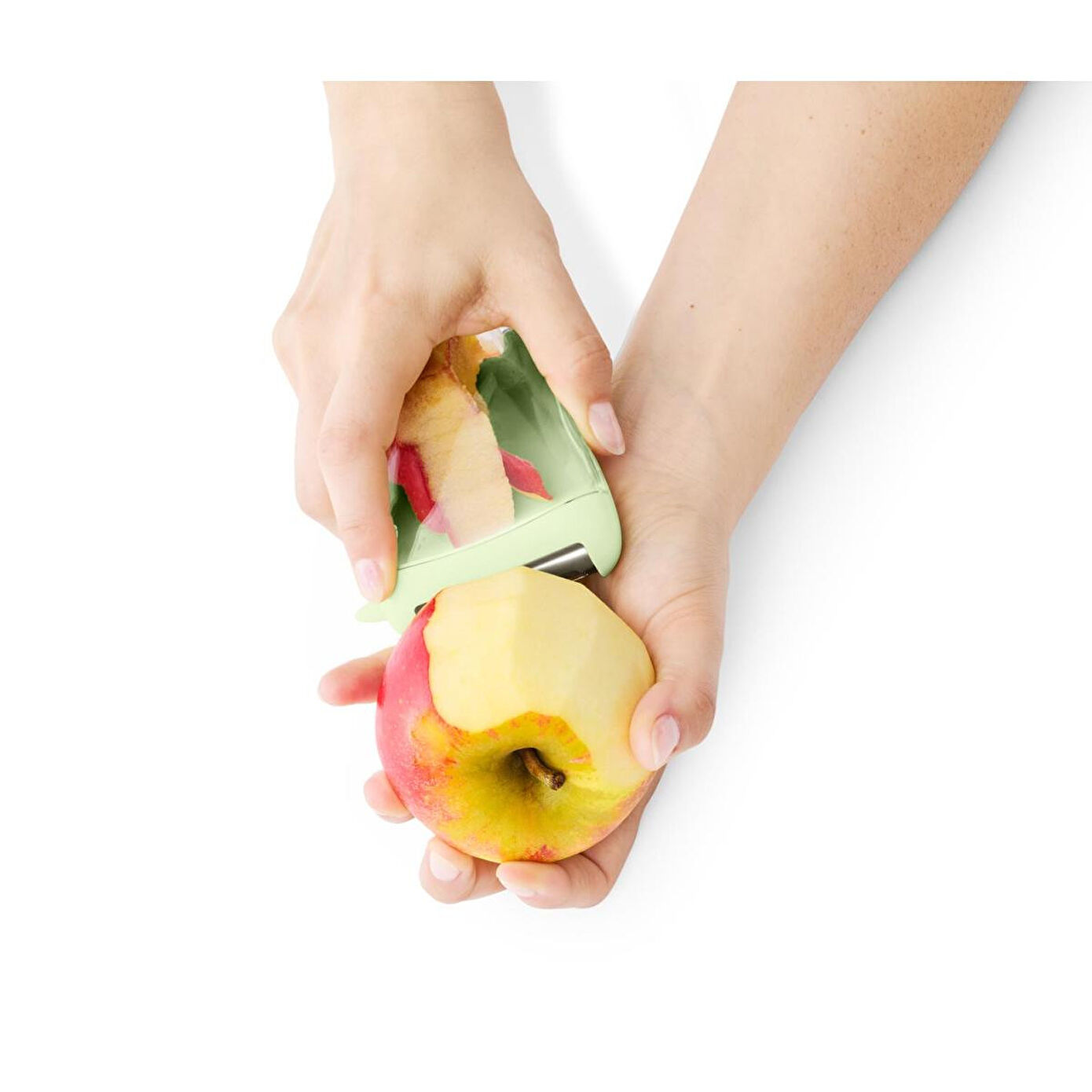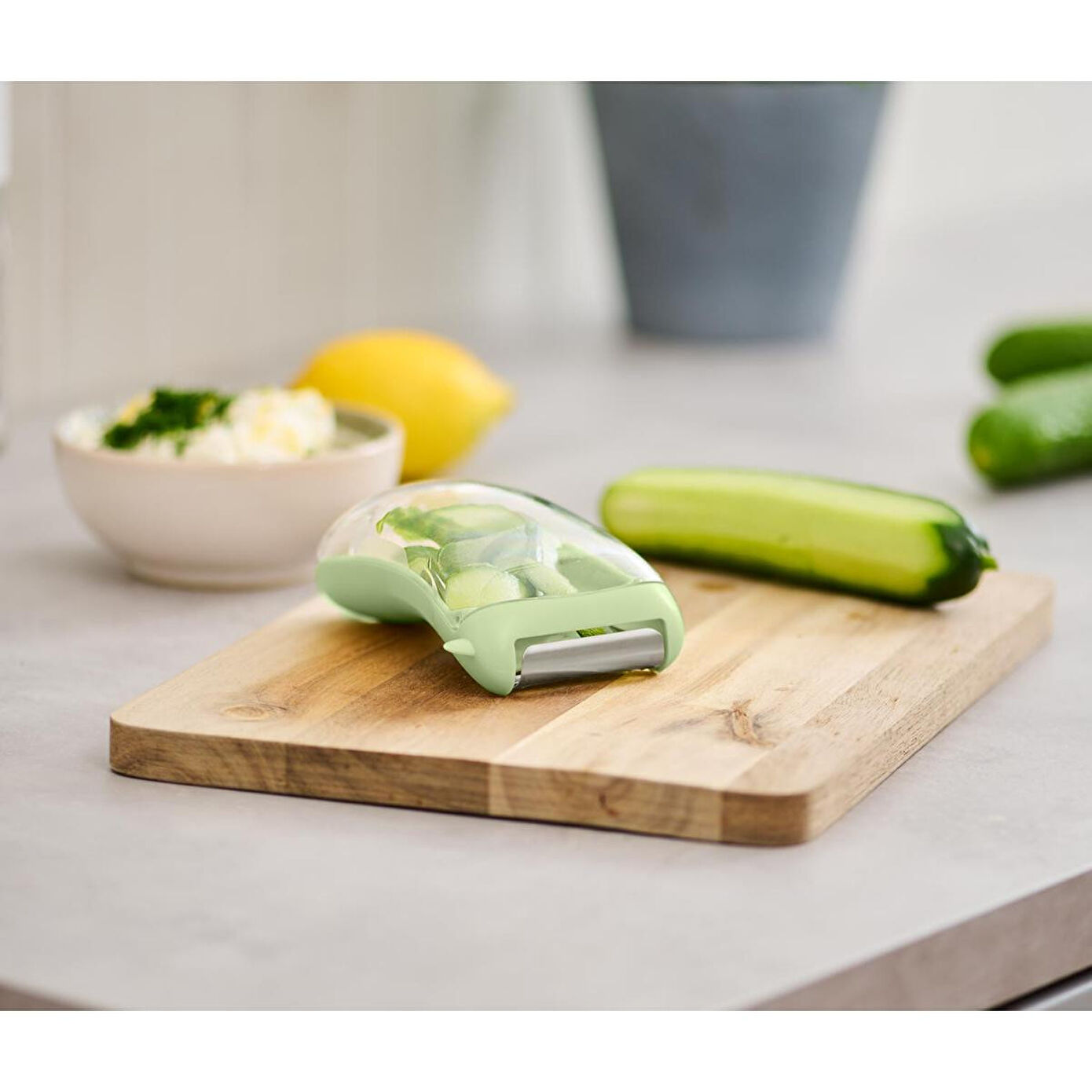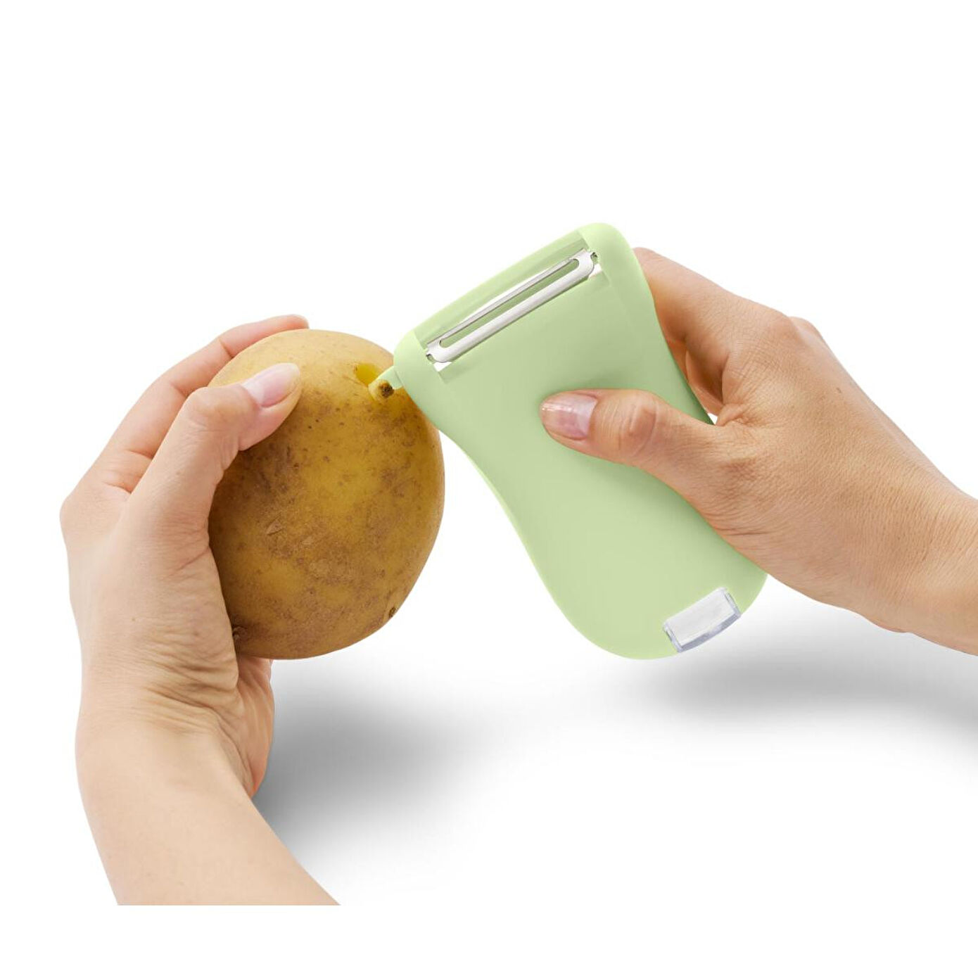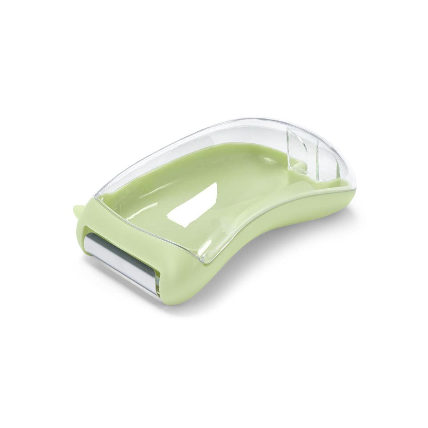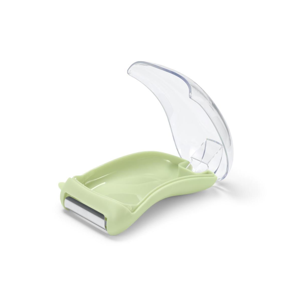 Toplama Kaplı Üniversal Soyucu Renk: Kesici paslanmaz çelik rengiTutamağın altı açık yeşilToplama haznesi saydam Malzeme: Kesici 18/10 paslanmaz çelikTutamak %100 stiren akrilonitrilToplama haznesi %100 tritan Ölçüler: Yakl.; 12 x 7,5 cmKesicinin genişliği yakl.; 5 cm Kullanım Uyarıları: Sadece yaygın meyve/sebzeler için uygundur Atıkları daha soyarken toplar|Hızlı ve ince soyma için paslanmaz çelikten keskin bıçak|Hareketli, bilenmiş bıçaklar|Yanında patates gözü çıkarıcı|Sağ veya sol elini kullananlar için uygundur|Bulaşık makinesinde yıkanabilir|Yaygın tüm sebze ve meyve türleri için uygundur|Yolculuk için de idealdir