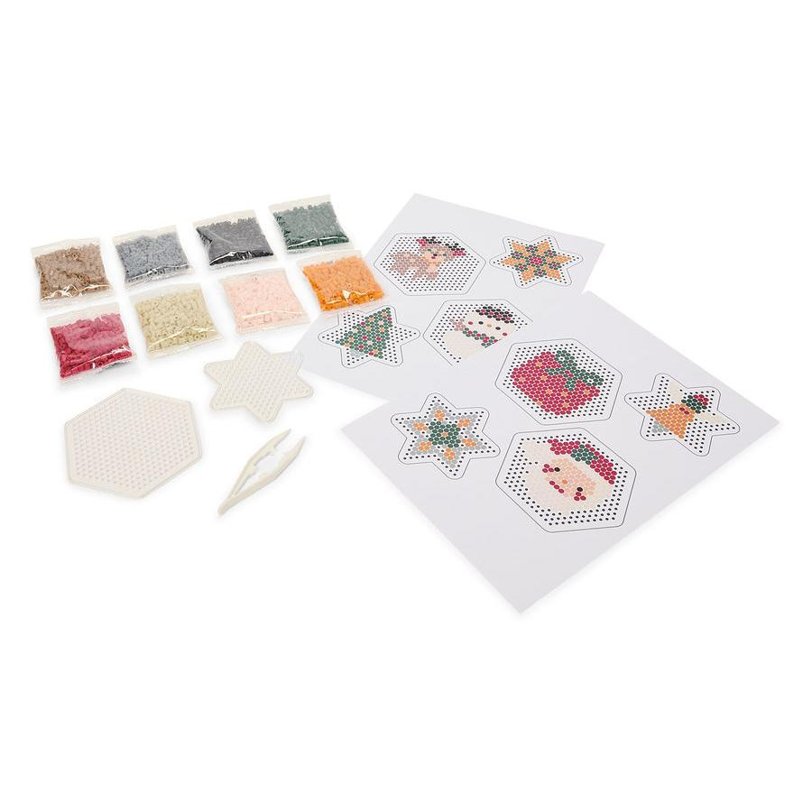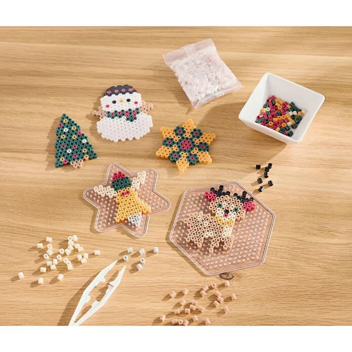 8 farklı renkte (her biri 250 adet) 2.000 adet ütüyle yapıştırılan boncuk, cımbız, altıgen şablon plakası, yıldız şablon plakası, A4 motif şablonu ve işleme talimatları dahildir