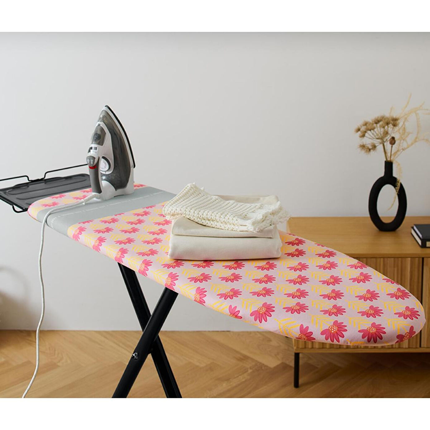 Ütü Masası Kılıfı Renk: Pembe, turuncu-sarı grafik baskılı Malzeme: %100 pamuk (Cotton made in Africa girişimini destekler)Sünger %100 poliüretanKaplama alüminyum Ölçüler: Yakl. 51 x 130 cm Özel kaplamalı Fast Ironing Zone sayesinde daha iyi kayma kabiliyeti|Alüminyum kaplamalı, ısıyı yansıtan alt kısmı sayesinde karşı ütüleme etkisi – elektrikten ve zamandan tasarruf|Durduruculu kordon sayesinde boyutu istenen şekilde ayarlanabilir |Ütüleme alanı 45 x 124 cm'ye kadar olan standart ütü masaları için uygundur|Cotton made in Africa girişimini destekler|Bu ütü masası kılıfı çiftçileri destekler.