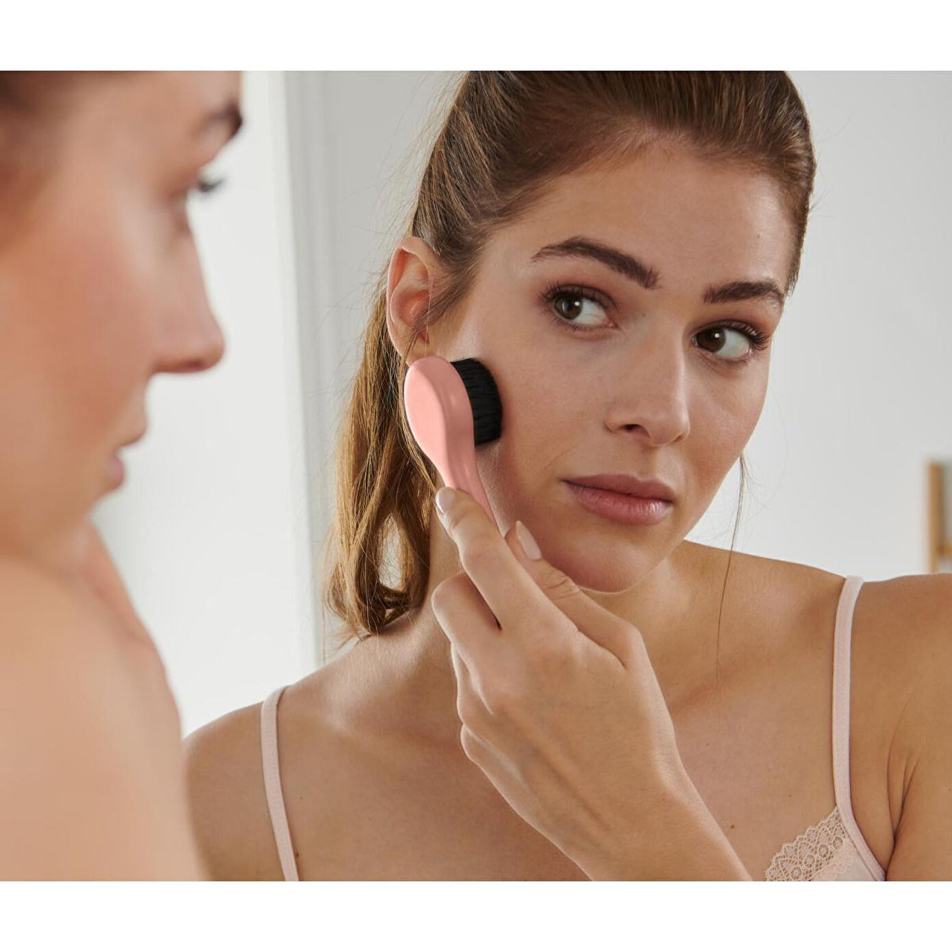 Bakır Yüz Masaj Fırçası Renk: PembeSiyah ve bakır rengi fırça kılları Malzeme: Fırça gövdesi %100 polipropilen (geri dönüştürülmüş)Kaplama %100 termoplastik elastomer (termoplastik lastik)Dış fırça kılları %100 poliamitİç fırça kılları bakır tel Ölçüler: Uzunluğu yakl. 14 cmBaşlık çapı yakl. 4,5 cmFırça kıllarının uzunluğu yakl. 15 mm İçerik/Aksesuar: Bakım ve kullanma talimatları ile birlikte Kullanım Uyarıları: Fırça dikkatli bir şekilde kullanılmalıdır Uyarılar: Tıbbi bir cihaz değildir Keyifli bir yüz temizliği için |Parlak bir cilt elde etmeye ve ölü deri hücrelerini gidermeye yardımcı olabilir|Kuru ciltte de kullanılabilir|Her cilt tipine uygundur |Dış kısımda yumuşak naylon fırça kılları; iç kısımda ince bakır fırça kılları|Başlık çapı yakl. 4,5 cm