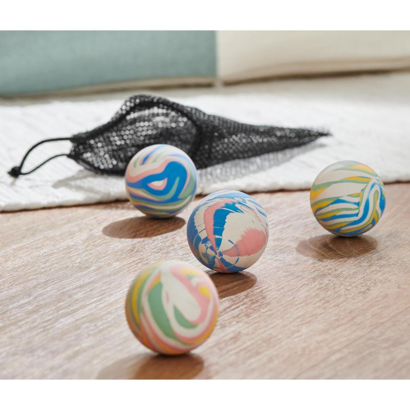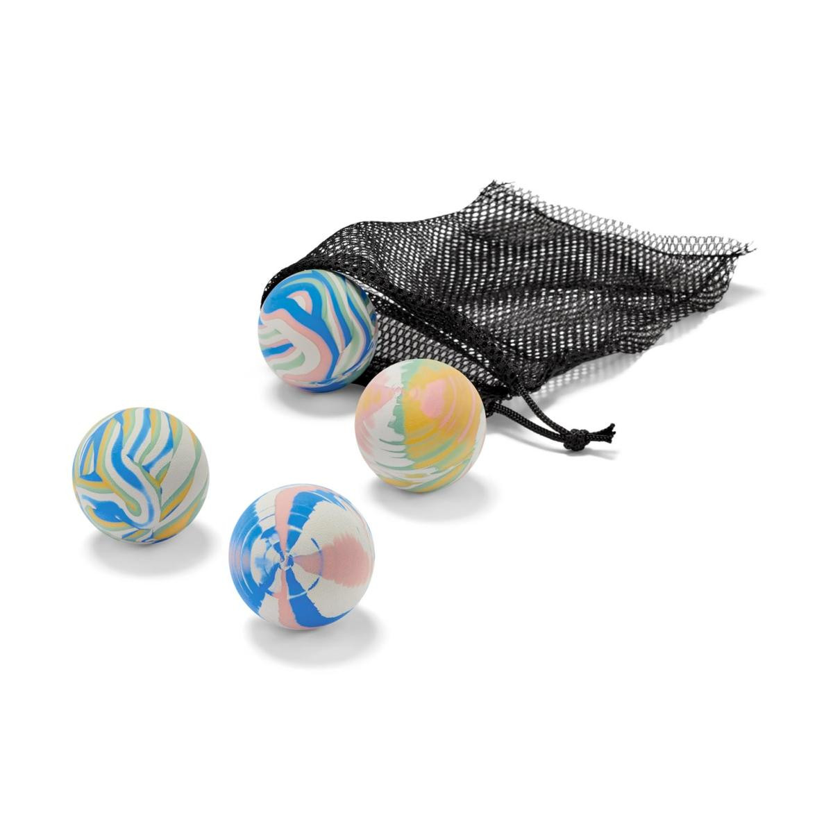 Zıplayan Top Seti Renk: Çok renkli Malzeme: %100 termoplastik elastomerler (termoplastik lastik)File torba ve ip %100 pamuklu Ölçüler: Her birinin Ø yakl.; 4 cm Ağırlık: Her biri yakl.; 54 g PVC içermez|Depolama için file torba dahildir|4'lü set