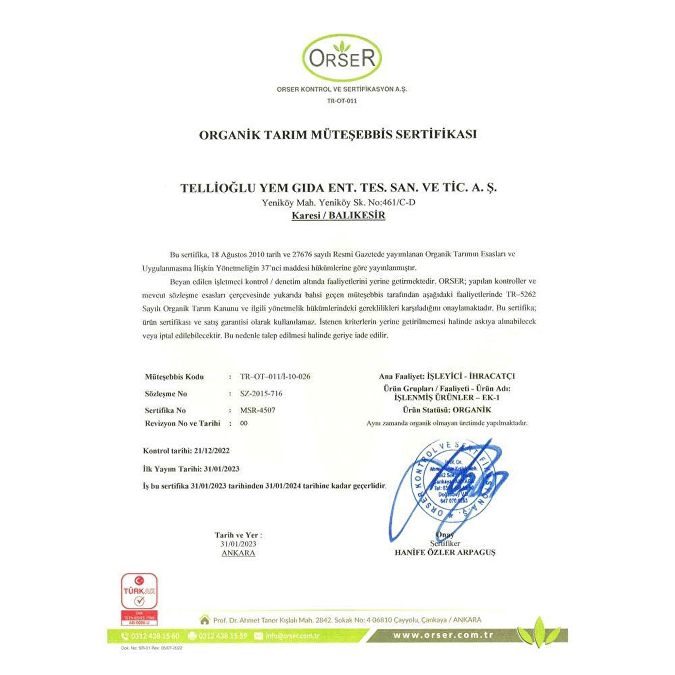 Tellioğlu Un Fabrikası TS EN ISO 9001:2008, Kalite Yönetim Sistemi, TS EN ISO 22000:2005 Gıda Güvenliği Yönetim Sistemi, belgelidir.