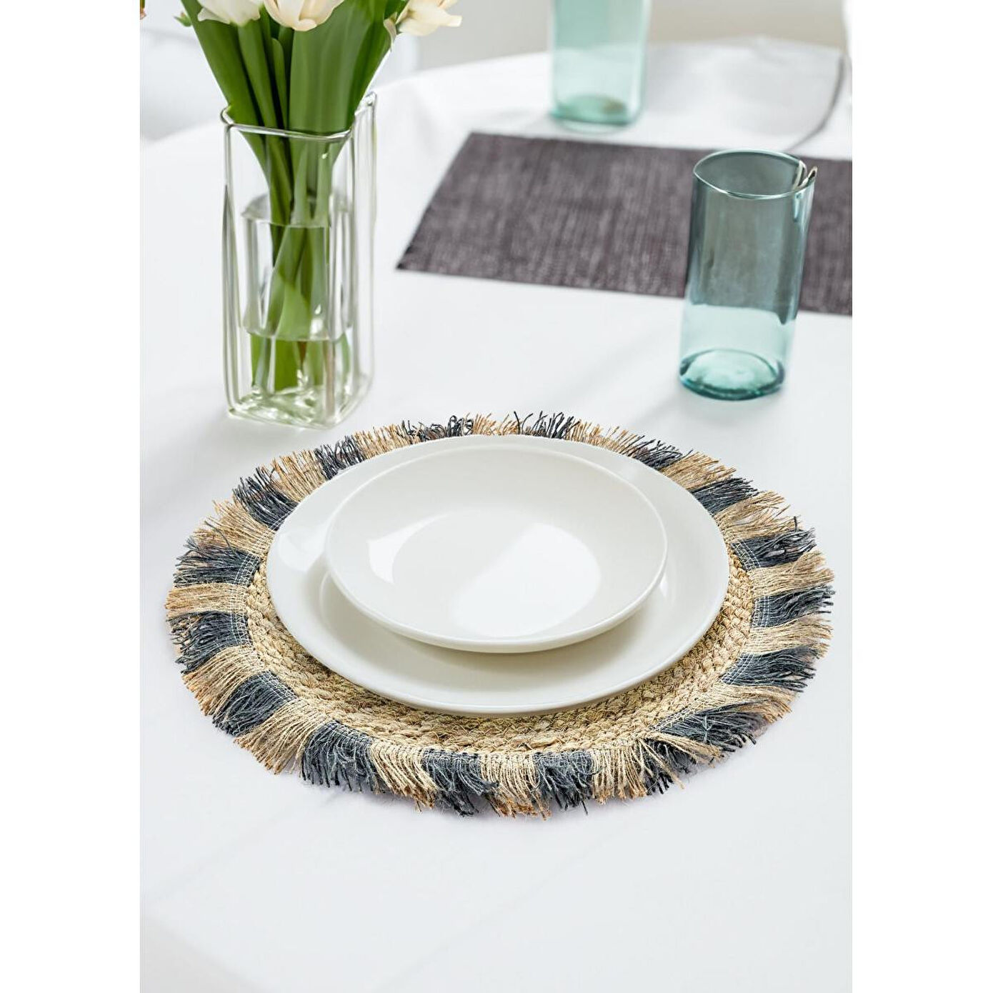 Jüt ipliğin doğallığı ve dayanıklılığıyla birleşen bu amerikan servis ile sofra şıklığınızı tamamlayın.