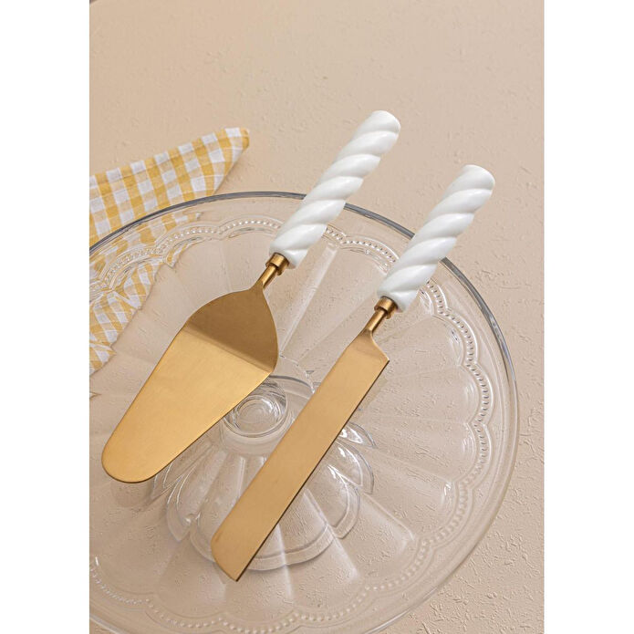 Ürün Tipi: Pasta Servis Takımı Set İçeriği: 2’li set (pasta spatulası ve pasta bıçağı) Uzunluk: 30 cm Kaplama: Mat Gold PVD Finish Sap Malzemesi: Seramik Renk: Mat gold – beyaz Kullanım Alanı: Pasta, kek ve tatlı servisiBakım ve Temizlik