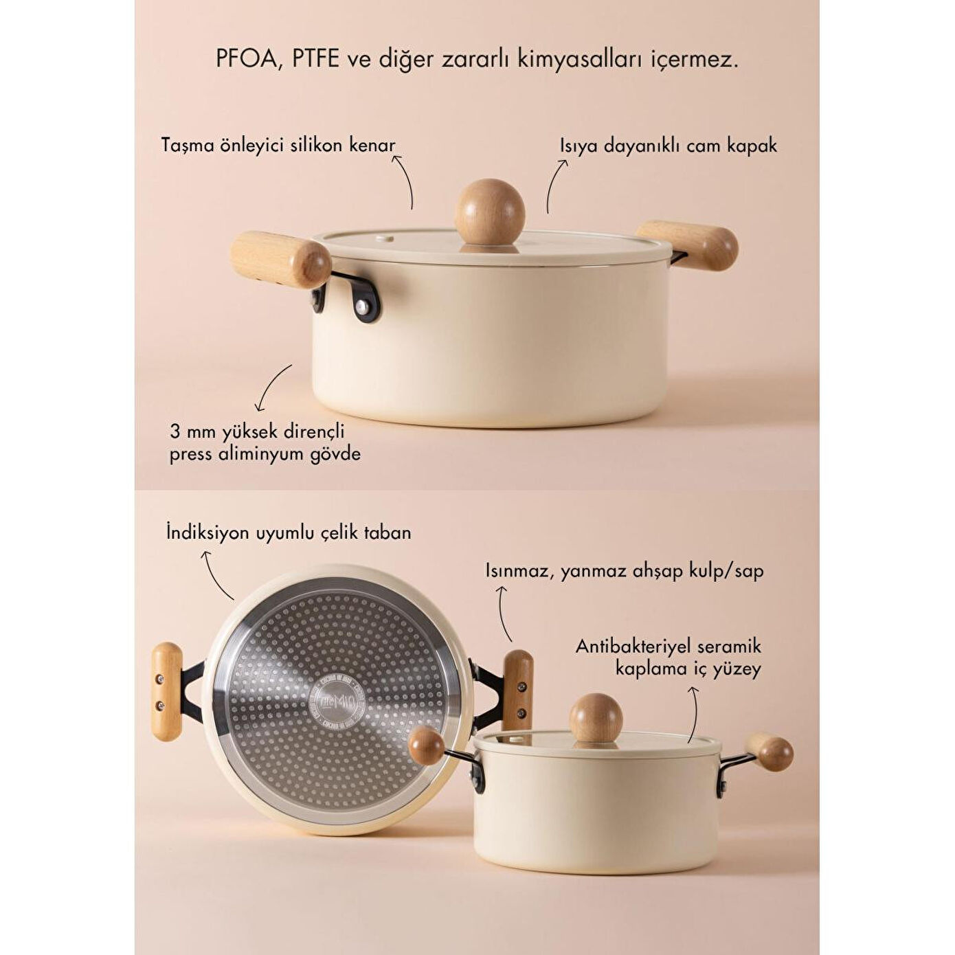 Üretim aşamasında yüksek sıcaklıklarda pişirilen seramik kaplama, tencere ve tavalara dayanıklı ve pürüzsüz bir yüzey sağlar.