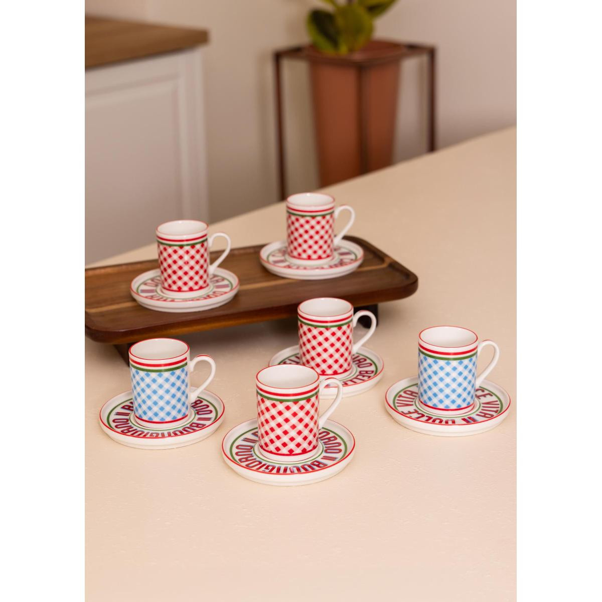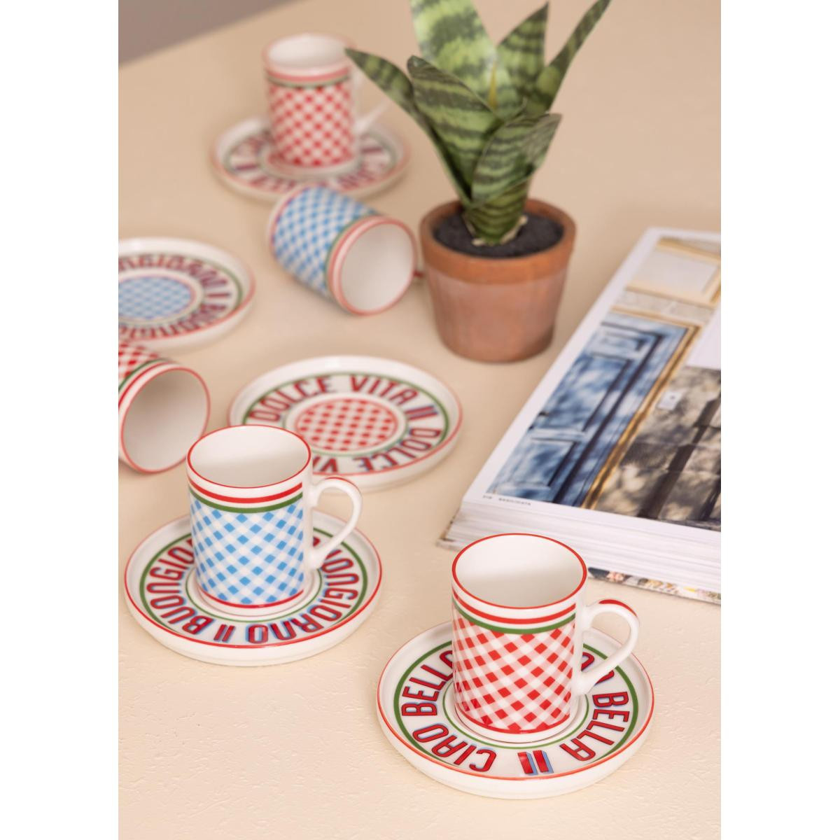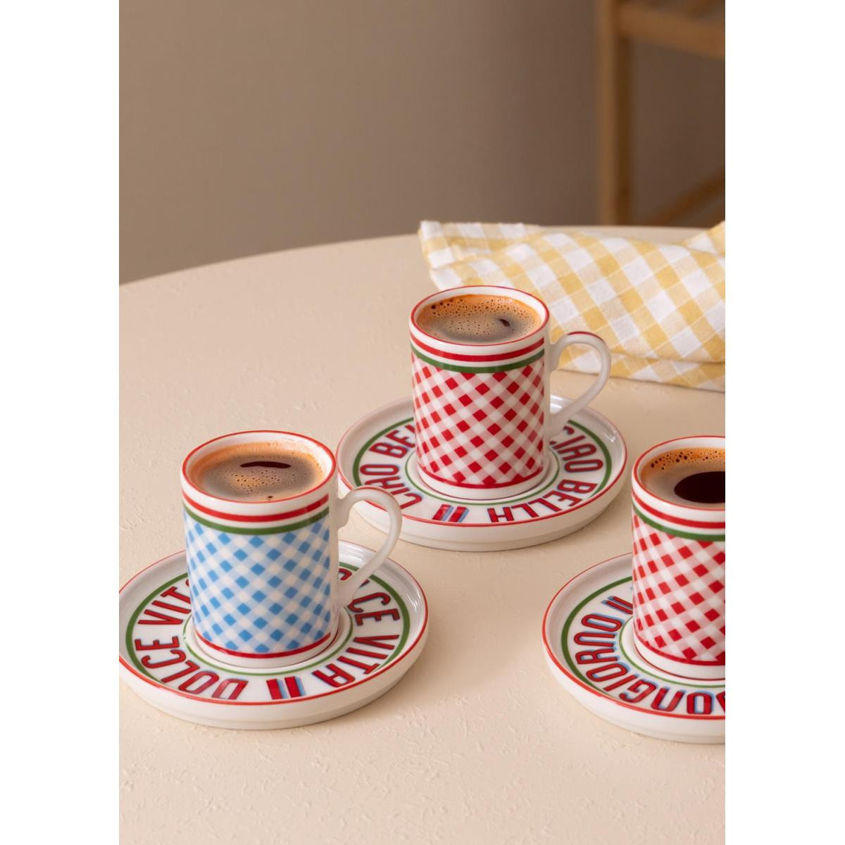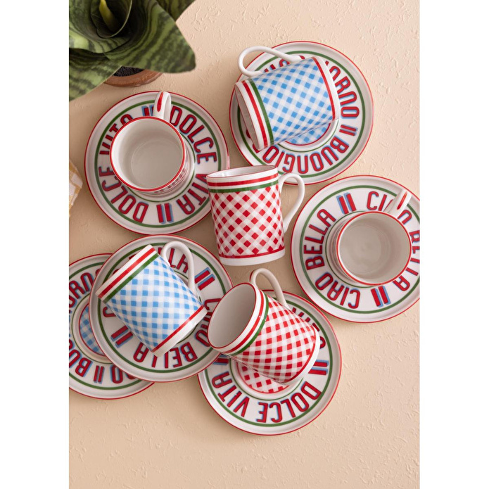Cucina 6 kişilik porselen kahve fincan takımı, zarif tasarımı ve modern desenleriyle kahve sunumlarınıza şıklık katar. Kırmızı ve mavi desenli özel tasarıma sahip fincanlar, estetik tabaklarıyla birlikte sunumlarınıza canlı bir görünüm kazandırır. 100 cc hacmiyle Türk kahvesi ve espresso servisleri için ideal ölçüdedir.