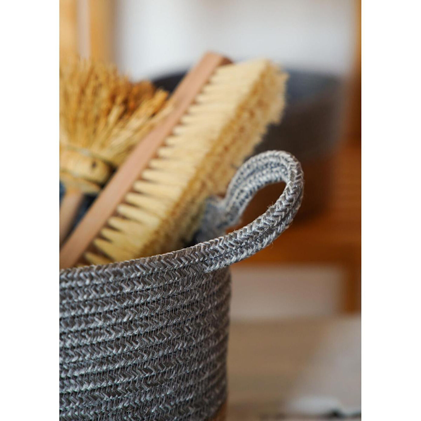 The Mia Jutte Kulplu Yuvarlak Sepet Bambu Gri 25x20 Cm