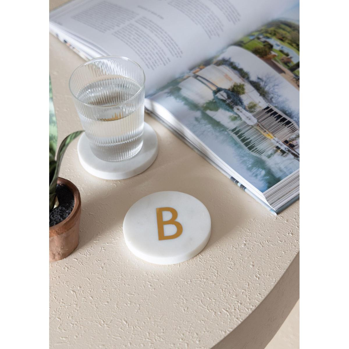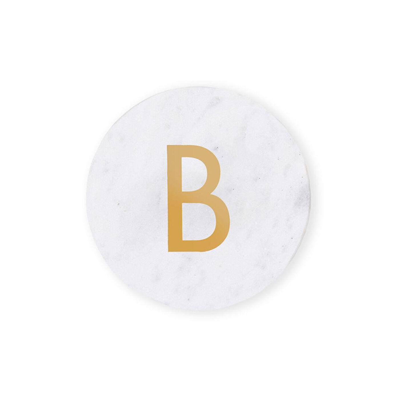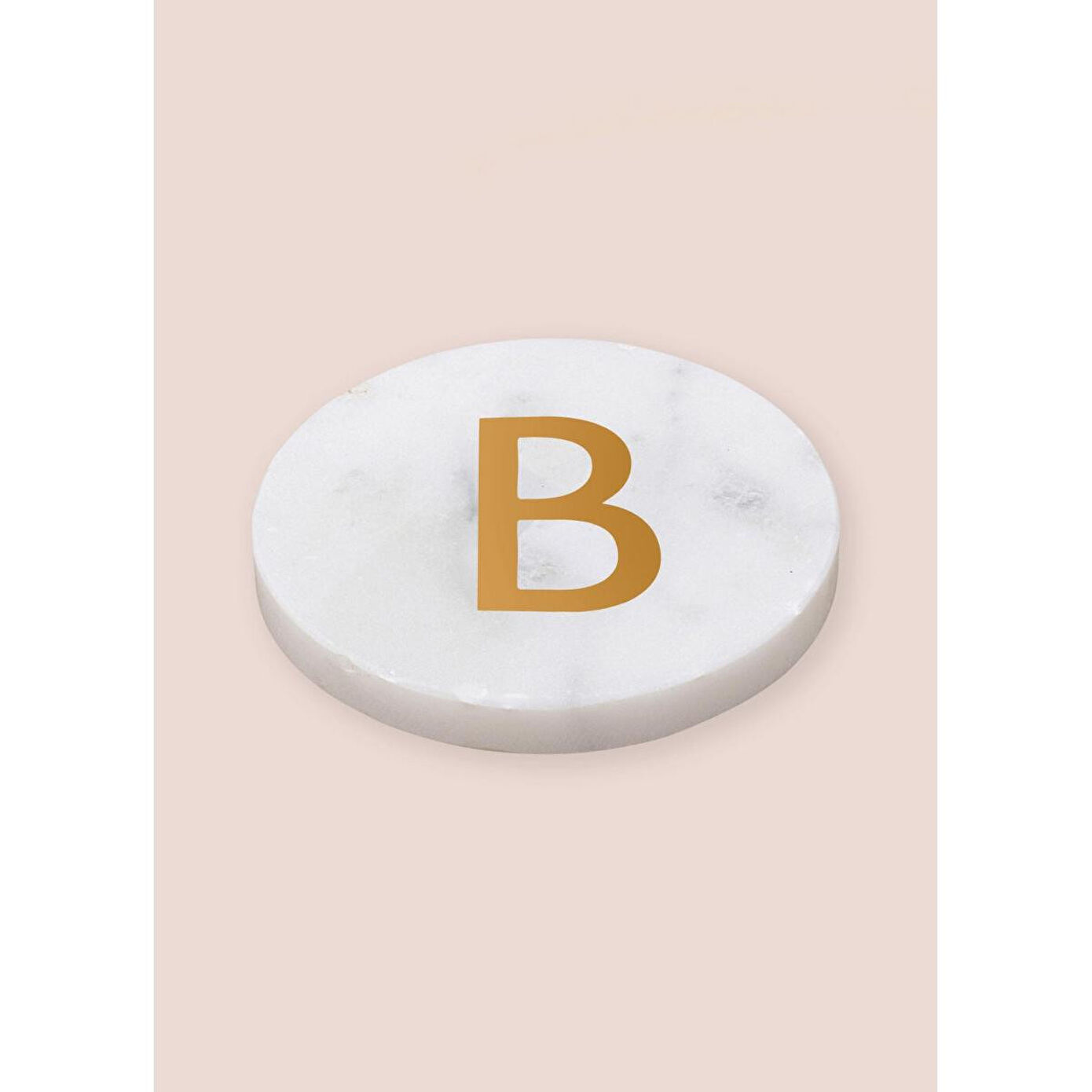 Doğal mermer dokusu ve üzerindeki el işçiliği pirinç harf detayıyla hem fonksiyonel hem dekoratif bir kullanım sunar. Minimal ve zamansız tasarımı sayesinde farklı dekorasyon stillerine kolayca uyum sağlar. Masa üzerinde estetik bir görünüm oluştururken bardak ve fincanlar için koruyucu bir yüzey sunar.