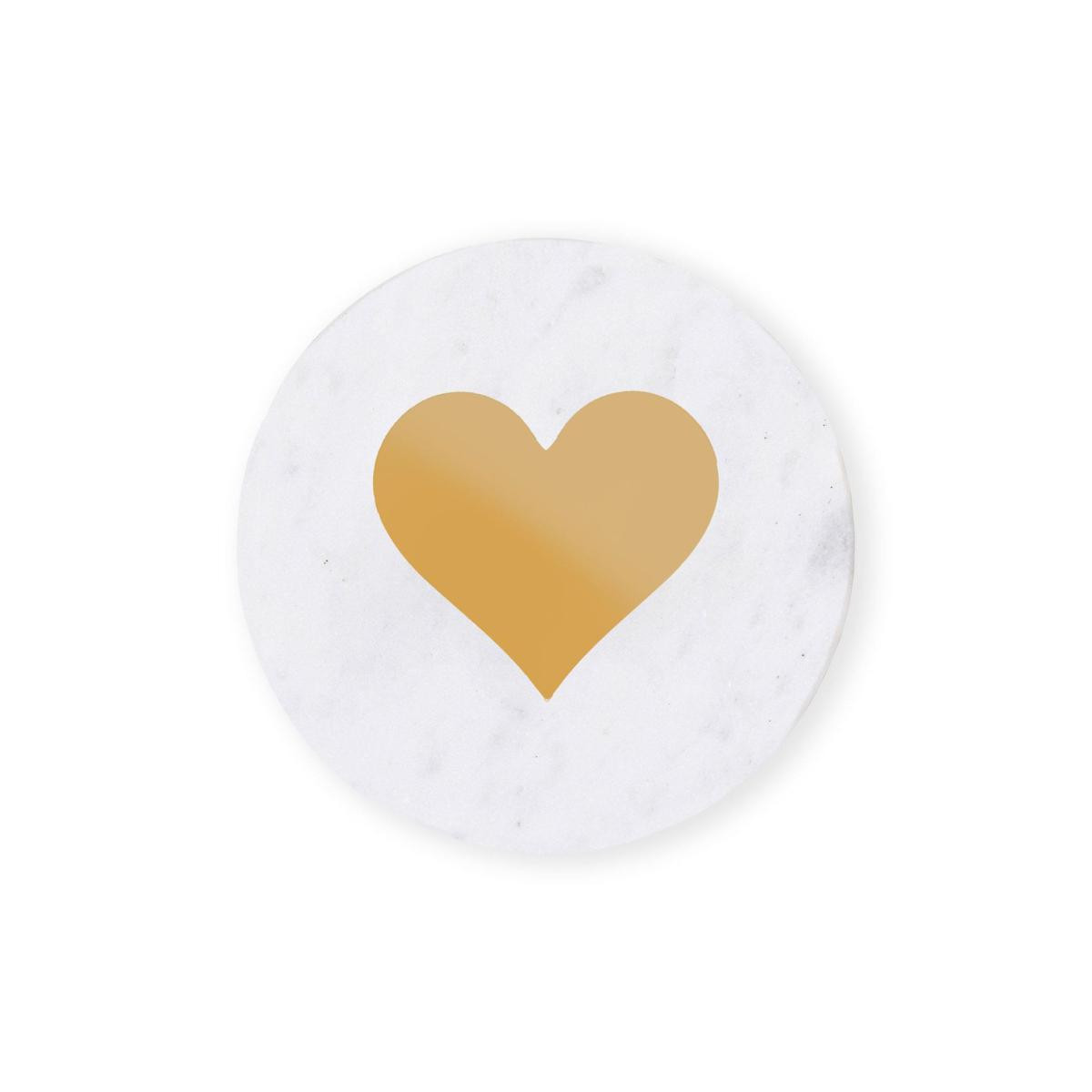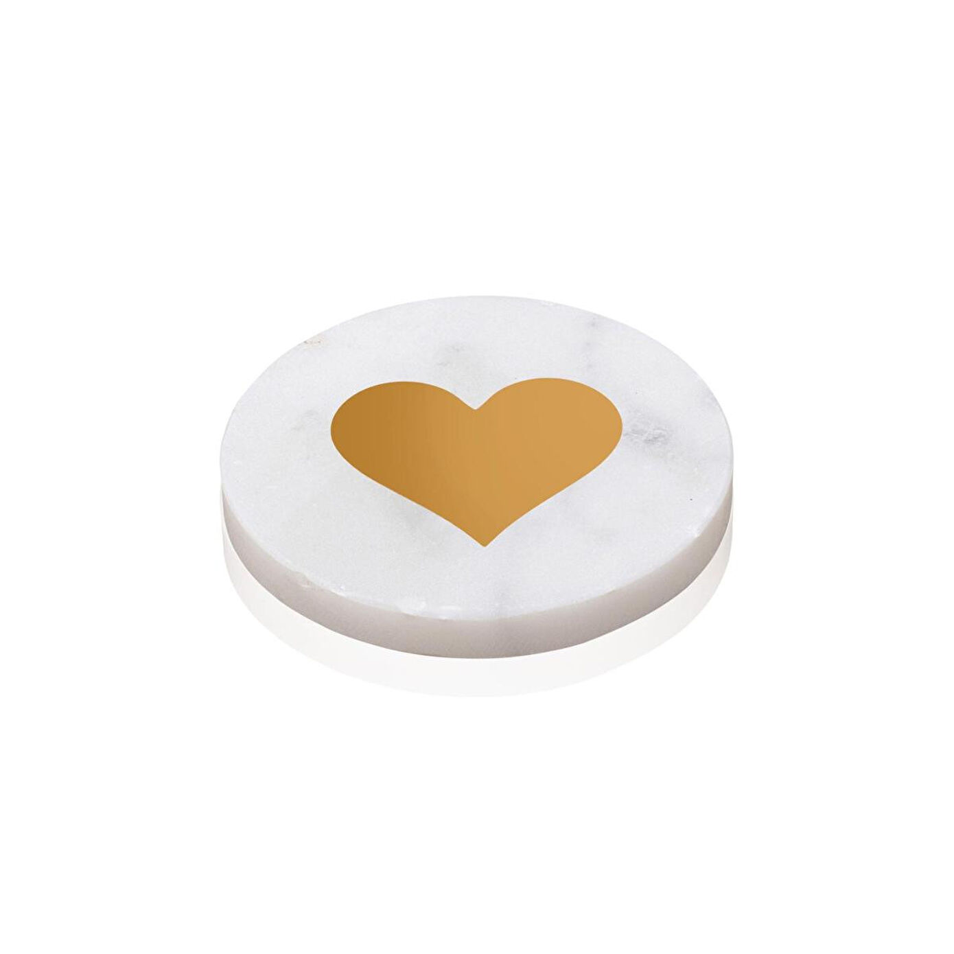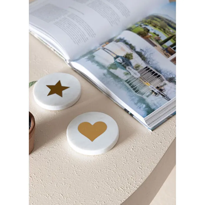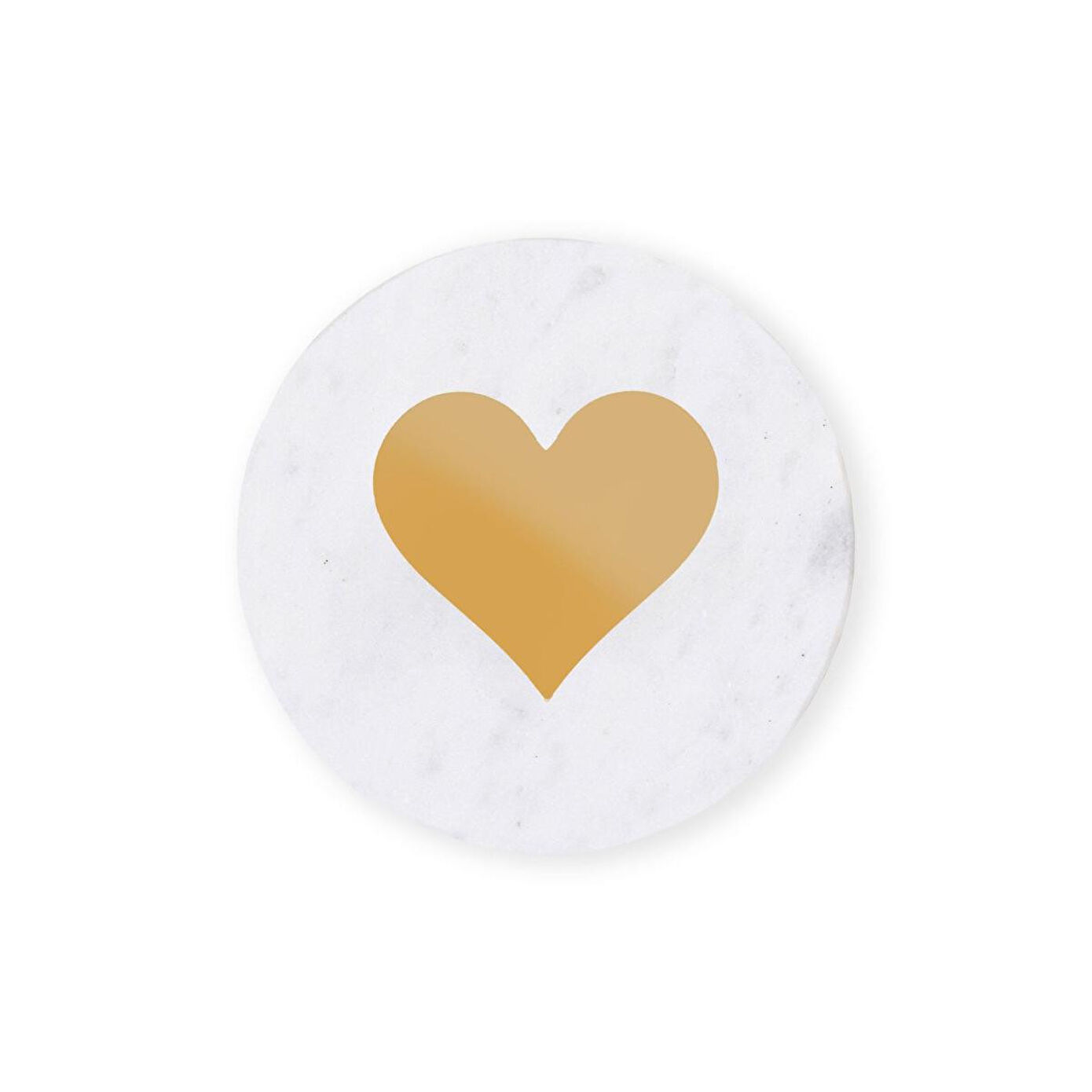Doğal mermer dokusu ve üzerindeki el işçiliği pirinç harf detayıyla hem fonksiyonel hem dekoratif bir kullanım sunar. Minimal ve zamansız tasarımı sayesinde farklı dekorasyon stillerine kolayca uyum sağlar. Masa üzerinde estetik bir görünüm oluştururken bardak ve fincanlar için koruyucu bir yüzey sunar.