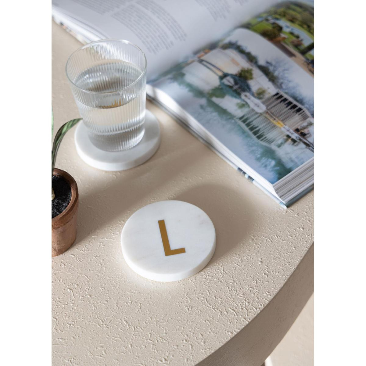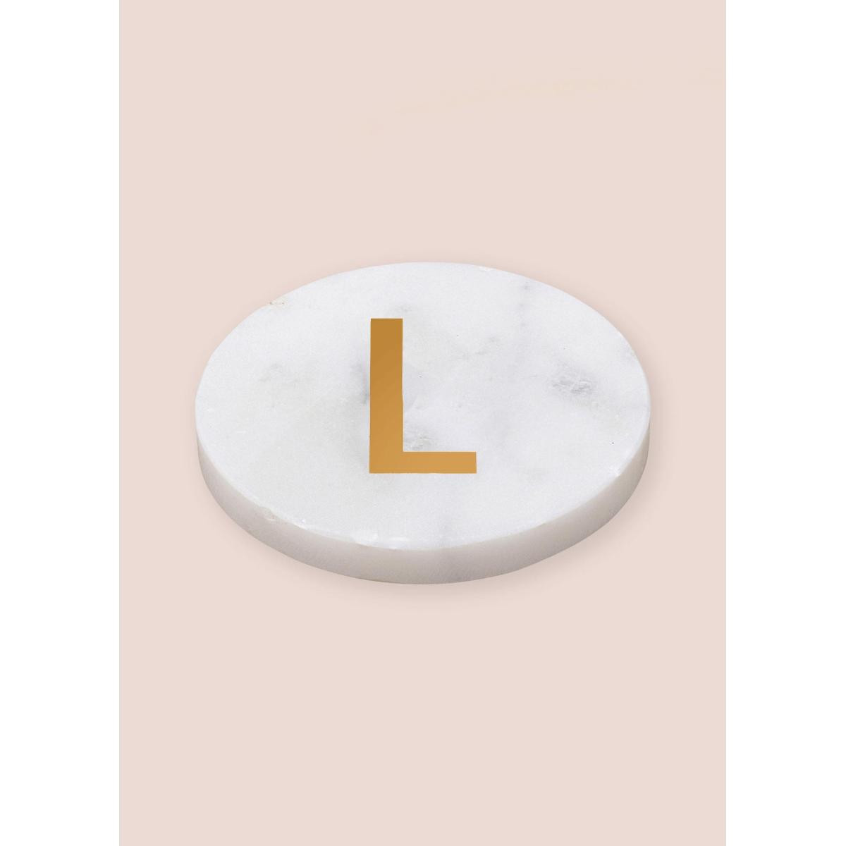 Doğal mermer dokusu ve üzerindeki el işçiliği pirinç harf detayıyla hem fonksiyonel hem dekoratif bir kullanım sunar. Minimal ve zamansız tasarımı sayesinde farklı dekorasyon stillerine kolayca uyum sağlar. Masa üzerinde estetik bir görünüm oluştururken bardak ve fincanlar için koruyucu bir yüzey sunar.