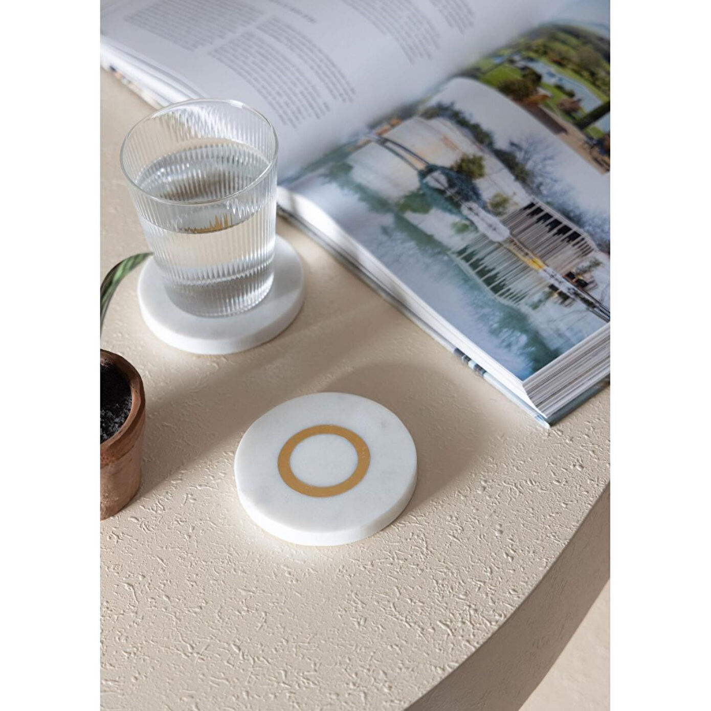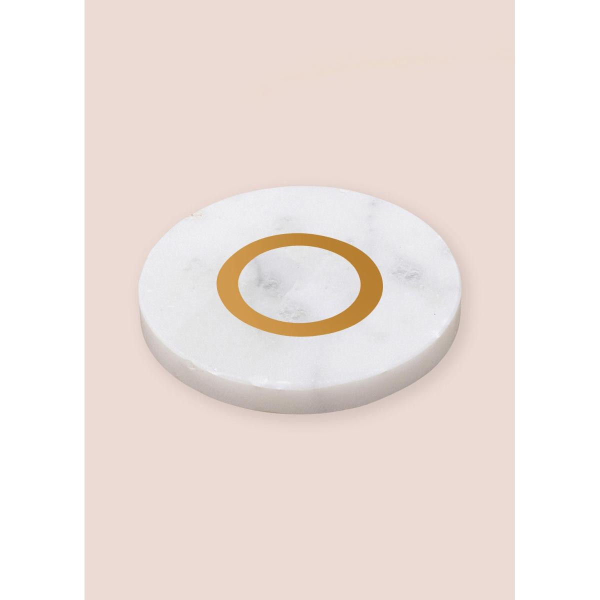Doğal mermer dokusu ve üzerindeki el işçiliği pirinç harf detayıyla hem fonksiyonel hem dekoratif bir kullanım sunar. Minimal ve zamansız tasarımı sayesinde farklı dekorasyon stillerine kolayca uyum sağlar. Masa üzerinde estetik bir görünüm oluştururken bardak ve fincanlar için koruyucu bir yüzey sunar.