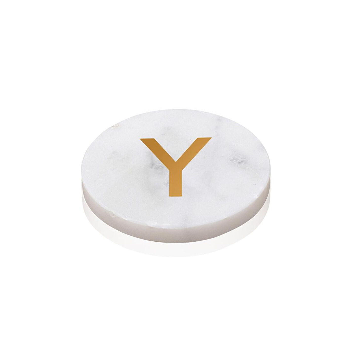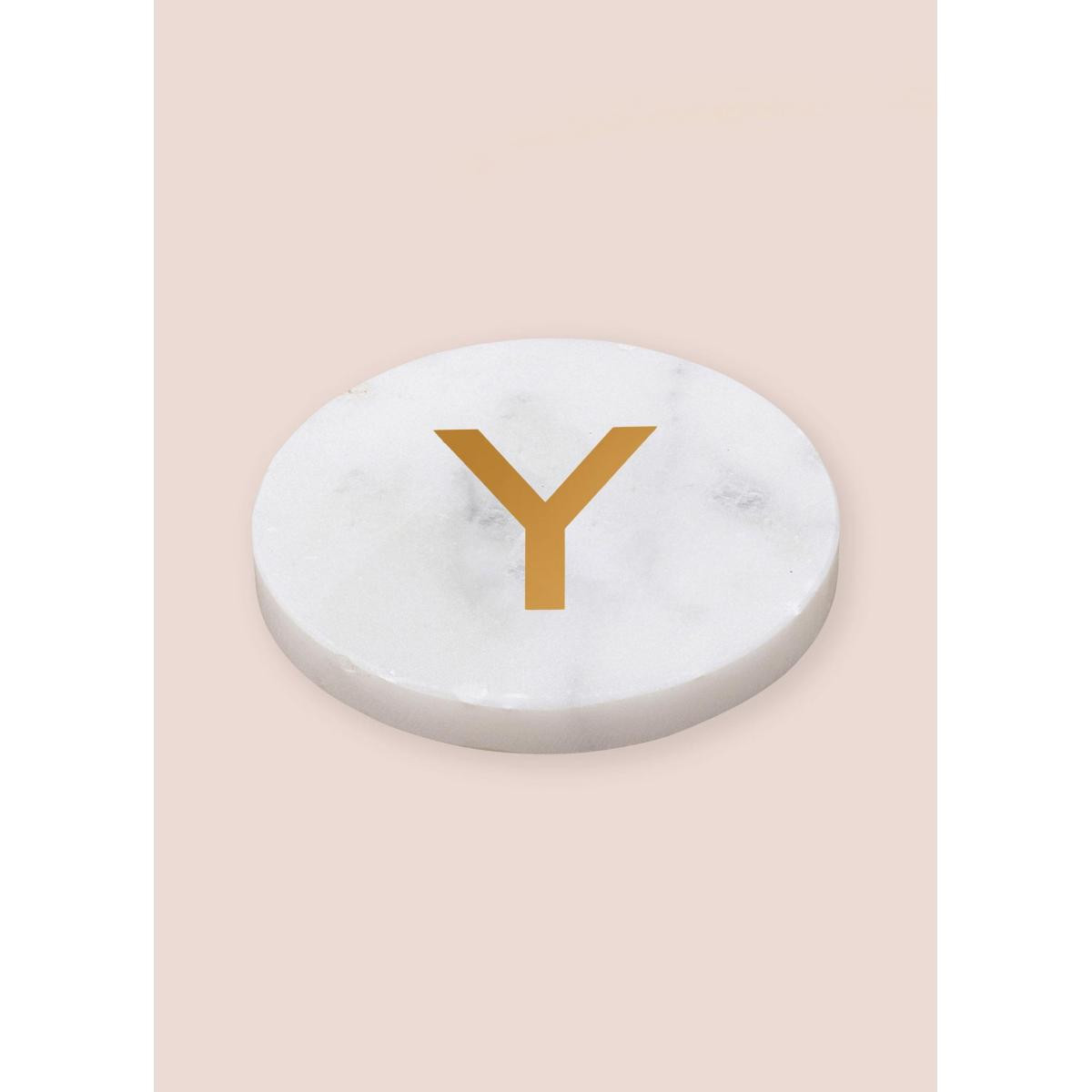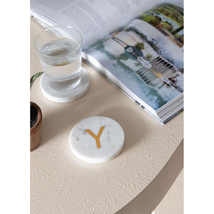 Doğal mermer dokusu ve üzerindeki el işçiliği pirinç harf detayıyla hem fonksiyonel hem dekoratif bir kullanım sunar. Minimal ve zamansız tasarımı sayesinde farklı dekorasyon stillerine kolayca uyum sağlar. Masa üzerinde estetik bir görünüm oluştururken bardak ve fincanlar için koruyucu bir yüzey sunar.