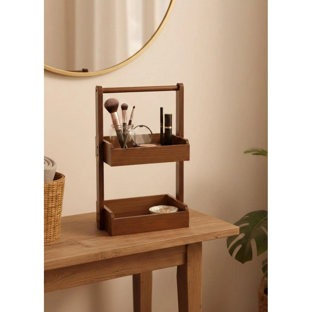 İki katlı tasarımı; makyaj malzemeleri, bakım ürünleri, takılar, mutfak baharatları ya da ofis aksesuarları için düzenli ve erişilebilir bir alan oluşturur. Minimal ve doğal görünümü sayesinde banyo, yatak odası, makyaj masası, mutfak tezgahı veya çalışma alanlarında dekoratif bir tamamlayıcı olarak kullanılabilir.