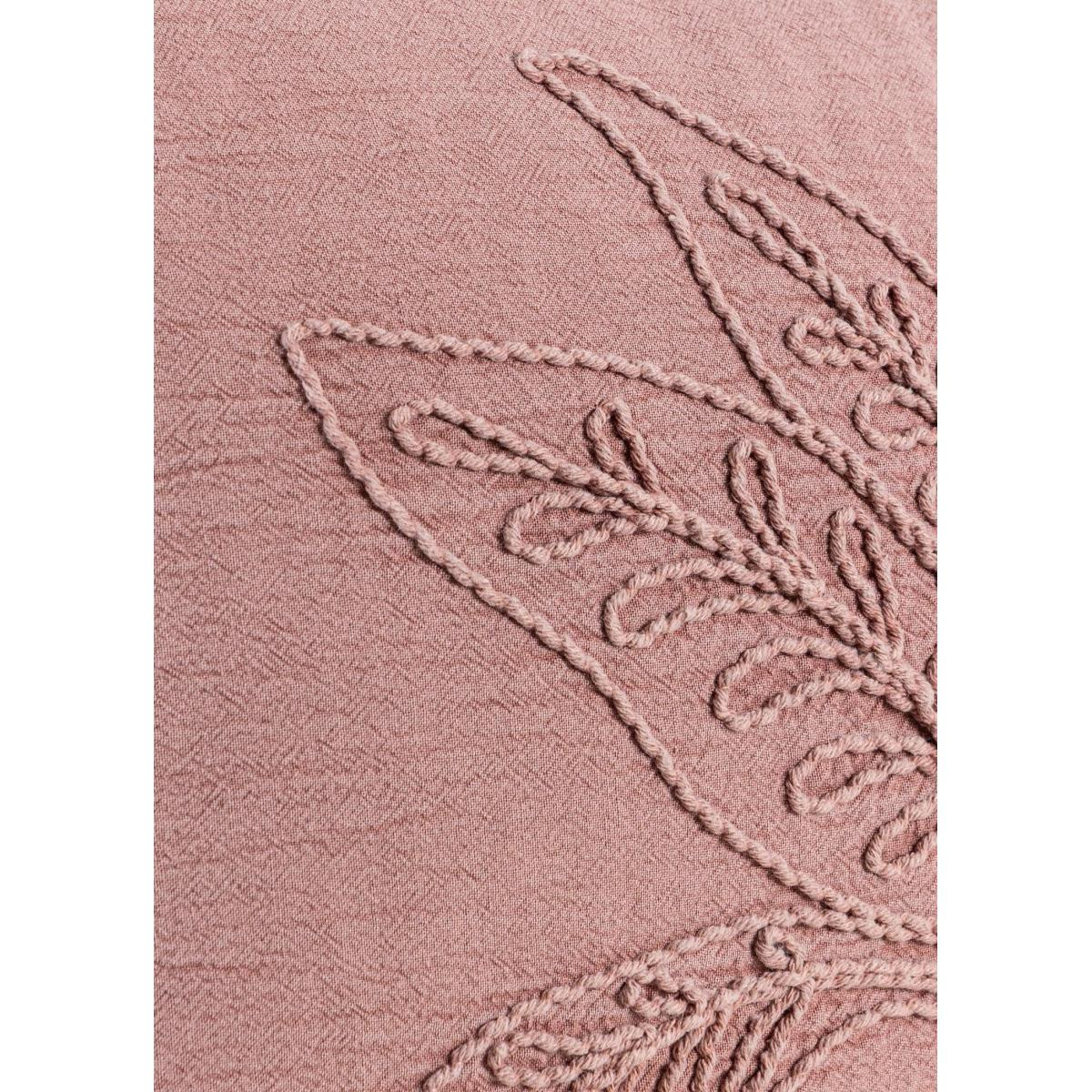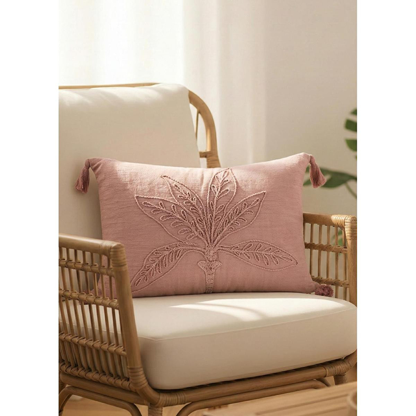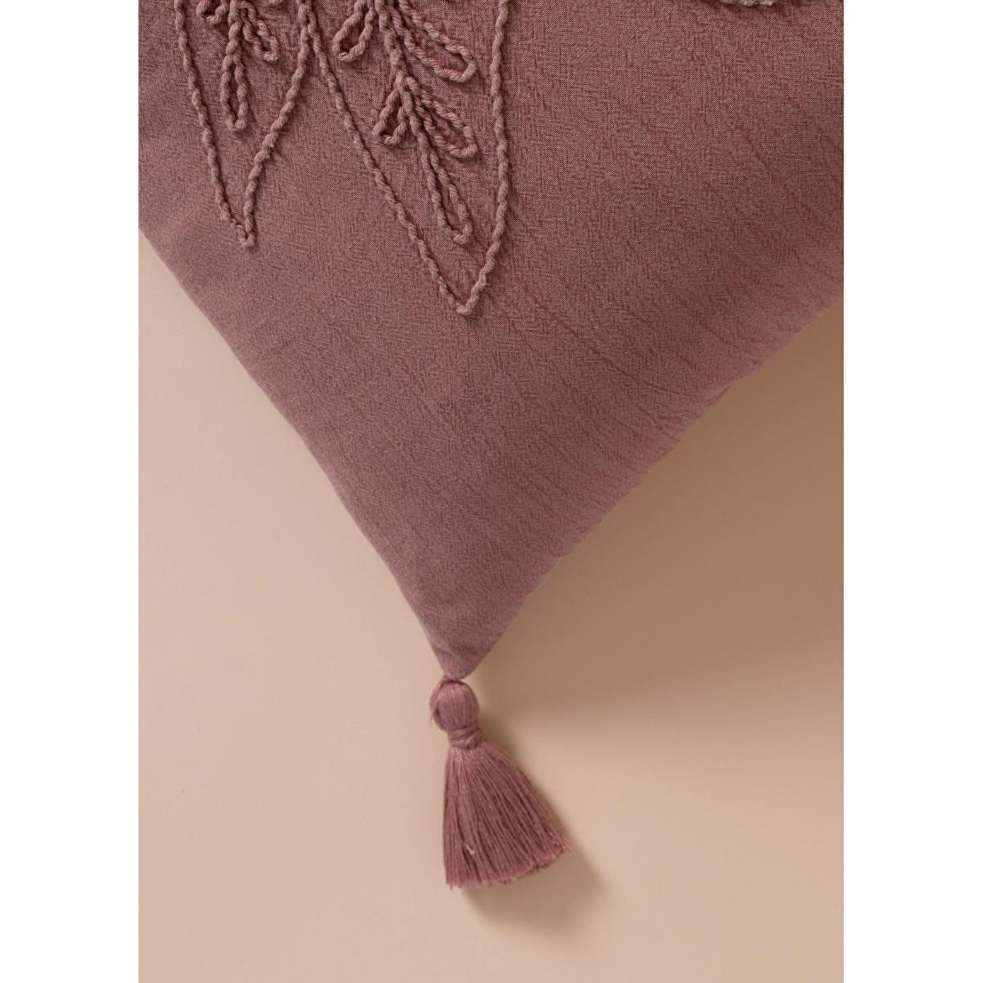 The Mia Gül Kurusu Desenli Kırlent, %100 pamuk dokusuyla doğal yumuşaklık sunarken, kabartmalı yaprak desen detayı ve köşe püskülleriyle yaşam alanlarına sıcak ve sofistike bir dokunuş kazandırır.