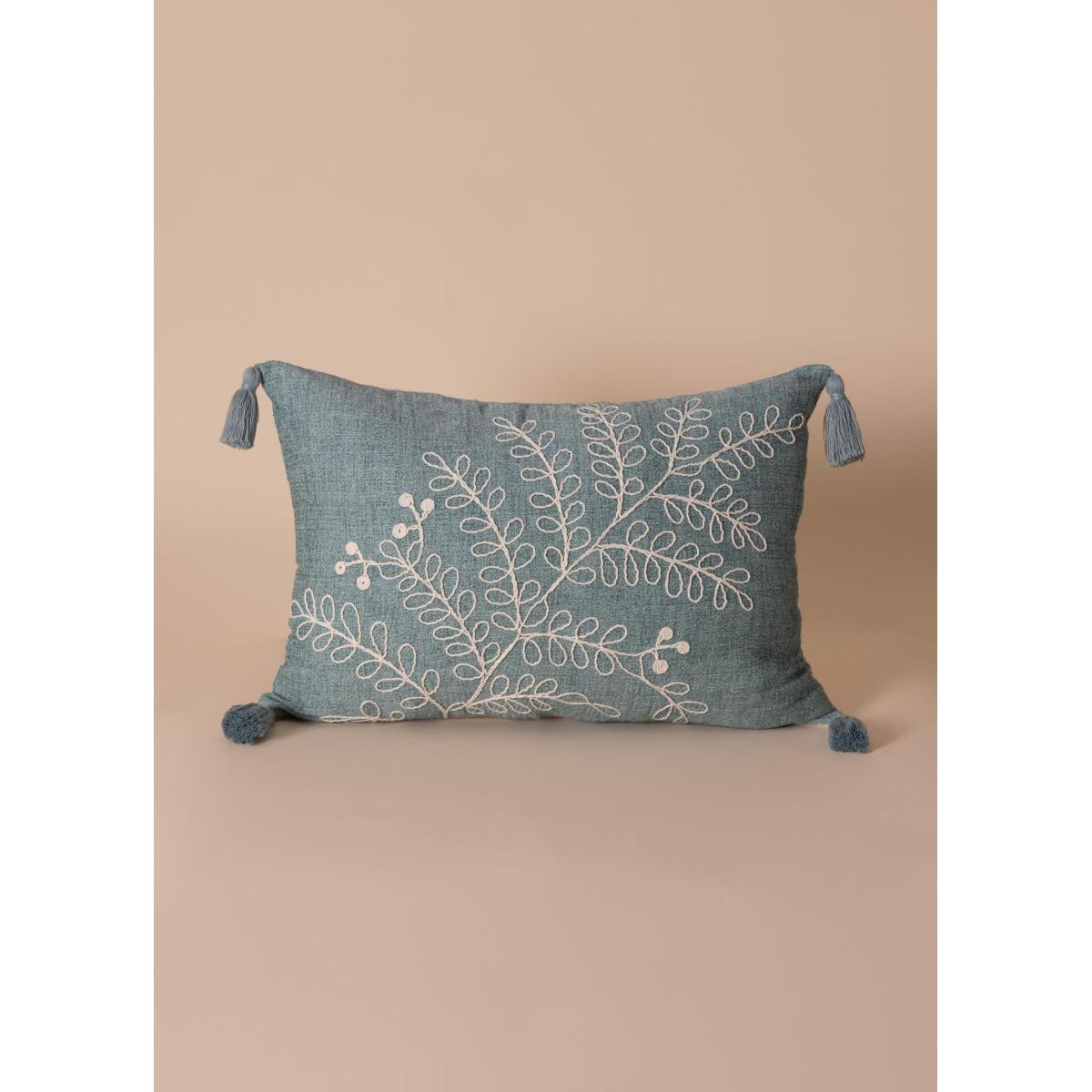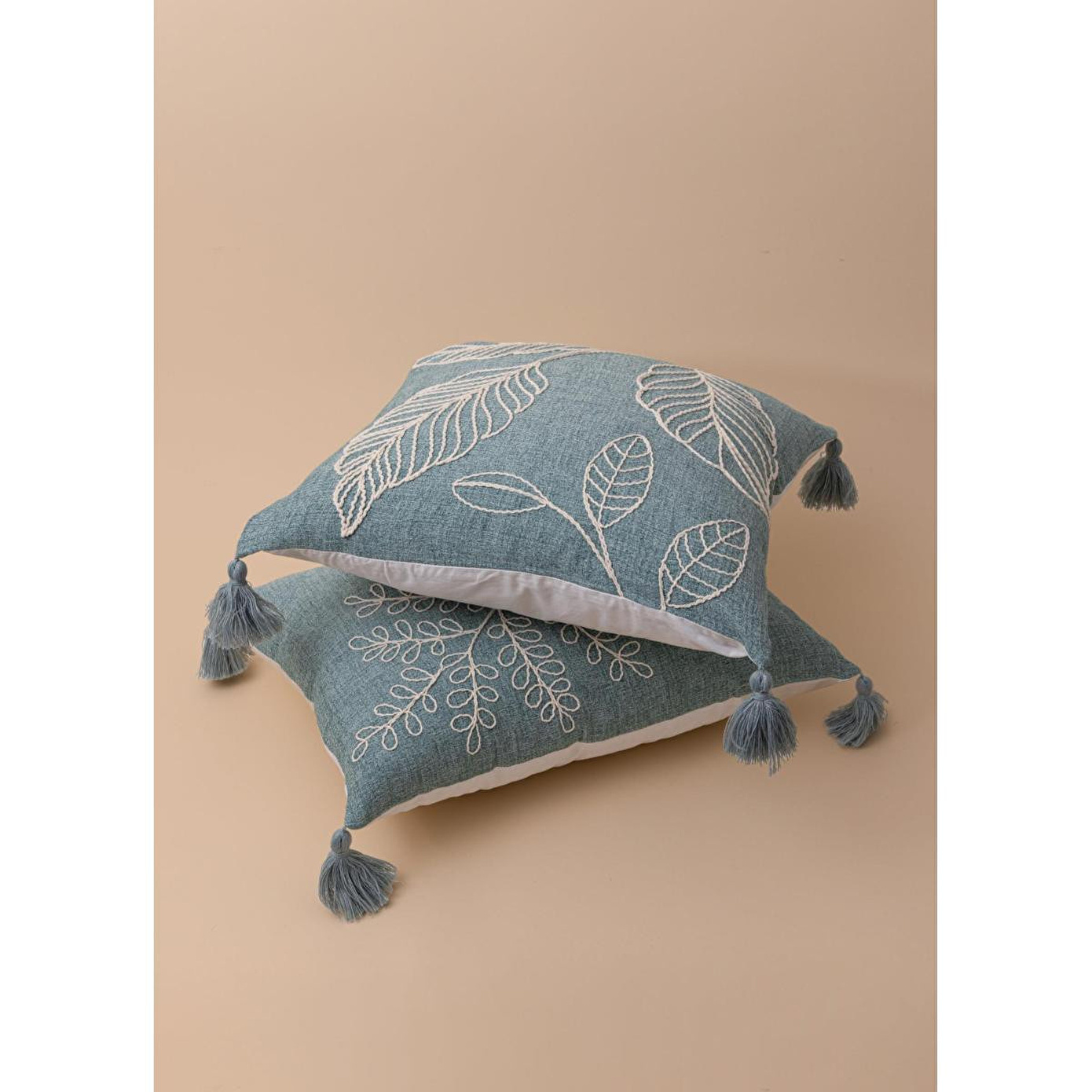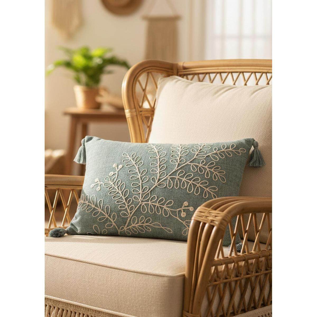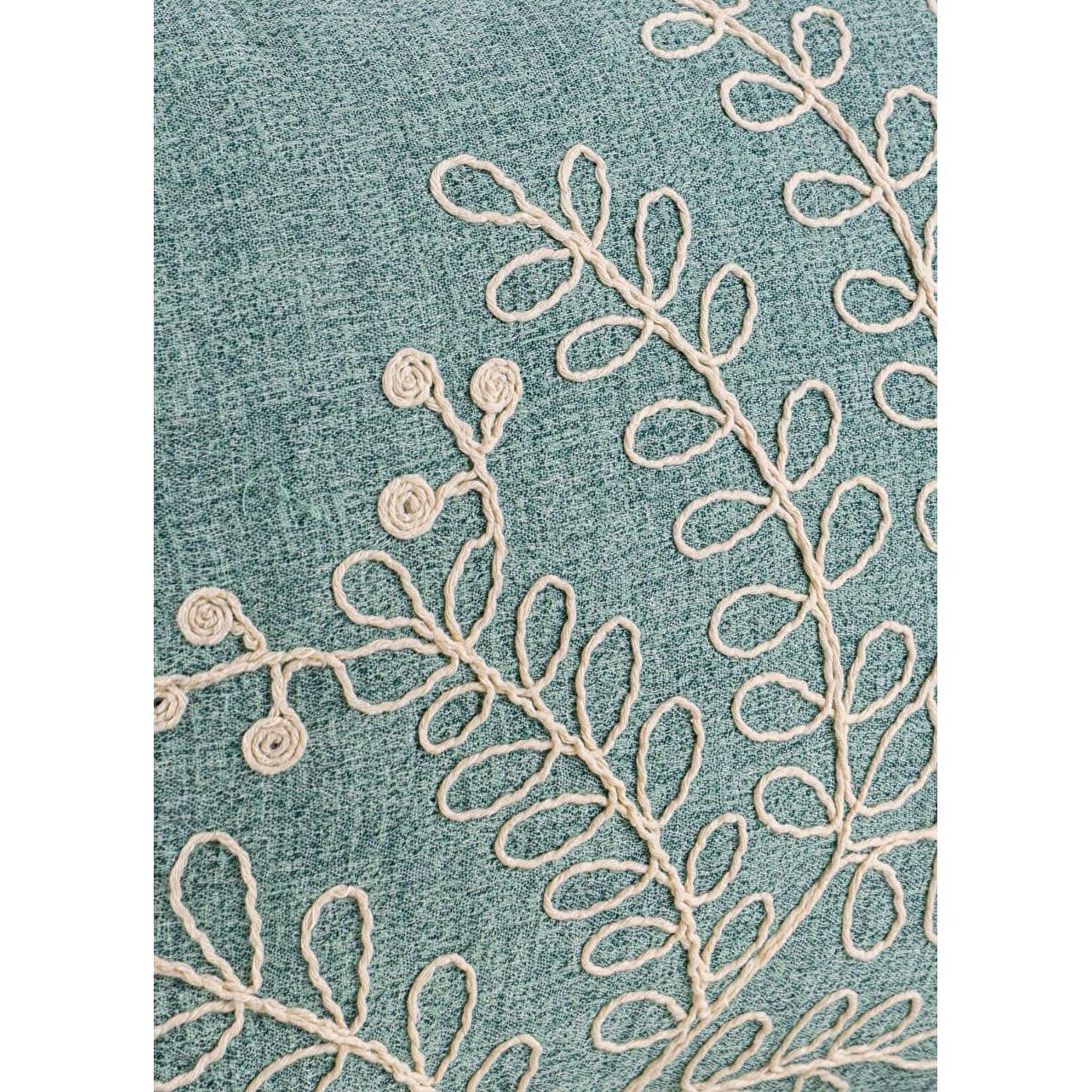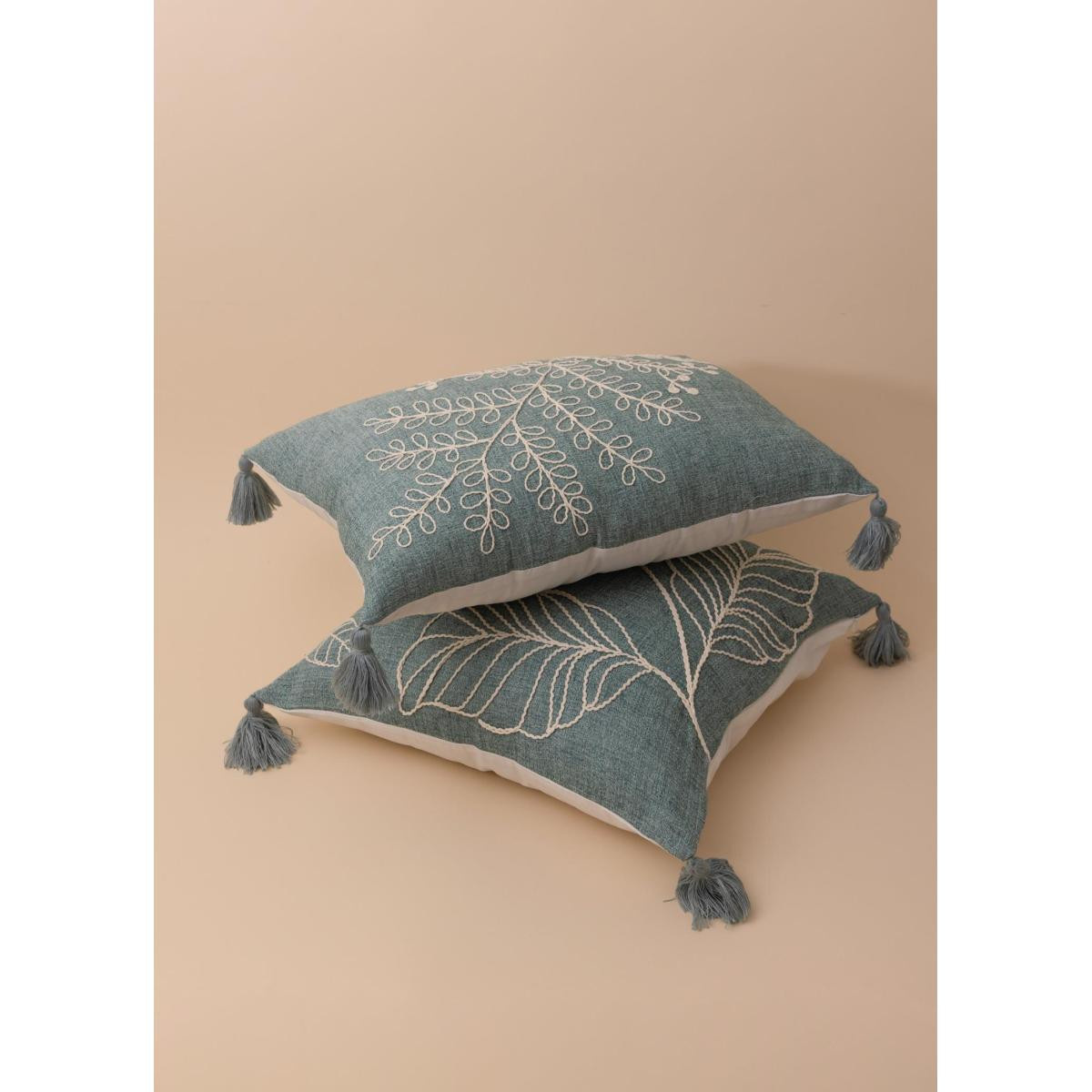 The Mia Yeşil Desenli Kırlent, %100 pamuk dokusuyla yumuşak ve nefes alabilen bir konfor sunarken, kabartmalı yaprak desen detayı ve köşe püskülleriyle dekorasyona sofistike bir hareket kazandırır.