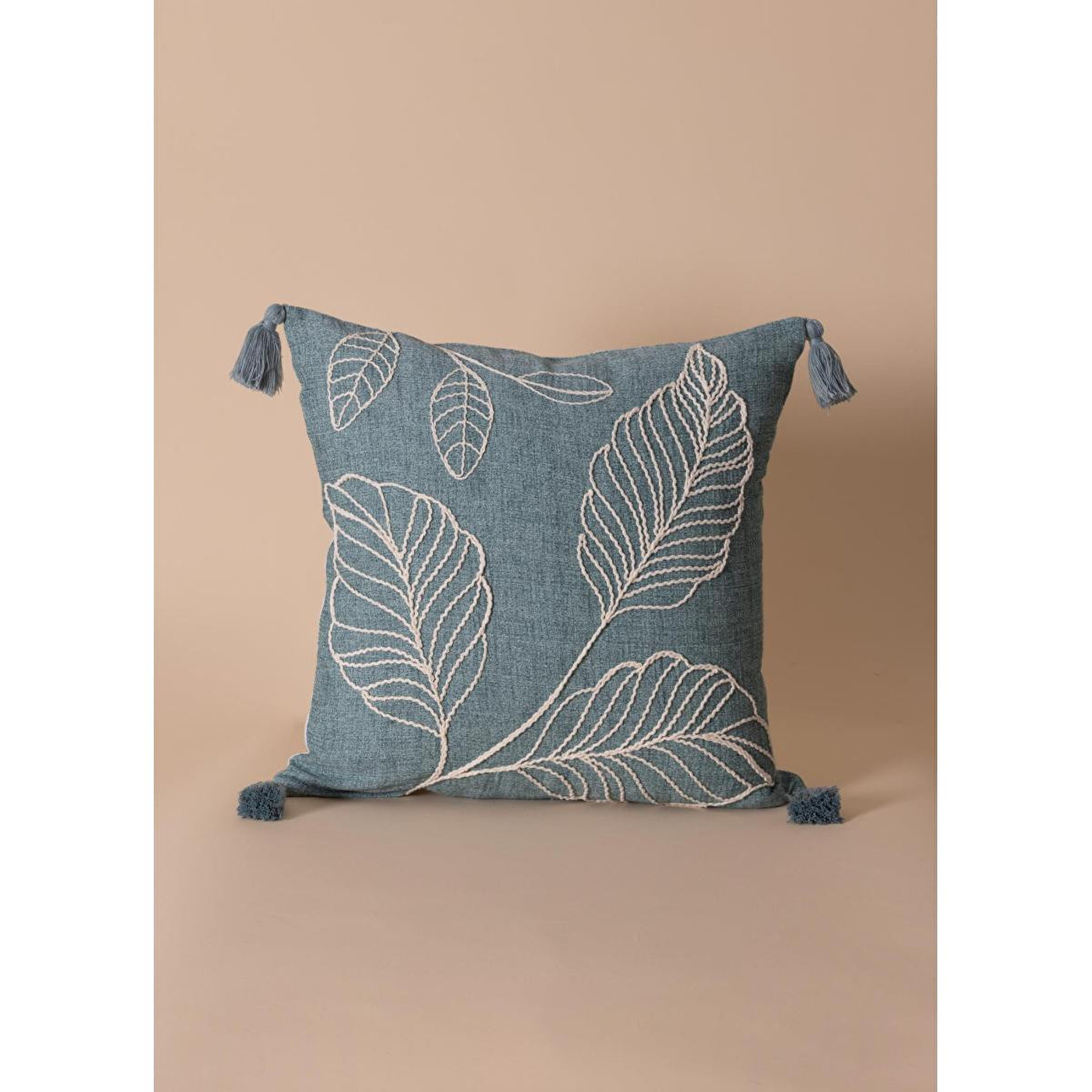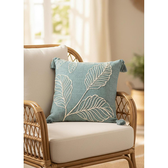 The Mia Yeşil Desenli Kırlent, %100 pamuk dokusuyla yumuşak ve nefes alabilen bir konfor sunarken, kabartmalı yaprak desen detayı ve köşe püskülleriyle dekorasyona zarif bir hareket kazandırır.