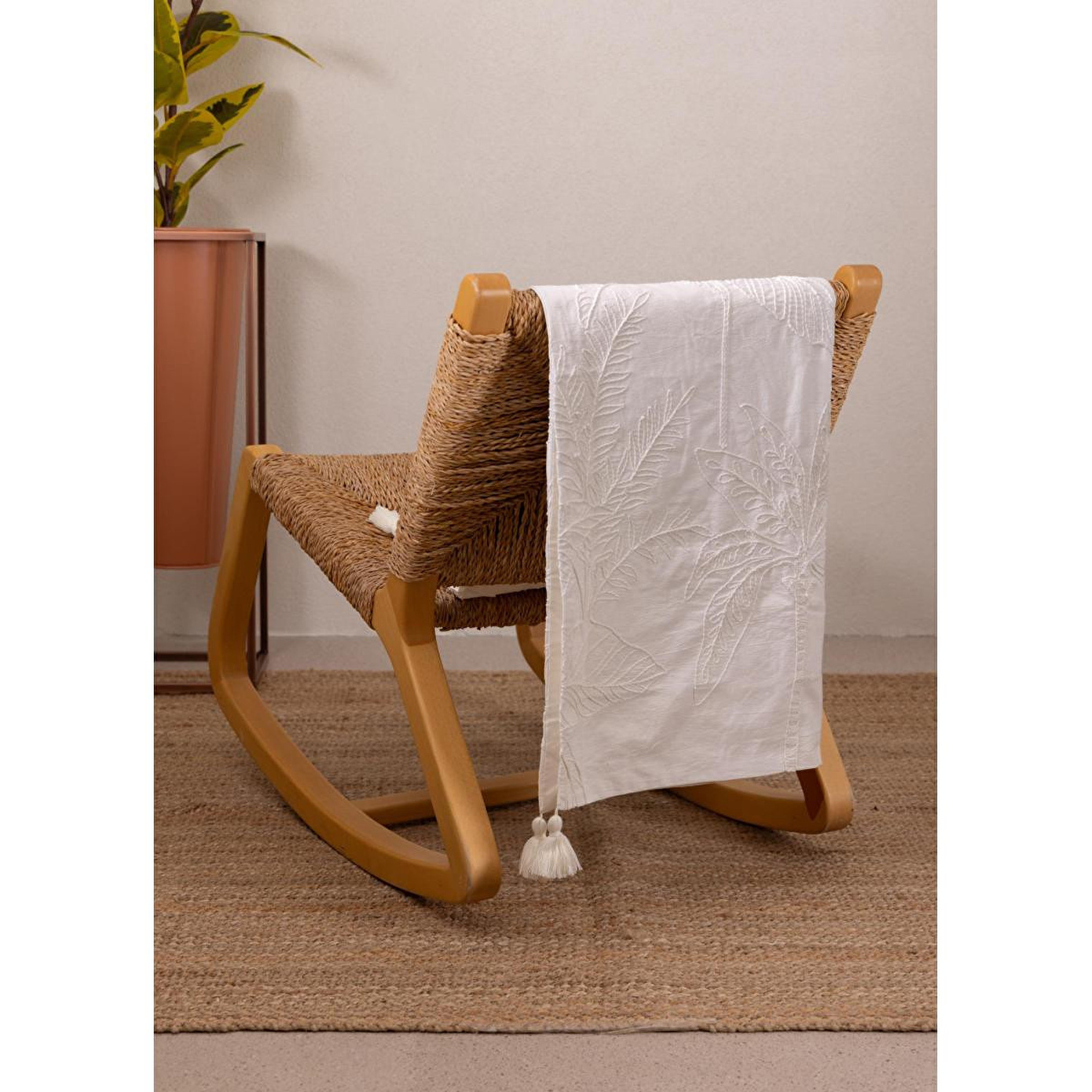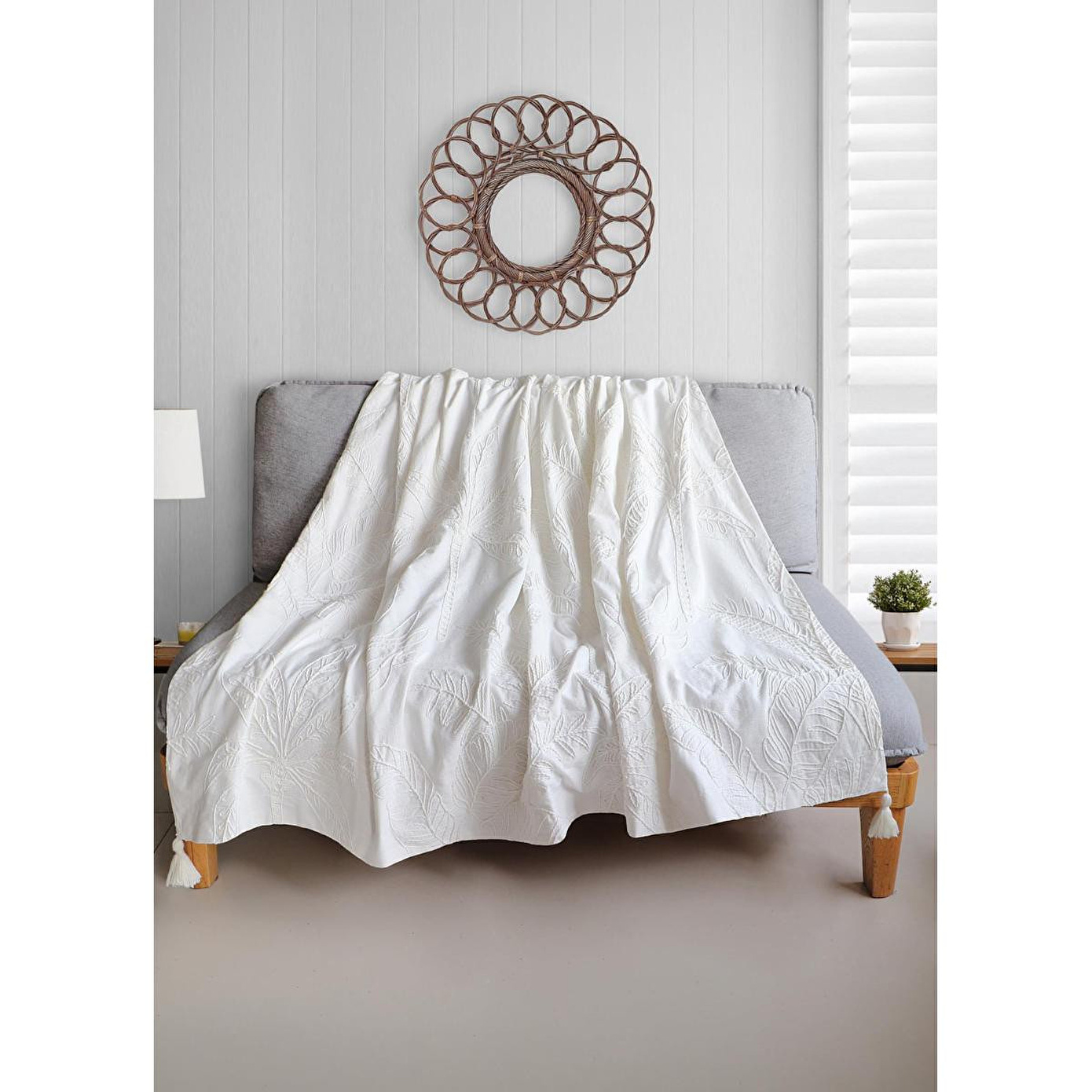 The Mia Krem Desenli Koltuk Şalı, %100 pamuk dokusuyla doğal ve nefes alabilen bir konfor sunarken, yüzeyindeki kabartmalı desen detayı ve zarif püskül bitişleriyle dekorasyona sofistike bir dokunuş kazandırır.