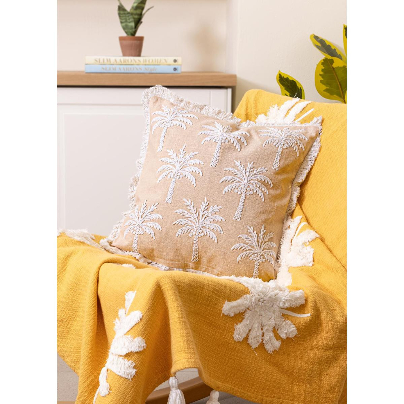 The Mia Pudra Tropikal Palmiye Desenli Kırlent, %100 pamuk dokusuyla doğal ve nefes alabilen bir konfor sunarken, yüzeyindeki kabartmalı palmiye desenleriyle dekorasyona hareket ve karakter kazandırır. Pudra tonunun yumuşak ve zarif etkisi, mekâna sakin ve dengeli bir atmosfer oluşturur.