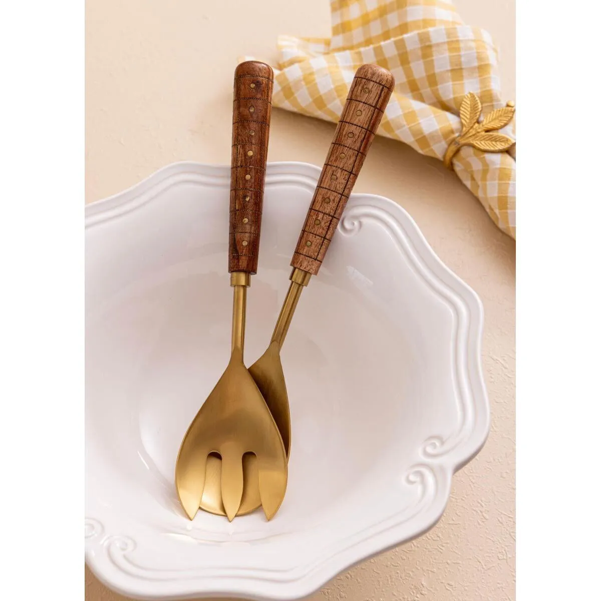 Premium PVD Kaplama: Mat gold yüzey, sıradan boyamalara göre çok daha dayanıklı olan PVD teknolojisi ile kaplanmıştır. Bu sayede uzun yıllar ilk günkü ışıltısını korur. Ergonomik Tasarım: 27 cm ideal uzunluğu ve doğal ahşap sapları, servis sırasında konforlu ve dengeli bir tutuş sağlar. İkonik Detaylar: Ahşap sap üzerindeki pirinç nokta süslemeler, ürüne el işçiliği zarafeti ve sofistike bir hava katarÜrün Özellikleri
