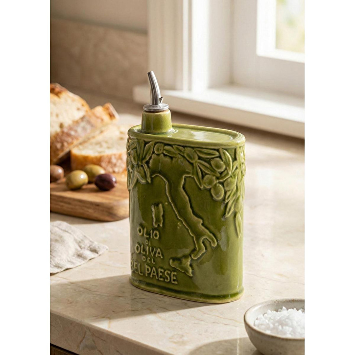 Özgün kabartmalı detayları ve İtalyan tasarım estetiği ile hem geleneksel hem de modern mutfak dekorasyonlarına kolaylıkla uyum sağlar. Parlak sır kaplaması, ürünün rengini canlı tutarken yüzeyinin kolay temizlenmesine yardımcı olur. Damlatmayan özel metal ağızlığı sayesinde kontrollü döküm imkânı sunar, tezgâh üzerinde yağ lekesi oluşmasını önler.
