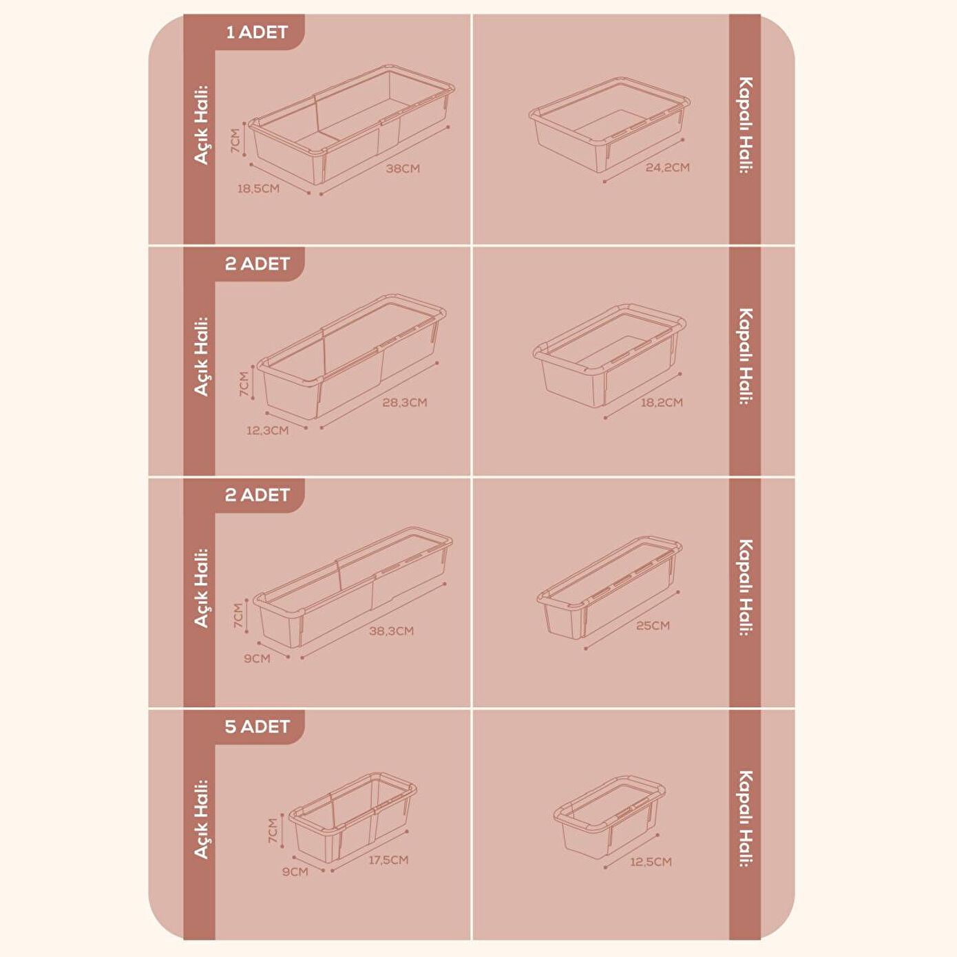 Makyaj malzemeleriniz, bakım ürünleriniz, ofis gereçleriniz veya mutfak araçlarınız artık dağınıklık yaratmasın! Vienev Ayarlanabilir Çekmece İçi Düzenleyici Kutular, farklı boy seçenekleriyle her ihtiyaca uyum sağlayan, modüler tasarımlı organizer çözümüdür. Boy Seçenekleri: No:1 – Dar Kısa: Sünger, toka, yüzük, ruj gibi küçük aksesuarlar için idealdir. Kompakt yapısıyla dar alanlarda bile işlevsellik sunar. Boyut: 9x12,5x7 cm ; Açık Hali: 9x17,5x7 cm No:2 – Geniş Kısa: Maskara, göz kalemi, kaş fırçası gibi uzun ama dar malzemeler için uygundur. Çekmecelerde yer tasarrufu sağlar. Boyut: 12,3x18,2x7 cm ; Açık Hali: 12,3x28,3x7 cm No:3 – Dar Uzun: Fırça setleri, paletler, taraklar gibi orta ebatlı ürünler için mükemmel çözüm sunar. Boyut: 9x25x7 cm ; Açık Hali: 9x38,3x7 cm No:4 – Geniş Uzun: Krem kavanozları, şişeler, spreyler gibi büyük hacimli ürünlerin güvenle saklanmasını sağlar. Boyut: 18,5x24,2x7 cm ; Açık Hali: 18,5x38x7 cm Özellikler: Sağlam Malzeme: Yüksek kaliteli plastikten üretilmiştir, uzun ömürlü ve temizliği kolaydır. Her Alana Uyumlu: Mutfak, banyo, makyaj masası, ofis çekmeceleri gibi birçok alanda kullanıma uygundur. Minimal ve Şık Görünüm: Nötr krem rengi, her dekorasyon stiline uyum sağlar.