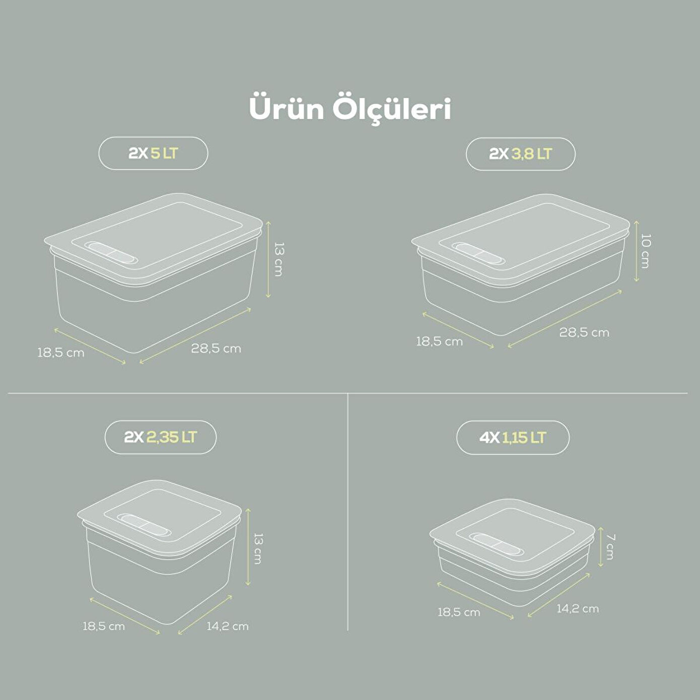 Bu hava kanal ayarlı plastik saklama kapları, mutfak düzeninizi yeniden tanımlayacak! İşlevsel özellikleri ve estetik tasarımıyla dikkat çeken kaplar, farklı renklerdeki kapak seçenekleriyle her zevke hitap ediyor.; Göz alıcı ve canlı renklere sahip kaplar sadece mutfaklarınıza renk katmakla kalmaz, aynı zamanda pratik kullanım avantajları da sunar.; ; ; Öne Çıkan Özellikler: ; İstiflenebilir Tasarım: Kullanım sonrasında minimal yer kaplaması için kolayca istiflenebilir.; ; Çok Amaçlı Kullanım: Sebze, meyve, kuru gıda ve daha fazlası için ideal.; ; Hava Geçirmez Kapaklar: Hava Kontrollü Ortam sistemi sayesinde meyve ve sebzeleri daha uzun süre taze tutmak için en uygun ortamı yaratır.; ; Dayanıklı Malzeme: Yüksek kaliteli plastikten üretilmiştir, kırılmaya ve deforme olmaya karşı dirençlidir.; ; Farklı Boyut Seçenekleri: Geniş ve dar alanlara uygun farklı boyutlarda seçenekler.; ; Malzeme: BPA içermeyen dayanıklı plastik.; ; Renk: Mint kapak seçenek.; ; Bakım: Bulaşık makinesinde yıkanabilir.; ; ; Kapağın üstünde yer alan kaydırıcı mekanizma 3 farklı pozisyonda kullanılabilir: ; 1- Yarım Açık: Kaydırıcı mekanizma, yarım daire ile hizalandığında, contadaki küçük açıklık hafif havalandırma için açılır.; ; 2- Kapalı: Kaydırıcı mekanizma, tamamen oyulmuş daire ile hizalandığında, contadaki her iki açıklık da kapatılır.; ; 3- Tam Açık: Kaydırıcı mekanizma, içi boş, parlak daire ile hizalandığında, contadaki büyük açıklık tam havalandırma için açılır.; ; ; Ürün Bilgileri ve Teknik Özellikler ; Ürün İçeriği Ölçü ve Hacimleri: ; 4 adet 1,15 Litre: 14,2x18,5x7 cm ; 2 adet 2,35 Litre: 14,2x18,5x13 cm ; 2 adet 3,8 Litre: 18,5x28,5x10 cm ; 2 adet 5 Litre: 18,5x28,5x13 cm ; ; Kullanım Alanları: ; Mutfak: Yiyeceklerinizi düzenli ve taze saklamanızı sağlar.; ; Kalabalık Aileler: Çok sayıda kişi için uygun miktarda yiyecek depolama kapasitesi.; ; Piknik veya Seyahat: Hafif ve taşınabilir yapısıyla dış mekân aktivitelerinizde yanınızda taşıyabilirsiniz.; ; ; Kaliteli malzemesiyle uzun süreli kullanım sunan bu saklama kapları, hem pratik hem de şık bir çözüm arayanlar için vazgeçilmez bir yardımcı olacak.; Mutfaklarınızın düzeni ve hijyeni için mutlaka edinmeniz gereken bir set! ;