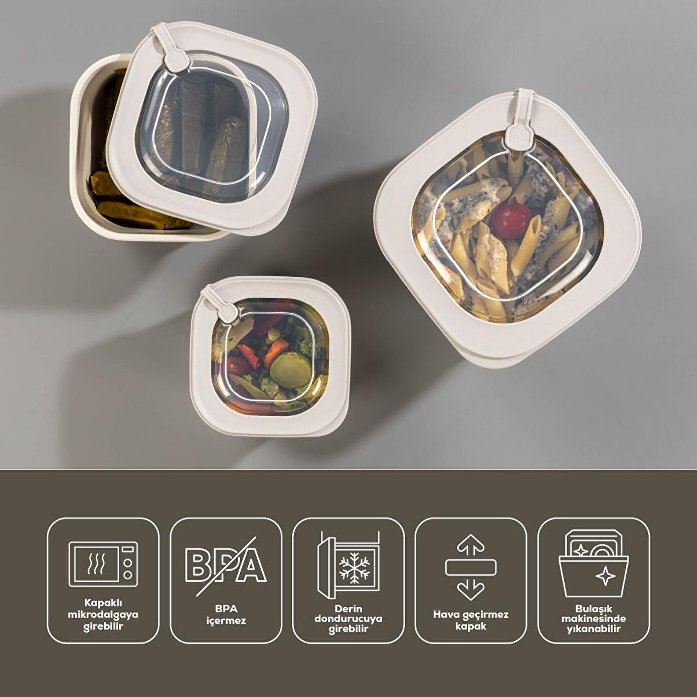 Günlük yaşamın pratik çözümü: 3'lü Mikrodalga ve Dondurucuya Uygun VIP Kapaklı Özel Saklama Kabı Seti! Bu set, farklı boyutlardaki üç kap ile yiyeceklerinizi en uygun şekilde saklamanızı sağlar.; Mikrodalga ve dondurucuya uygun yapısıyla yemeklerinizi hem hızlıca ısıtabilir hem de uzun süre taze tutabilirsiniz.; Ürün Hacim ve Ölçüleri: 600 ml : 12,5 x 12,5 x 7 cm 1100 ml : 15 x 15 x 8,5 cm 1800 ml : 18 x 18 x 10 cm Özellikler: Mikrodalgaya Uygun: BPA içermeyen malzemesi sayesinde güvenle yiyeceklerinizi ısıtabilirsiniz.; Dondurucu Dostu: Sağlam yapısı ile düşük sıcaklıklara dayanıklı, yiyeceklerinizi bozulmadan saklar.; VIP Kapak Teknolojisi: Kapaklarında ki kilit mekanizması tam açık konumda güvenle mikrodalga fırında kullanılabilir 3 Farklı Boyut: Çeşitli ihtiyaçlarınıza göre tasarlanmış farklı boyutlardaki kaplar.; Kolay Temizlik: Bulaşık makinesinde yıkanabilir, temizlemesi kolaydır.; Sağlıklı ve Güvenli: Yüksek kaliteli, gıda ile temasa uygun plastikten üretilmiştir.; Bu set, mutfaktaki işlerinizi kolaylaştırırken aynı zamanda şık tasarımıyla da dikkat çeker.; Hem işlevselliği hem de estetiği bir arada sunan 3'lü VIP Saklama Kabı Seti, mutfaktaki en büyük yardımcınız olacak!