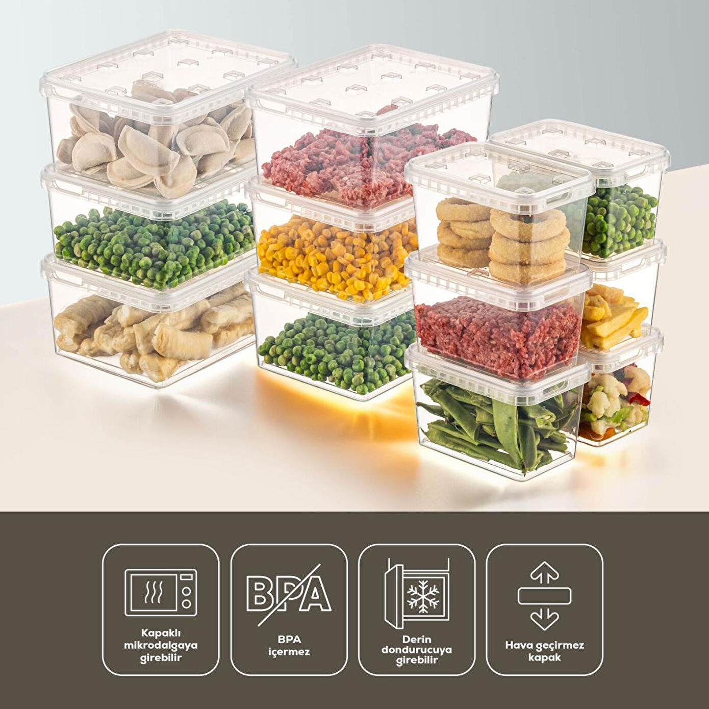12li 6x(1,5-0,7 lt) Block Buzdolabı ve Derin Dondurucu Sızdırmaz Saklama Kabı Şeffaf; ; Gıda saklama alışkanlıklarınızı değiştirecek, kullanımı kolay ve şık tasarımıyla öne çıkan Block Buzdolabı ve Derin Dondurucu Sızdırmaz Saklama Kabı ile tanışın! Bu kullanım dostu saklama kapları ile gıdalarınızı daha uzun süre taze tutarken, düzenlemesi kolay ve mutfağınıza estetik bir dokunuş katabilirsiniz.; ; ; Öne Çıkan Özellikler ; ; Sızdırmaz Tasarım: Sızıntıyı önleyen kapakları sayesinde sıvıları güvenle saklayabilirsiniz.; ; Farklı Boyut Seçenekleri: 1,5 lt ve 0,7 lt kapasiteleri ile çeşitli gıdalarınızı depolayabilirsiniz.; ; Şeffaf Malzeme: İçindekileri kolayca görebilmenizi sağlar.; ; Buzdolabı ve Derin Dondurucu Uyumlu: Hem buzdolabınızda hem de derin dondurucunuzda rahatlıkla kullanabilirsiniz.; ; Kullanım Kolaylığı: Pratik ve ergonomik tasarımı ile günlük hayatınızı kolaylaştırır.; ; ; ; Ürün Faydaları ; Daha Uzun Süre Tazelik: Sızdırmaz özellikteki kapaklar, gıdalarınızı hava ile temas ettirmeyerek daha uzun süre taze tutar.; ; Daha Az İsraf: Gıdalarınızı düzenli bir şekilde saklayarak israfı önler.; ; Kolay Görüntüleme: Şeffaf yapısı sayesinde aradığınız yiyeceği hızlı bir şekilde bulabilirsiniz.; ; Yer Tasarrufu: Üst üste dizilebilen tasarımı ile mutfak ve derin dondurucu alanından tasarruf sağlar.; ; Sağlıklı Depolama: BPA içermeyen malzemesi ile sağlıklı ve güvenilir gıda saklama imkanı sunar.; ; ; Ürün Özellikleri ; Kapasite: 6 adet 1,5 lt ve 6 adet 0,7 lt kapasitelidir.; ; Ürün Ölçüleri: ; 1,5 Lt : 13,5x18x8 cm ; 0,7 Lt: 9x13,5x8 cm ; Malzeme: Dayanıklı ve sağlığa uygun plastik malzemeden üretilmiştir.; ; Ağırlık: Hafif yapıdadır, kolay taşınır.
