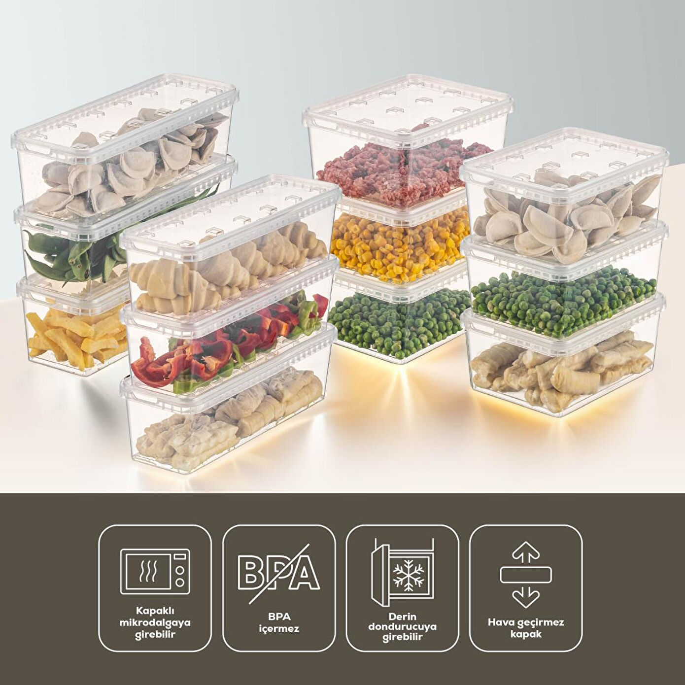12li 6x(1,5-1,4 lt) Block Buzdolabı ve Derin Dondurucu Sızdırmaz Saklama Kabı Şeffaf ; ; Gıda saklama alışkanlıklarınızı değiştirecek, kullanımı kolay ve şık tasarımıyla öne çıkan Block Buzdolabı ve Derin Dondurucu Sızdırmaz Saklama Kabı ile tanışın! Bu kullanım dostu saklama kapları ile gıdalarınızı daha uzun süre taze tutarken, düzenlemesi kolay ve mutfağınıza estetik bir dokunuş katabilirsiniz.; ; ; Öne Çıkan Özellikler ; ; Sızdırmaz Tasarım: Sızıntıyı önleyen kapakları sayesinde sıvıları güvenle saklayabilirsiniz.; ; Farklı Boyut Seçenekleri: 1,5 lt ve 1,4 lt kapasiteleri ile çeşitli gıdalarınızı depolayabilirsiniz.; ; Şeffaf Malzeme: İçindekileri kolayca görebilmenizi sağlar.; ; Buzdolabı ve Derin Dondurucu Uyumlu: Hem buzdolabınızda hem de derin dondurucunuzda rahatlıkla kullanabilirsiniz.; ; Kullanım Kolaylığı: Pratik ve ergonomik tasarımı ile günlük hayatınızı kolaylaştırır.; ; ; ; Ürün Faydaları ; Daha Uzun Süre Tazelik: Sızdırmaz özellikteki kapaklar, gıdalarınızı hava ile temas ettirmeyerek daha uzun süre taze tutar.; ; Daha Az İsraf: Gıdalarınızı düzenli bir şekilde saklayarak israfı önler.; ; Kolay Görüntüleme: Şeffaf yapısı sayesinde aradığınız yiyeceği hızlı bir şekilde bulabilirsiniz.; ; Yer Tasarrufu: Üst üste dizilebilen tasarımı ile mutfak ve derin dondurucu alanından tasarruf sağlar.; ; Sağlıklı Depolama: BPA içermeyen malzemesi ile sağlıklı ve güvenilir gıda saklama imkanı sunar.; ; ; Ürün Özellikleri ; Kapasite: 6 adet 1,5 lt ve 6 adet 1,4 lt kapasitelidir.; ; Ürün Ölçüleri: ; 1,5 Lt : 13,5x18x8 cm ; 1,4 Lt:9x27x8 cm ; Malzeme: Dayanıklı ve sağlığa uygun plastik malzemeden üretilmiştir.; ; Ağırlık: Hafif yapıdadır, kolay taşınır.