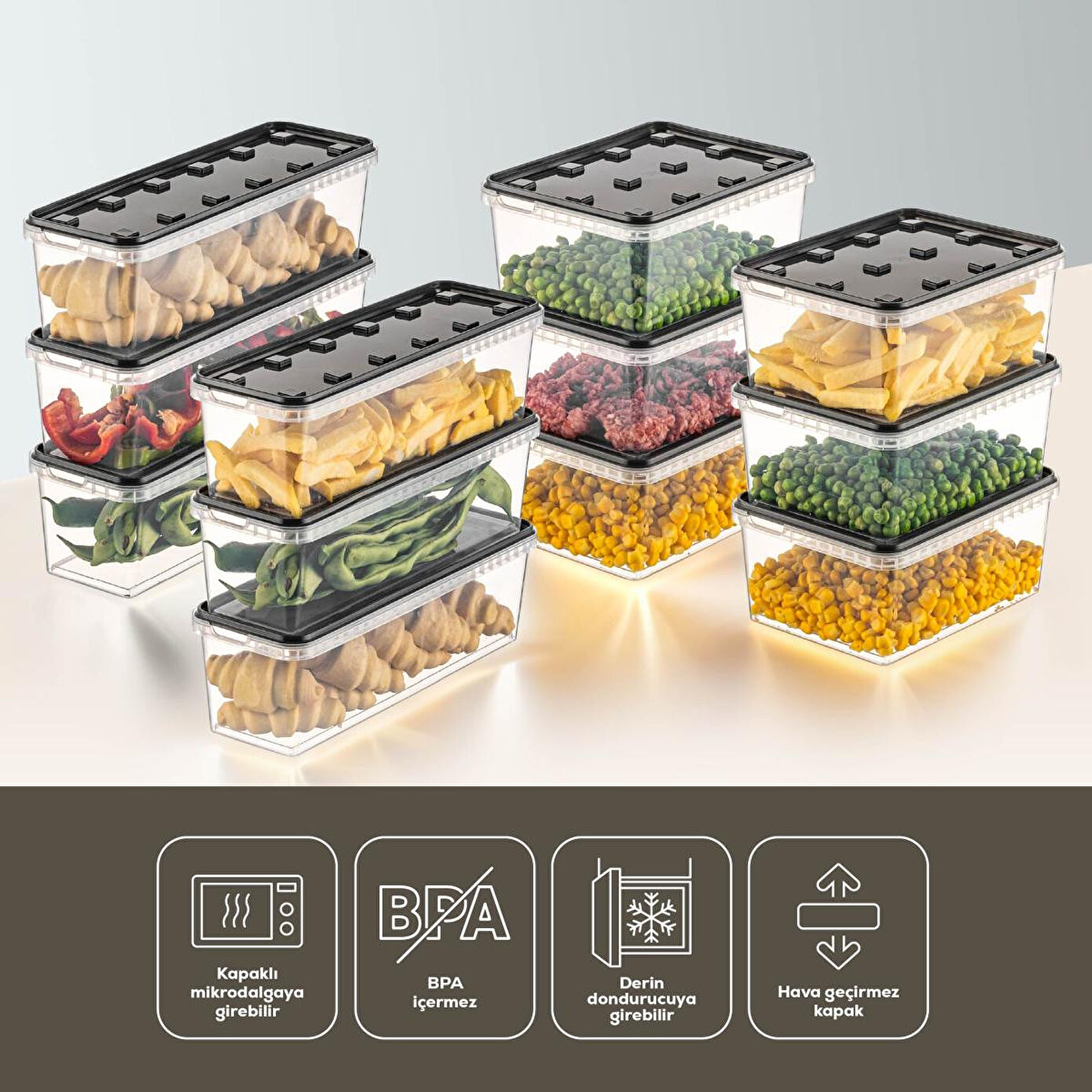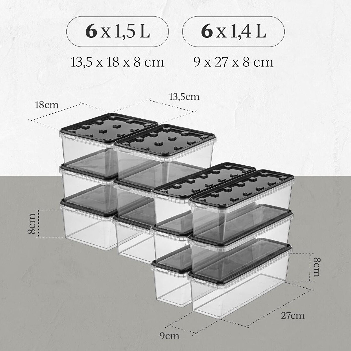 12li 6x(1,5-1,4 LT) Block Buzdolabı Ve Derin Dondurucu Sızdırmaz Saklama Kabı Şeffaf Antrasit; ; Gıda saklama alışkanlıklarınızı değiştirecek, kullanımı kolay ve şık tasarımıyla öne çıkan Block Buzdolabı ve Derin Dondurucu Sızdırmaz Saklama Kabı ile tanışın! Bu kullanım dostu saklama kapları ile gıdalarınızı daha uzun süre taze tutarken, düzenlemesi kolay ve mutfağınıza estetik bir dokunuş katabilirsiniz.; ; ; Öne Çıkan Özellikler ; ; Sızdırmaz Tasarım: Sızıntıyı önleyen kapakları sayesinde sıvıları güvenle saklayabilirsiniz.; ; Farklı Boyut Seçenekleri: 1,5 lt ve 1,4 lt kapasiteleri ile çeşitli gıdalarınızı depolayabilirsiniz.; ; Şeffaf Malzeme: İçindekileri kolayca görebilmenizi sağlar.; ; Buzdolabı ve Derin Dondurucu Uyumlu: Hem buzdolabınızda hem de derin dondurucunuzda rahatlıkla kullanabilirsiniz.; ; Kullanım Kolaylığı: Pratik ve ergonomik tasarımı ile günlük hayatınızı kolaylaştırır.; ; ; ; Ürün Faydaları ; Daha Uzun Süre Tazelik: Sızdırmaz özellikteki kapaklar, gıdalarınızı hava ile temas ettirmeyerek daha uzun süre taze tutar.; ; Daha Az İsraf: Gıdalarınızı düzenli bir şekilde saklayarak israfı önler.; ; Kolay Görüntüleme: Şeffaf yapısı sayesinde aradığınız yiyeceği hızlı bir şekilde bulabilirsiniz.; ; Yer Tasarrufu: Üst üste dizilebilen tasarımı ile mutfak ve derin dondurucu alanından tasarruf sağlar.; ; Sağlıklı Depolama: BPA içermeyen malzemesi ile sağlıklı ve güvenilir gıda saklama imkanı sunar.; ; ; Ürün Özellikleri ; Kapasite: 6 adet 1,5 lt ve 6 adet 1,4 lt kapasitelidir.; ; Ürün Ölçüleri: ; 1,5 Lt : 13,5x18x8 cm ; 1,4 Lt: 9x27x8 cm ; Malzeme: Dayanıklı ve sağlığa uygun plastik malzemeden üretilmiştir.; ; Ağırlık: Hafif yapıdadır, kolay taşınır.