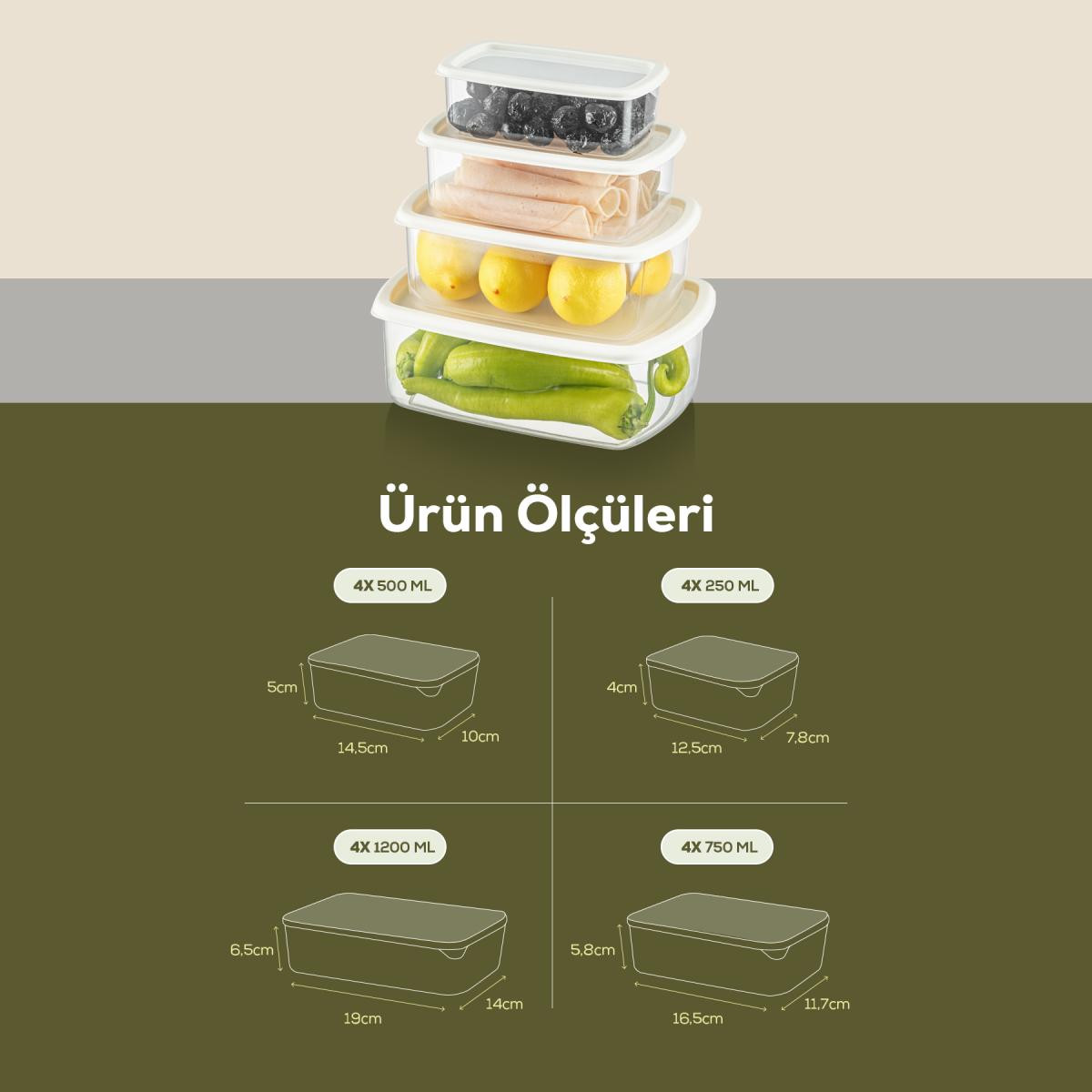 Ürün Hacim ve Ölçüleri: ; 250 ml: 7,8 x 12,5 x 4 cm ; 500 ml: 10 x 14,5 x 5 cm ; 750 ml: 11,7 x 16,5 x 5,8 cm ; 1200 ml: 14 x 19 x 6,5 cm