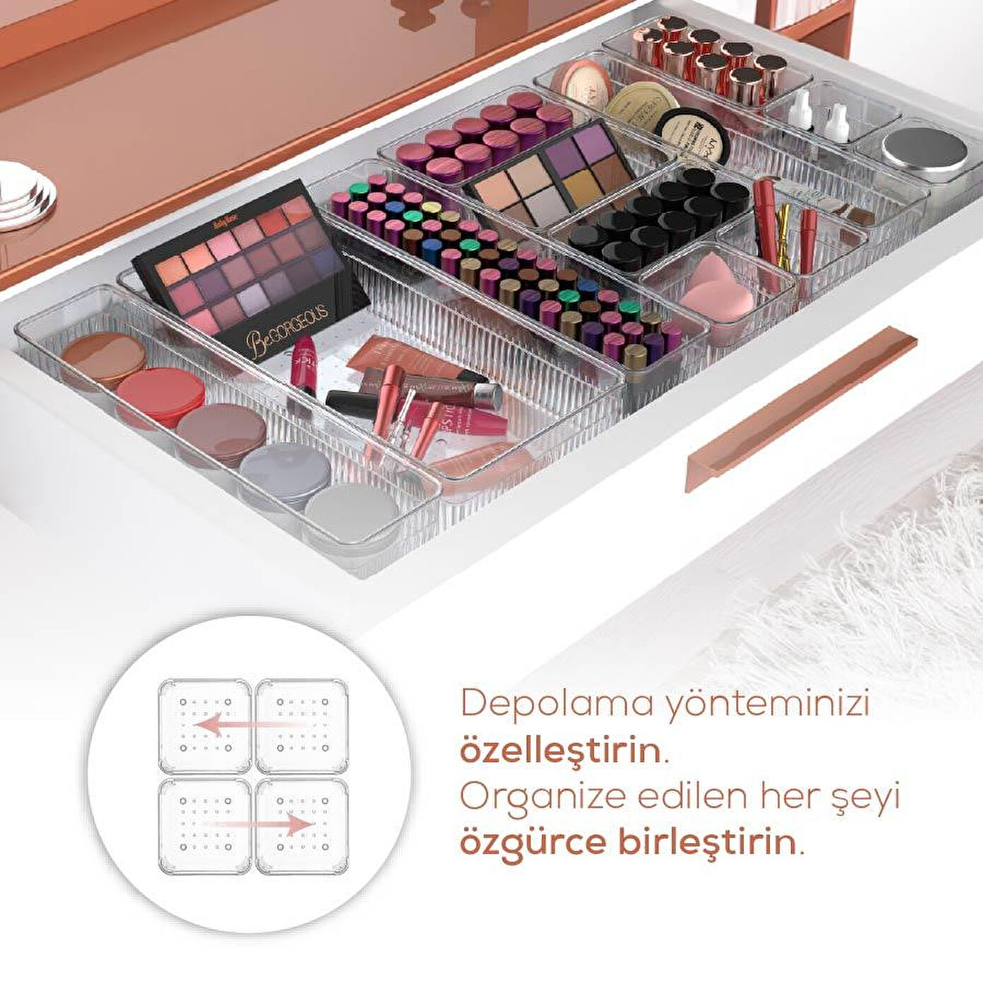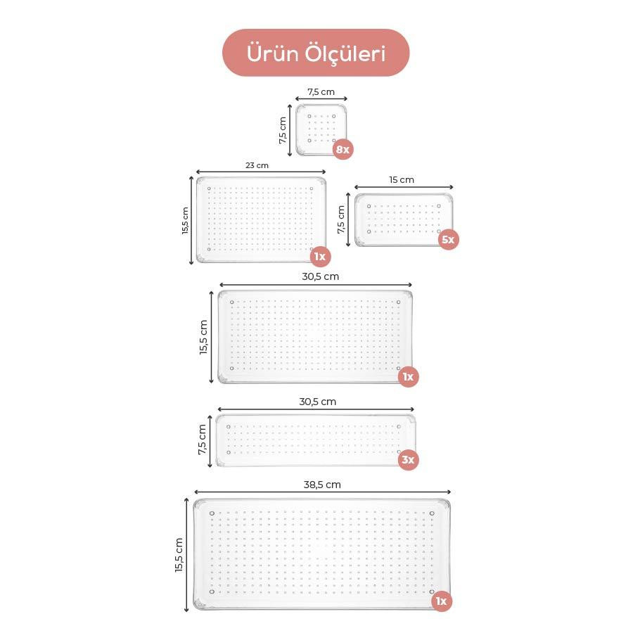 19lu Dolap İçi Çekmece Düzenleyici Mutfak Çekmece İçi Kaşıklı Organizer ; ; 19'lu Dolap İçi Takı Makyaj Organizer ile evinizde düzeni sağlamak artık çok kolay! Makyaj malzemelerinizden takılarınıza kadar her türlü eşyayı düzenleyebileceğiniz bu şeffaf çekmece içi düzenleyici set, şıklığı ve işlevselliği bir araya getiriyor.; ; ; Özellikler: ; Küçük Kare: 8 adet 7,5x7,5x5,5 cm / Hacim: 250 ml ; Dar Dikdörtgen: 3 adet 30,5x7,5x5,5 cm / Hacim: 1,1 Litre ; Büyük Dikdörtgen: 1 adet 30,5x15,5x5,5 cm / Hacim: 2,2 Litre ; Orta Dikdörtgen: 1 adet 23x15,5x5,5 cm / Hacim: 1,6 Litre ; Küçük Dikdörtgen: 5 adet 15x7,5x5,5 cm / Hacim: 500 ml ; Maxi Dikdörtgen: 1 adet 37,5x15x5,5 cm / Hacim: 2,8 Litre ; Yüksek kaliteli şeffaf plastik malzeme ; 19 ayrı bölme ile geniş depolama alanı ; Modüler tasarım: İhtiyacınıza göre düzenleme imkanı ; Kolay temizlenebilir yüzey ; Çekmece içi, masa üstü, mutfak tezgahı üstü kullanıma uygun ; ; Avantajlar: ; Makyaj malzemeleriniz, takılarınız ve diğer küçük eşyalarınız için mükemmel düzen çözümleri ; Dolap içi ve çekmece içi kullanımı ile alan tasarrufu sağlar ; Şeffaf tasarımı sayesinde aradığınız eşyayı kolayca bulabilirsiniz ; Estetik ve modern görünüm ile her türlü dekorasyona uyum sağlar ; Kolay temizlenebilir ve uzun ömürlü kullanım ; ; Çeşitli Kullanım Alanları: Bu organizatörler, mutfak çekmecelerini bıçaklar, çatallar ve kaşıklarla düzenlemekten, ofis çekmecelerini kalem, not kağıdı ofis malzemeleri ve makyaj takı malzemelerini düzenlemeye kadar pek çok farklı alanda kullanılabilirler.