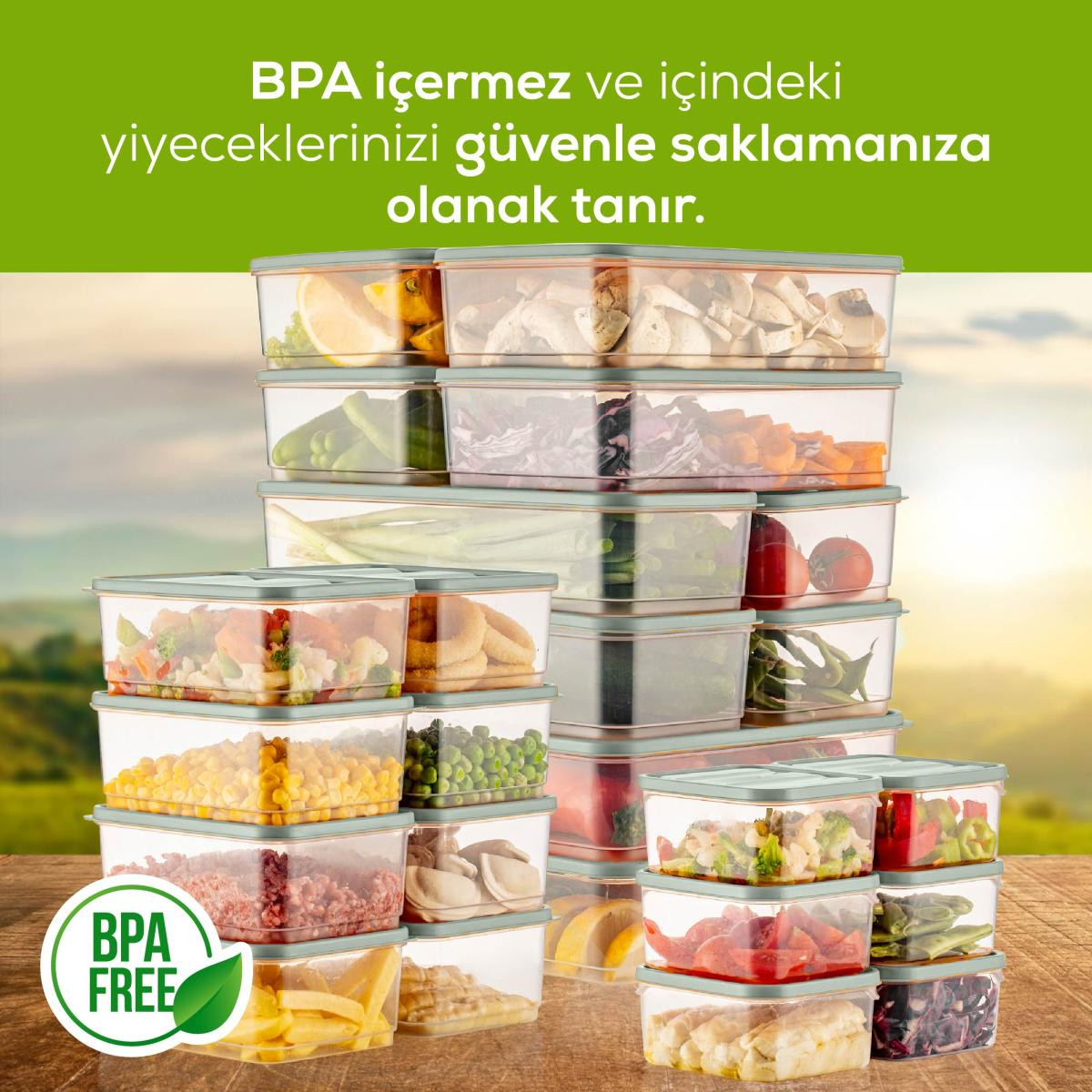 24lü Buzdolabı Düzenleyici Organizer Mikrodalgaya Uygun Difriz Saklama Kabı Mint; ; Evinizde düzeni ve tazeliği bir arada sunan harika bir çözüm! 24'lü Buzdolabı Dondurucu Organizer seti, saklama ihtiyaçlarınızı karşılamada ideal bir yardımcıdır.; Bu set ile mutfağınız artık daha düzenli ve ferah olacak.; ; ; Faydalar: ; 5 farklı boyut ve kapasite ile tüm saklama ihtiyaçlarınıza uygun ; Dayanıklı ve yüksek kaliteli plastik malzemeden imal edilmiş ; Mikrodalga ve difrize dayanıklı ; Hijyenik ve sağlıklı saklama imkanı ; Şeffaf yapısı ile içindeki malzemeleri kolayca görebilme ; Mint kapak rengi ile mutfağınıza şıklık katacak tasarım ; ; Ürün Özellikleri: ; Set içeriği: 24 adet saklama kabı ; 6 Adet 350 ml :9 x 10,5 x 5,5 cm ; 8 Adet 775 ml: 11x 14,5 x6 cm ; 4 Adet 1,65 lt: 11 x 30 x 7 cm ; 4 Adet 1,75 lt: 23 x 15 x 7 cm ; 2 Adet 3,5 lt: 23 x 29,5 x 6,5 cm ; Malzeme: Yüksek kaliteli plastik, Bpa içermez.; ; Renk: Mint ; Mikrodalgada ve difrizde güvenle kullanılabilir ; Sızdırmaz kapakları ile maksimum tazelik koruma ; ; Her birini farklı amaçlar için kullanabilir, sebze, meyve, kuru bakliyat, kahvaltılıklar veya yiyecek artıklarını güvenle saklayabilirsiniz.; Buzdolabınızdaki ve derin dondurucunuzdaki kaosu ortadan kaldırın, tazeliği ve düzeni sağlayın, mutfağınıza şıklık katın ve düzenin keyfini çıkarın! ;