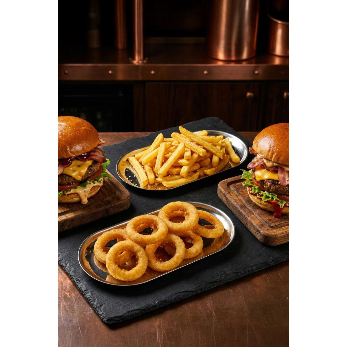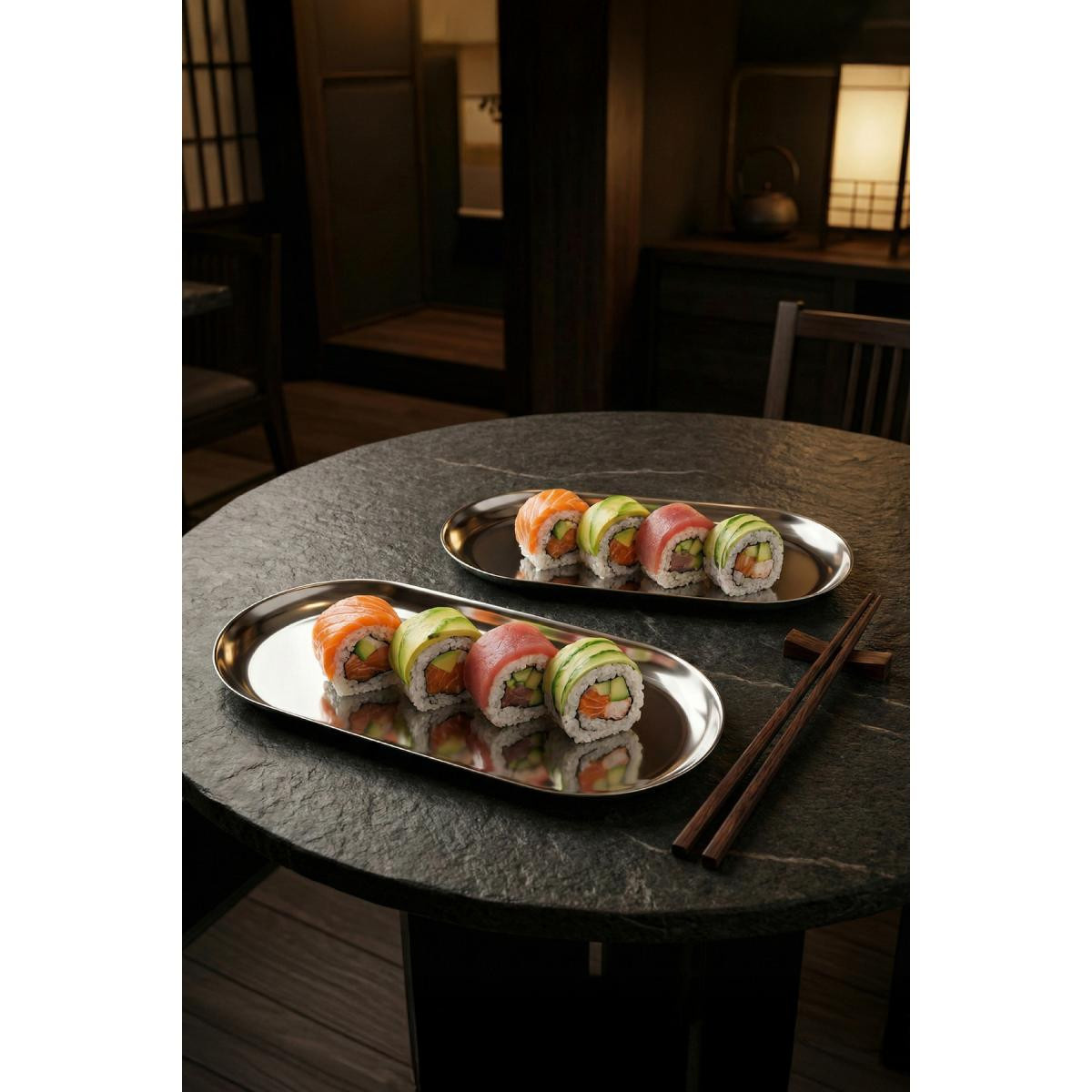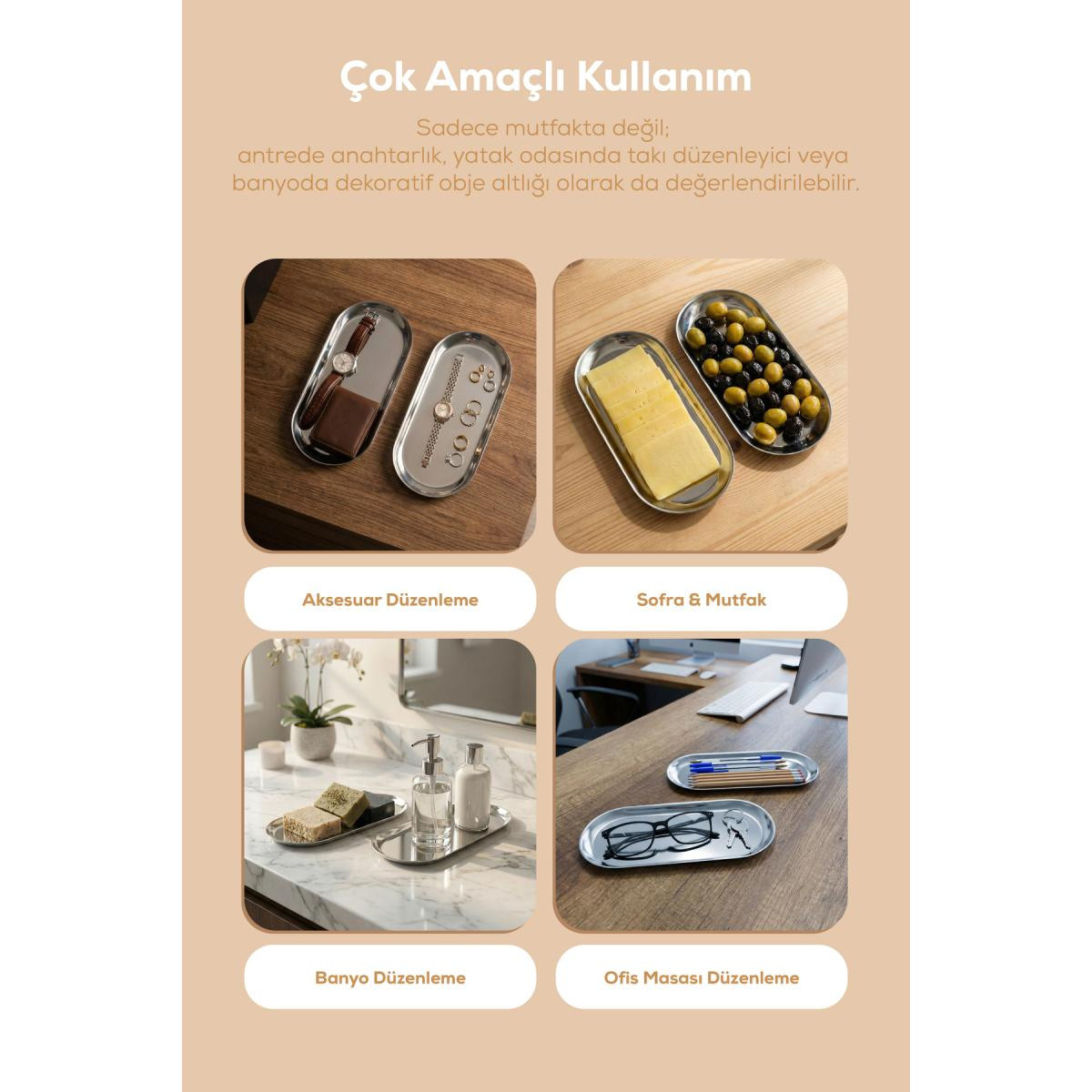 Sofralarınıza ve dekorasyonunuza modern bir dokunuş katmaya hazır mısınız? Minimalist tasarımı ve dayanıklı metal yapısıyla öne çıkan bu 2’li kayık tabak seti, hem şıklığı hem de işlevselliği bir arada sunuyor.; Öne Çıkan Özellikler: İdeal Boyut: 10,3x23,5 cm ölçüleri sayesinde çerez, sos, meze veya küçük atıştırmalıkların sunumu için mükemmeldir.; Dayanıklı Malzeme: Yüksek kaliteli metalden üretilmiştir, darbelere karşı dayanıklıdır ve uzun ömürlü kullanım sağlar.; Zarif Tasarım: Oval kayık formu, sofranıza modern ve estetik bir hava katar.; Çok Amaçlı Kullanım: Sadece mutfakta değil; antrede anahtarlık, yatak odasında takı düzenleyici veya banyoda dekoratif obje altlığı olarak da değerlendirilebilir.; Teknik Detaylar: Paket İçeriği: 2 Adet Büyük Boy Metal Kayık Tabak Ölçü: 10,3x23,5 cm Form: Oval / Kayık Temizlik: Nemli bir bezle silinmesi önerilir.; Uzun süreli kullanım için elde yıkama tavsiye edilir.;
