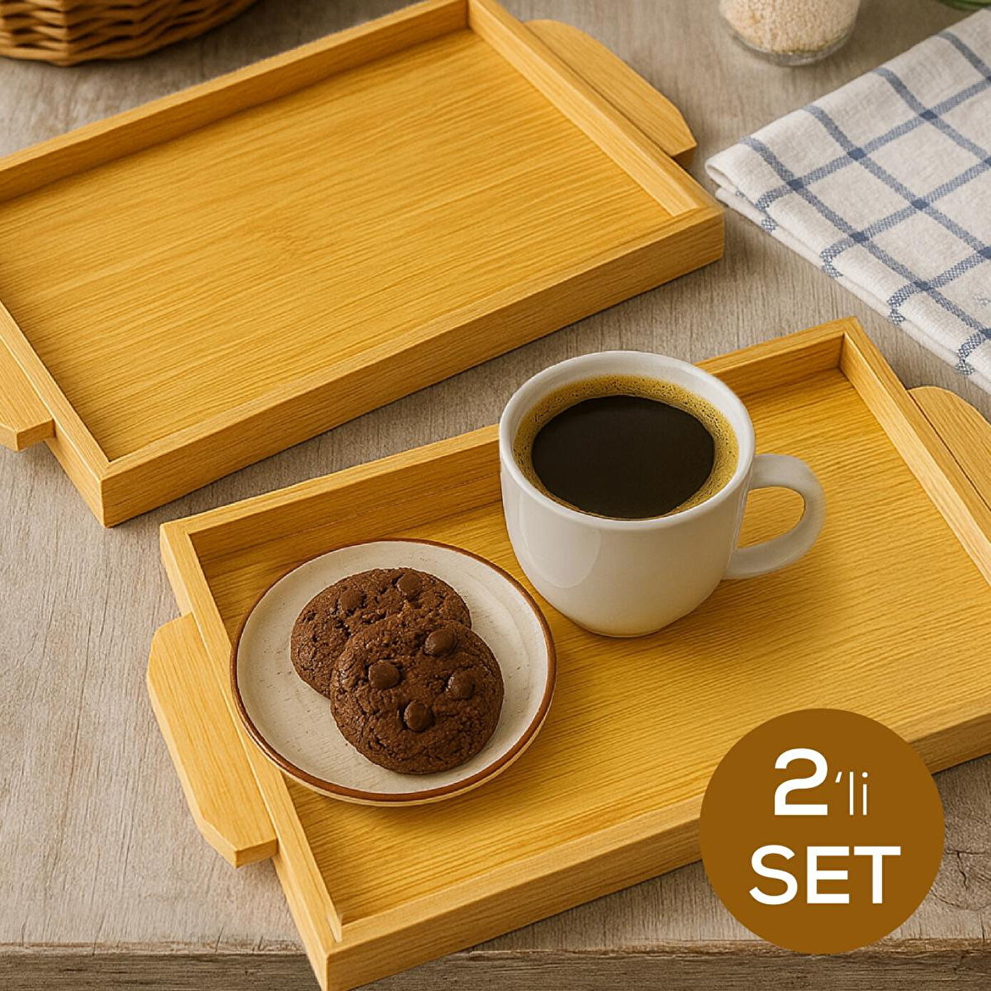 Doğal Bambu 2'li Ahşap Tepsi Seti | 40x30 cm & 35x25 cm | Saplı Sunum Tepsisi Şık ve doğal görünüme sahip bu 2'li bambu ahşap tepsi seti, hem günlük kullanım hem de misafir sunumlarınız için ideal bir tercihtir. Farklı boyutlardaki tepsiler sayesinde servis işlerinizde pratiklik ve estetik bir görünüm bir arada! Ürün Özellikleri: Set İçeriği: 2 adet bambu tepsi Büyük Tepsi Ölçüsü: 40 x 30 x 4 cm Küçük Tepsi Ölçüsü: 35 x 25 x 4 cm Malzeme: Doğal Bambu Kaplama Renk: Doğal ahşap tonları Kulplu Tasarım: Her iki yanında ergonomik taşıma kulpları Kullanım Alanları: Kahvaltı, çay saati, sunum, dekoratif amaçlı kullanım Kolay Temizlik: Nemli bezle silinerek kolayca temizlenir Avantajları: Doğal ve çevre dostu bambu malzeme Dayanıklı ve uzun ömürlü kullanım Estetik görünümüyle sofralara zarif bir dokunuş Farklı boyutlar sayesinde çok amaçlı kullanım imkânı Mutfakta düzeni ve şıklığı bir arada arayanlar için vazgeçilmez bir ürün! Sunumlarınızı tamamlayan bu şık bambu tepsiler, mutfağınıza doğal bir sıcaklık katar.
