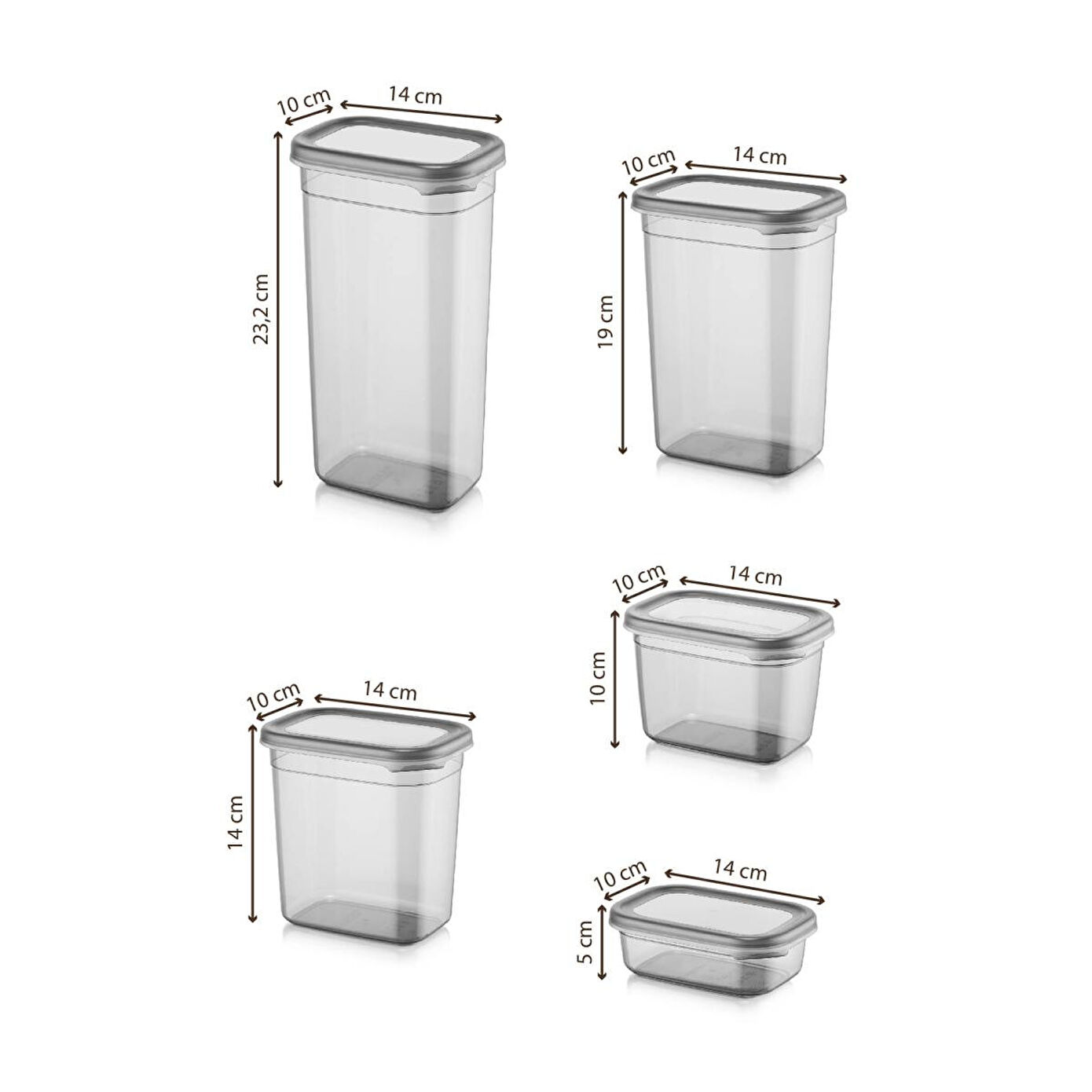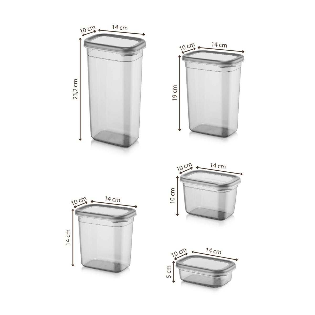 Farklı boyutlarda ve kapasitelerde saklama kapları içeren kullanışlı bir ürün setidir. Bu set, çeşitli amaçlar için yiyeceklerinizi saklamak, taşımak ve korumak için idealdir. ; 1900 ml Saklama Kabı: Bu büyük boyutlu kap, geniş miktardaki yiyecekleri veya malzemeleri saklamak için uygundur. Özellikle büyük aileler veya özel etkinlikler için ideal bir seçenektir. Ürün Ölçüleri: 10x14x23,2 cm ; 1500 ml Saklama Kabı: Orta boy kapasiteye sahip bu kap, günlük kullanım için idealdir. Öğle yemeği, atıştırmalıklar veya hazırlanan yemeklerin saklanması için uygundur. Ürün Ölçüleri: 10x14x19 cm ; 1150 ml Saklama Kabı: Orta boyutta olan bu kap, daha küçük miktarlarda yiyecekleri saklamak veya taşımak için kullanışlıdır. Örneğin, soslar, meyve dilimleri veya peynir gibi malzemeler için uygundur. Ürün Ölçüleri:10x14x14 cm ; 800 ml Saklama Kabı: Orta-küçük boyutlu bu kap, tek kişilik yemeklerin veya öğle atıştırmalıklarının saklanması için uygundur. Pratik taşıma için ideal boyutta bir seçenektir. Ürün Ölçüleri: 10x14x10 cm ; 400 ml Saklama Kabı: Küçük boyutlu bu kap, soslar, baharatlar veya küçük parçaları saklamak için idealdir. Seyahatlerde veya çantanızda kolayca taşıyabilirsiniz. Ürün Ölçüleri: 10x14x5 cm ; Erzak Saklama Kabı Seti, sağlam ve dayanıklı plastik malzemeden üretilmiştir. Kapakları sıkıca kapanır, böylece yiyecekleriniz temiz bir şekilde muhafaza olur. Set içindeki farklı boyutlardaki kaplar, çeşitli ihtiyaçlarınıza uyum sağlamak için tasarlanmıştır. Mutfakta düzen sağlamak, yiyeceklerinizi organize etmek için bu seti kullanabilirsiniz.