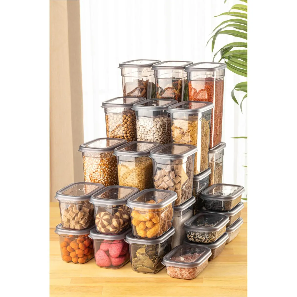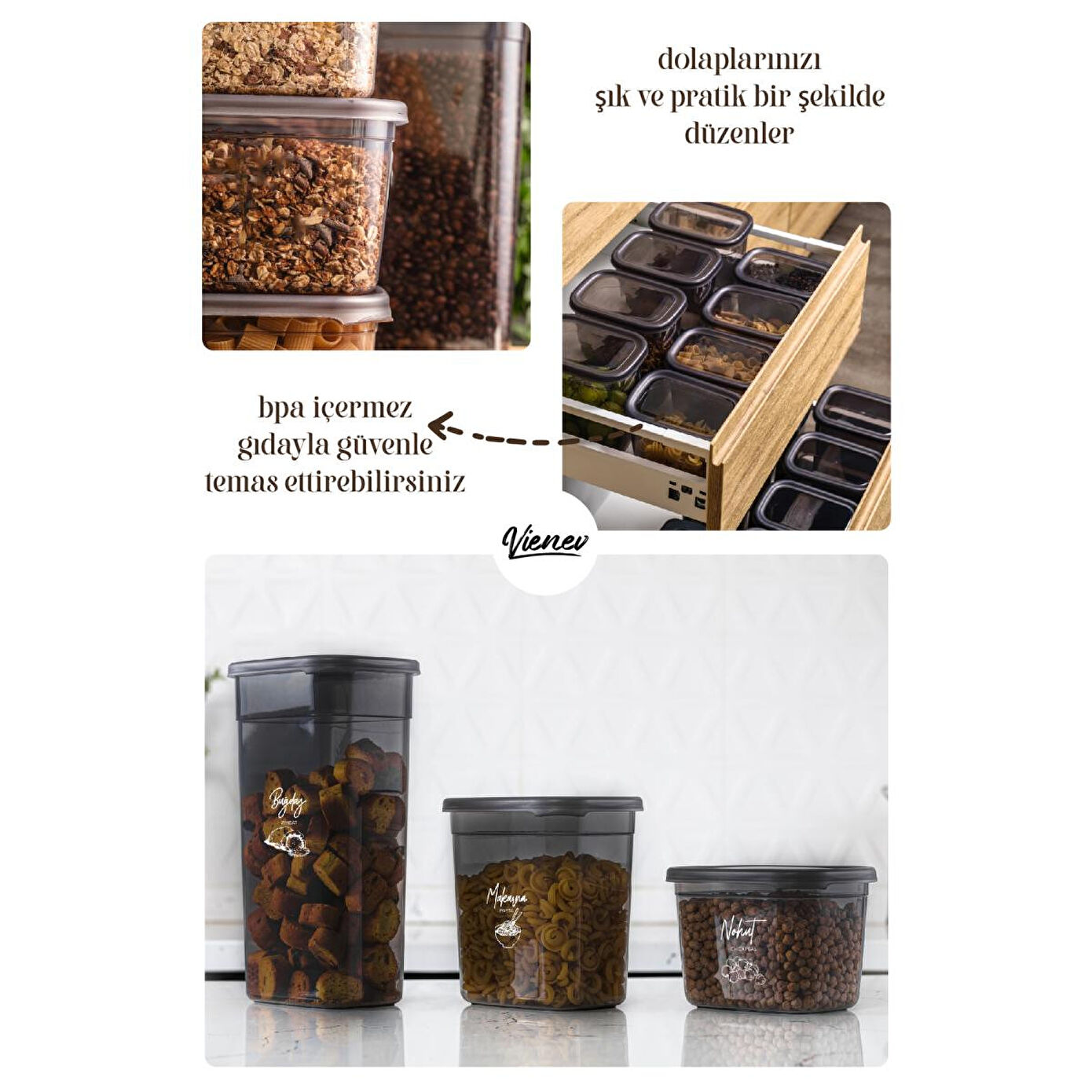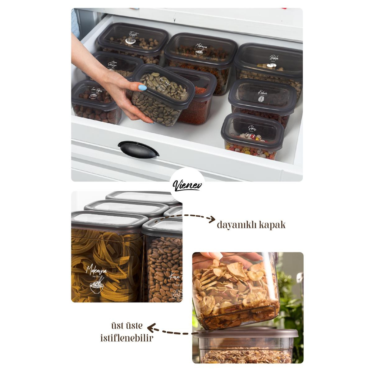 Farklı boyutlarda ve kapasitelerde saklama kapları içeren kullanışlı bir ürün setidir. Bu set, çeşitli amaçlar için yiyeceklerinizi saklamak, taşımak ve korumak için idealdir. ; 1900 ml Saklama Kabı: Bu büyük boyutlu kap, geniş miktardaki yiyecekleri veya malzemeleri saklamak için uygundur. Özellikle büyük aileler veya özel etkinlikler için ideal bir seçenektir. Ürün Ölçüleri: 10x14x23,2 cm ; 1500 ml Saklama Kabı: Orta boy kapasiteye sahip bu kap, günlük kullanım için idealdir. Öğle yemeği, atıştırmalıklar veya hazırlanan yemeklerin saklanması için uygundur. Ürün Ölçüleri: 10x14x19 cm ; 1150 ml Saklama Kabı: Orta boyutta olan bu kap, daha küçük miktarlarda yiyecekleri saklamak veya taşımak için kullanışlıdır. Örneğin, soslar, meyve dilimleri veya peynir gibi malzemeler için uygundur. Ürün Ölçüleri:10x14x14 cm ; 800 ml Saklama Kabı: Orta-küçük boyutlu bu kap, tek kişilik yemeklerin veya öğle atıştırmalıklarının saklanması için uygundur. Pratik taşıma için ideal boyutta bir seçenektir. Ürün Ölçüleri: 10x14x10 cm ; 400 ml Saklama Kabı: Küçük boyutlu bu kap, soslar, baharatlar veya küçük parçaları saklamak için idealdir. Seyahatlerde veya çantanızda kolayca taşıyabilirsiniz. Ürün Ölçüleri: 10x14x5 cm ; sErzak Saklama Kabı Seti, sağlam ve dayanıklı plastik malzemeden üretilmiştir. Kapakları sıkıca kapanır, böylece yiyecekleriniz temiz bir şekilde muhafaza olur. Set içindeki farklı boyutlardaki kaplar, çeşitli ihtiyaçlarınıza uyum sağlamak için tasarlanmıştır. Mutfakta düzen sağlamak, yiyeceklerinizi organize etmek için bu seti kullanabilirsiniz. ;